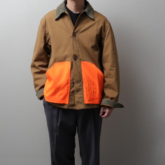 アメリカの老舗ハンティングウェアメーカー・ダックスバックのジャケット。 ファッションでなく、実用向けに作られたもので、ウール素材のブレイズオレンジはハンターカラーと言われ人間同士の誤射を防ぐために用いられています。 ハンドウォームポケットには銃弾収納が付属、背面にはゲームポケットと言われる捕らえた獲物を収納する大きな袋が付いています。 幸いこちらは実用で使われた形跡のないきれいな状態。 シルエットはもちろん、帆布とコーデュロイ、ブラウンとブレイズオレンジの組み合わせが ファッション的に格好良く、エッジの利き加減も着ていて楽しいです。 【size】 着丈:67.0cm 身幅:58.5cm 肩幅:50.5cm 袖丈:62.0cm ※M~Lサイズ相当 表記サイズ:L(US) ※model: 約170cm/55~60kg 【color】Brown 【material】 cotton/polyester と推定 【condition】B S:デットストック、未使用品 A:着用感の少ない綺麗な状態 B:着用されているが比較的綺麗な印象の状態 C:着用には支障ない程度と捉える状態 D:考慮する多少のダメージやシミがある状態 E:ジャンクコンディション 状態やサイズ感、色味、生地感など、「ショップに質問する」よりお気軽にご質問ください。 翌日中を目途に回答させていただきます。 ※注意事項 ・本商品は古着であり、その中でも状態の良いものを揃えるよう拘っておりますが、 使用感は必ずございます(程度は異なります)。 経年変化により新品の商品やUSED加工が施された商品にはない古着特有の表情が見られることがありますが、それも1点ものの古着ならではの魅力としてお楽しみください。 ・採寸は全て平置きの状態で計測しています。1~2cm程の計測誤差は許容範囲とさせて頂きます。 ・製造年代についてはタグや縫製、生地、ボタン、ジップ等の付属品など情報をもとに 判断しておりますが、所感も含まれあくまで目安でありますことご了承くださいませ。 ・他サイトに掲載してるケースもあり、システムの都合上、稀に売れ違いのご連絡を差し上げる場合がございます。ご理解賜りますようお願い申し上げます。