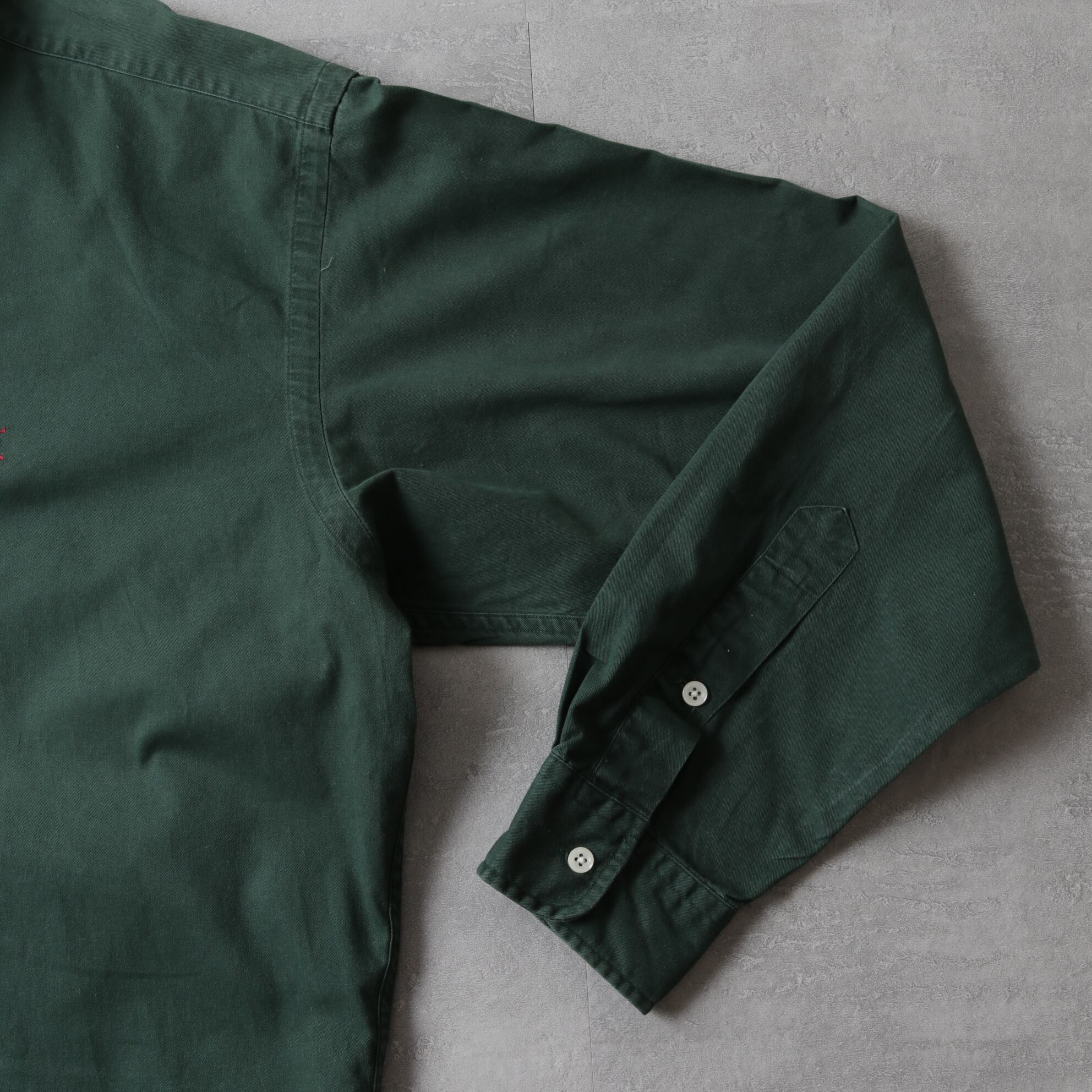 タフなコットンツイルのフォレストグリーンボディにレッドポニー◎