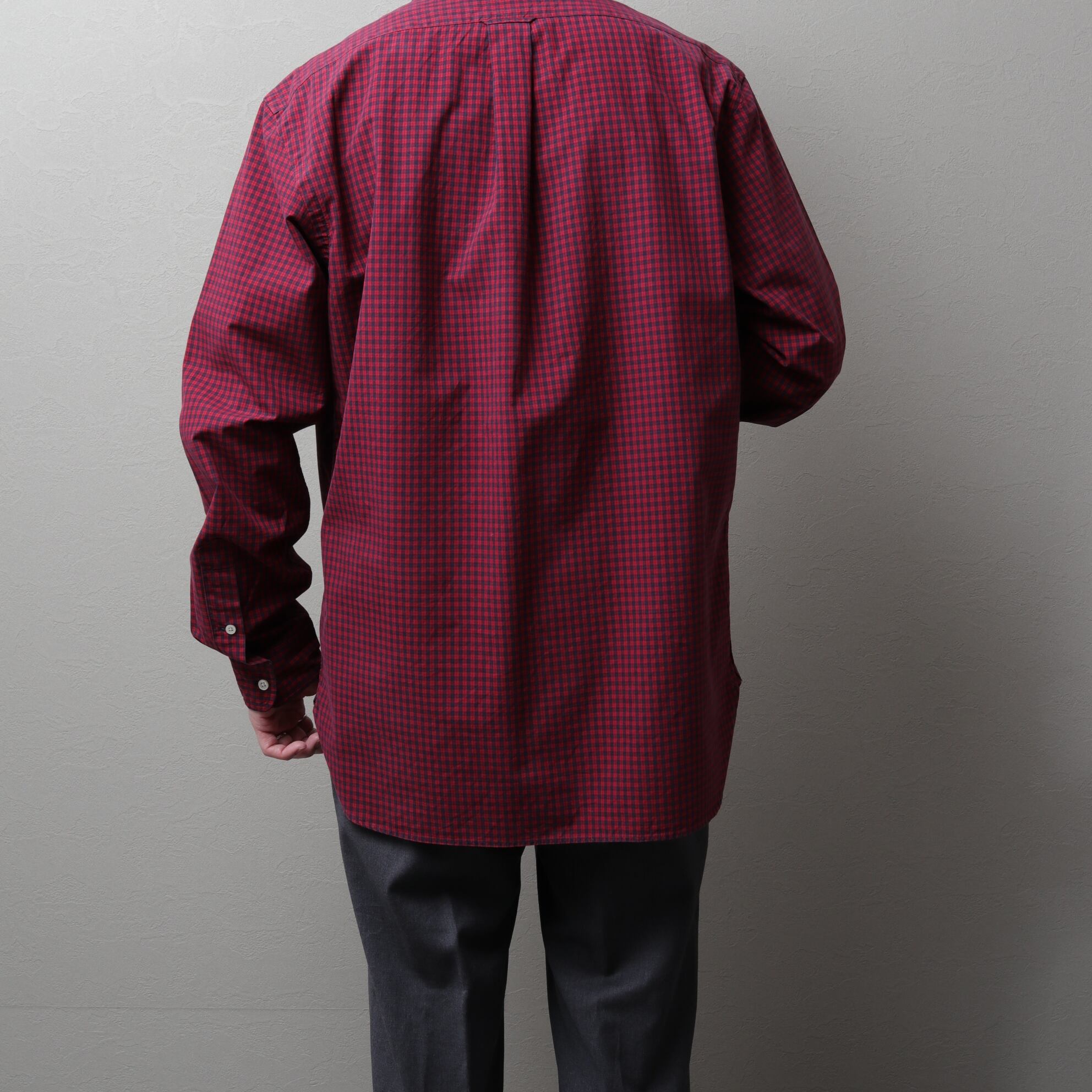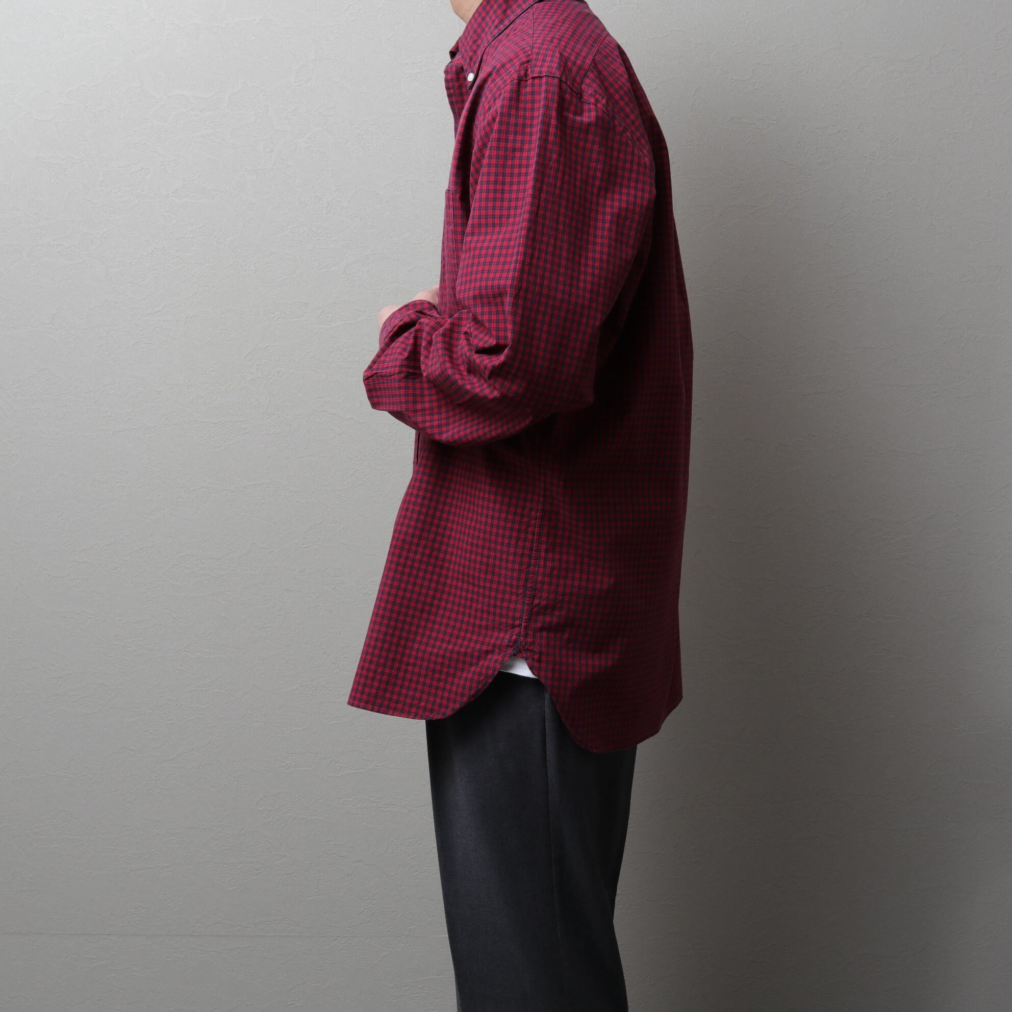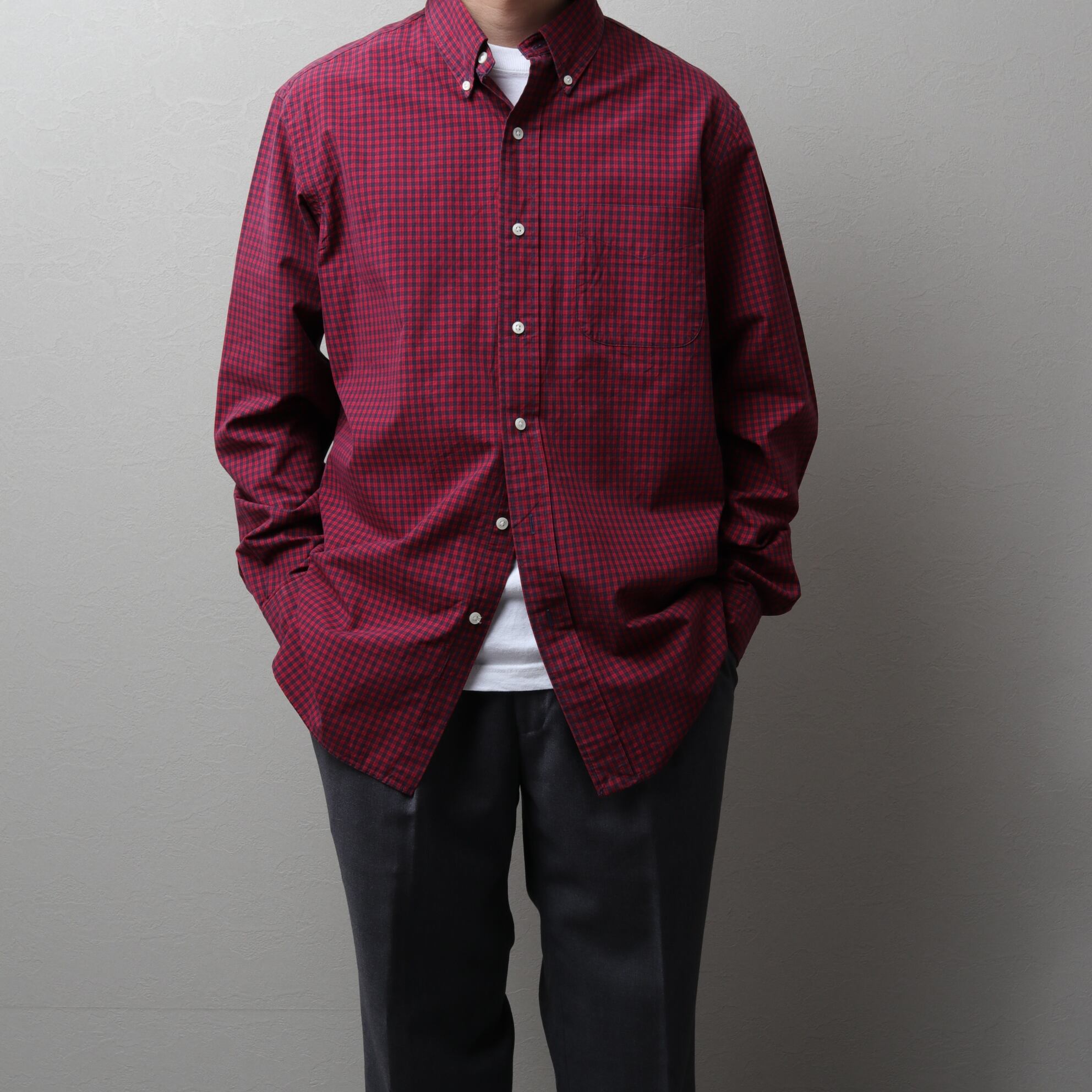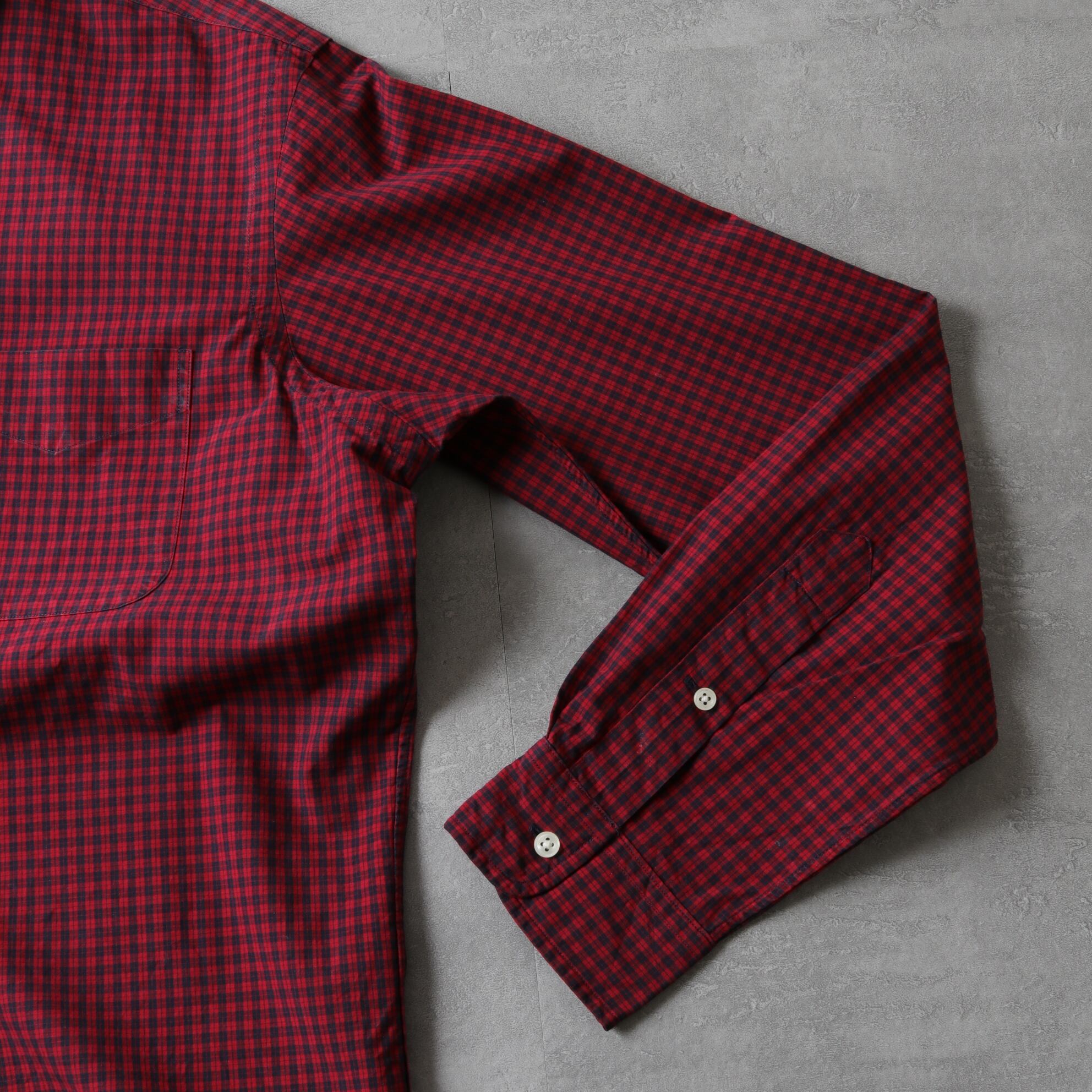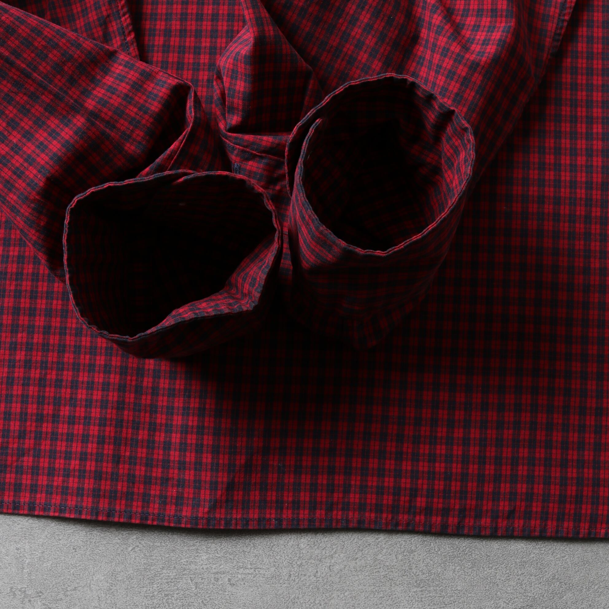 軽くドライなポプリン生地にレッド、ネイビーのカラーリング。