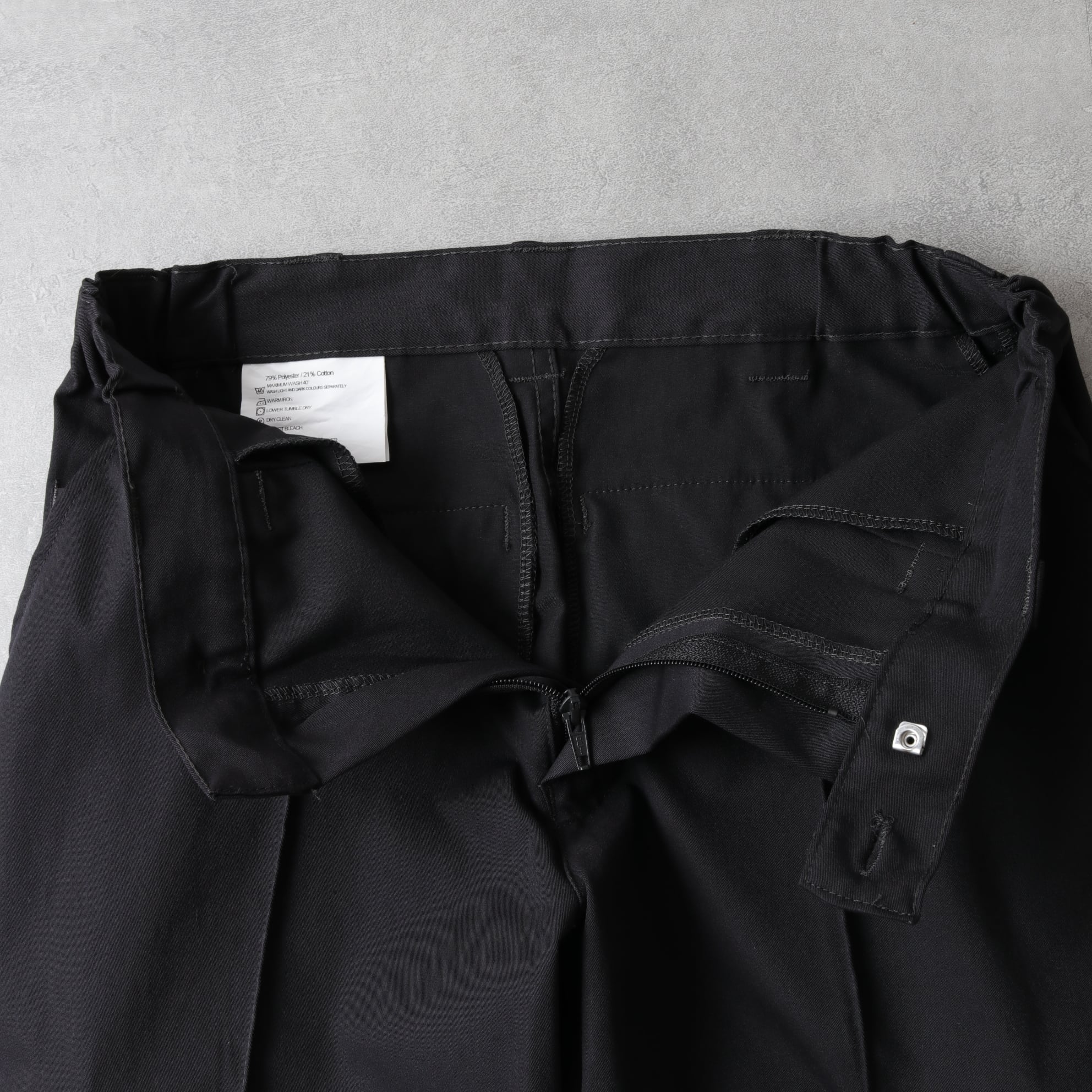 幅広い気温に対応したポリコットンの光沢ある生地にセンタークリースが入るストレートシルエット。