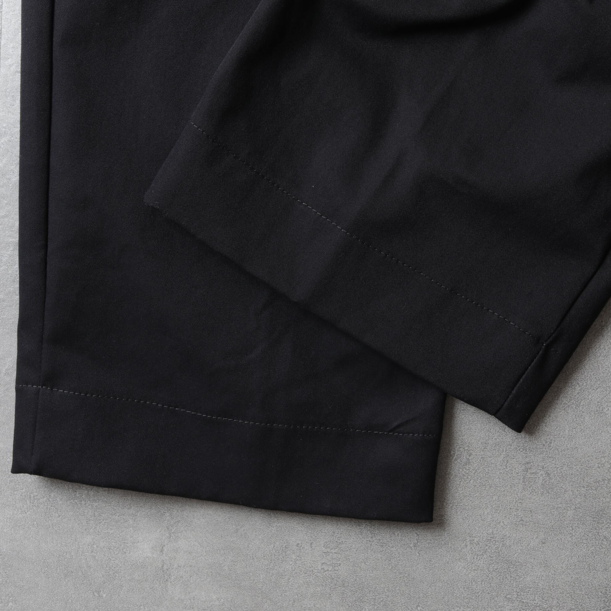 幅広い気温に対応したポリコットンの光沢ある生地にセンタークリースが入るストレートシルエット。