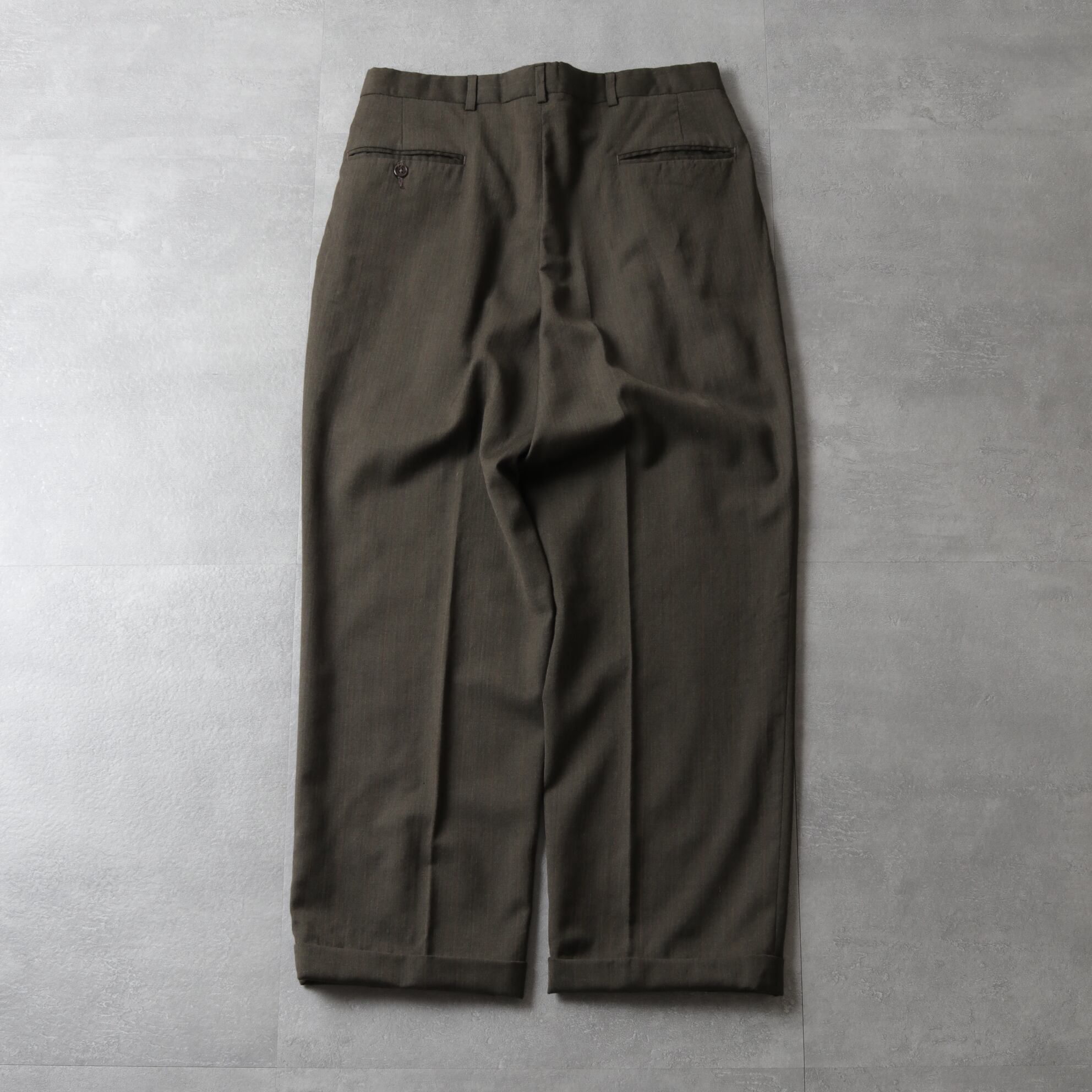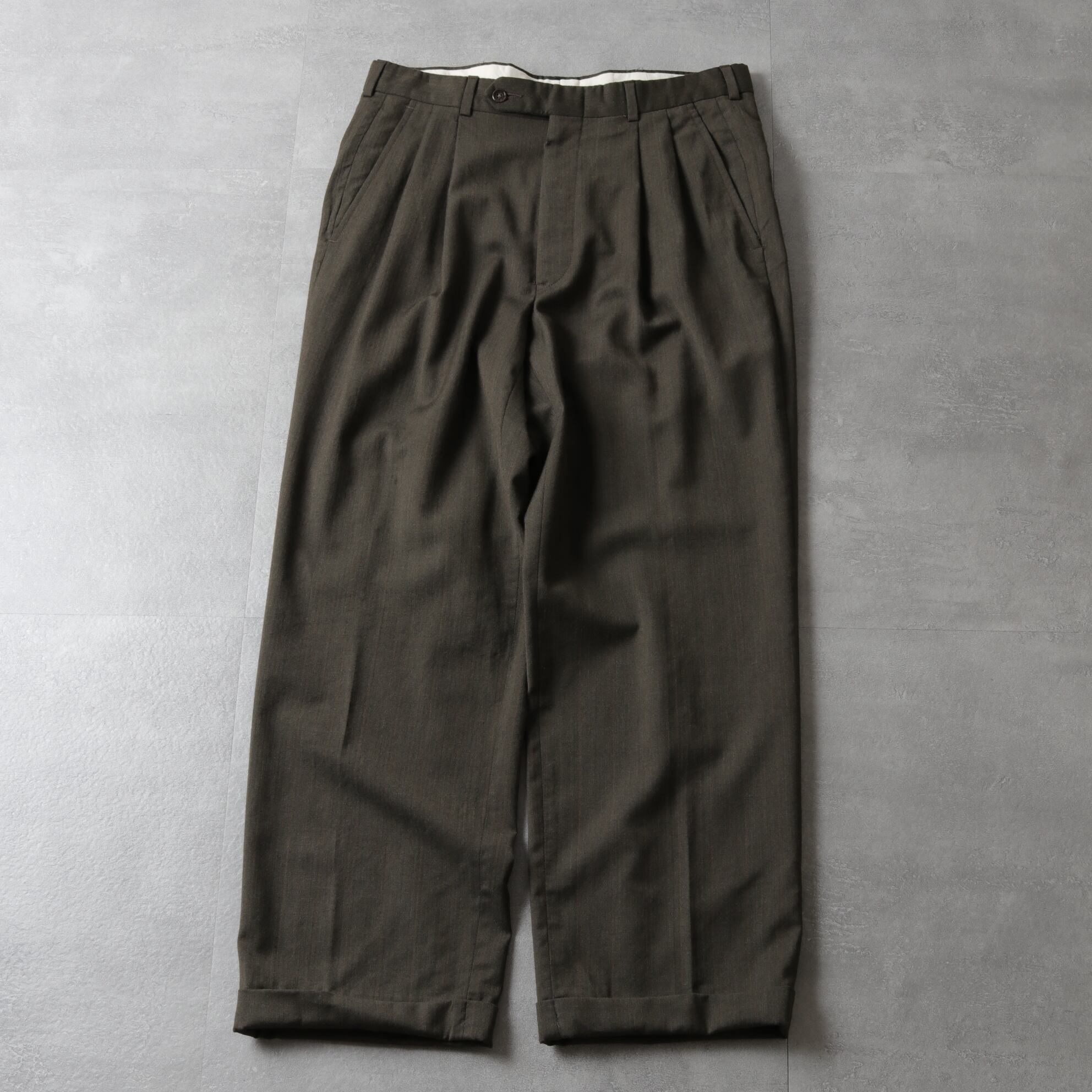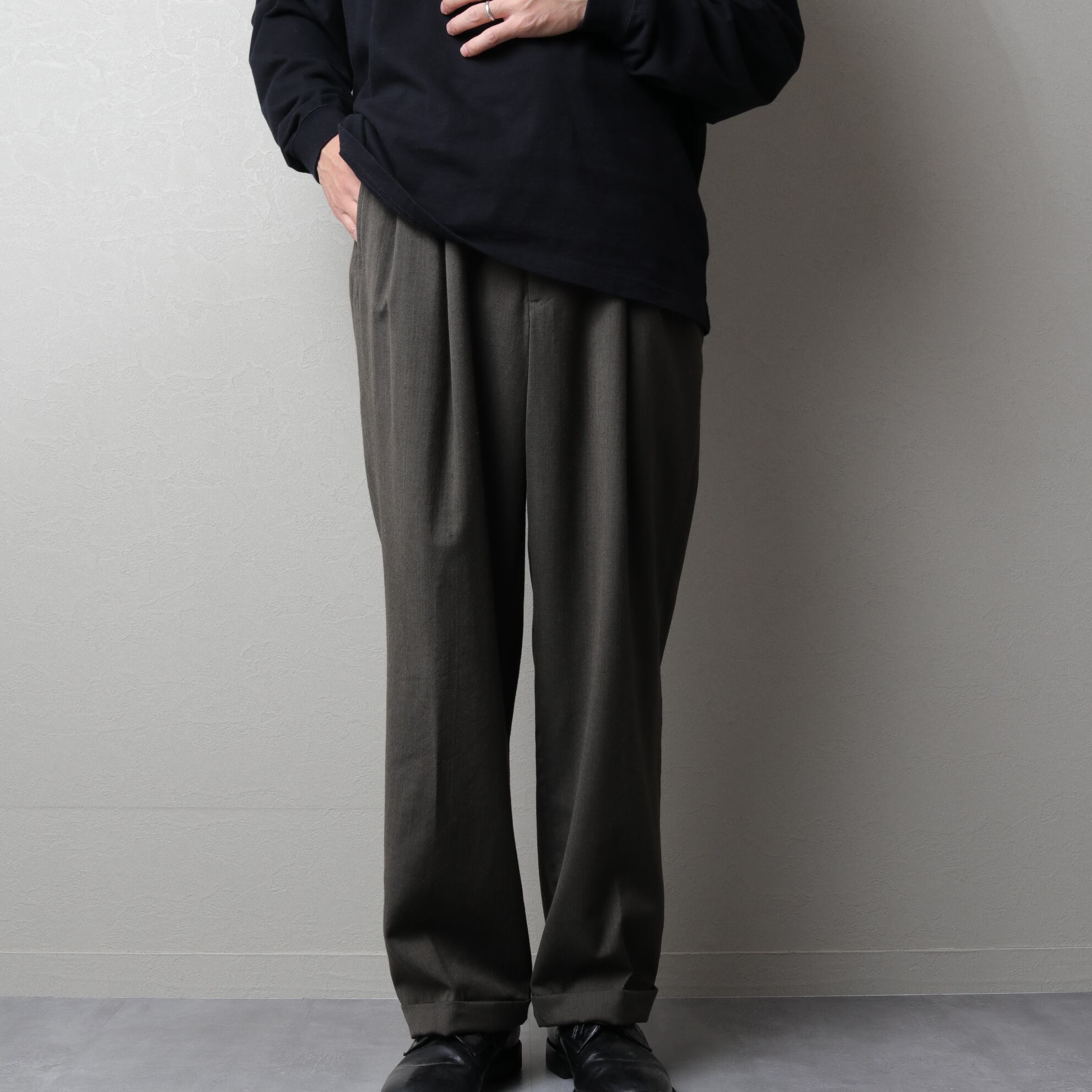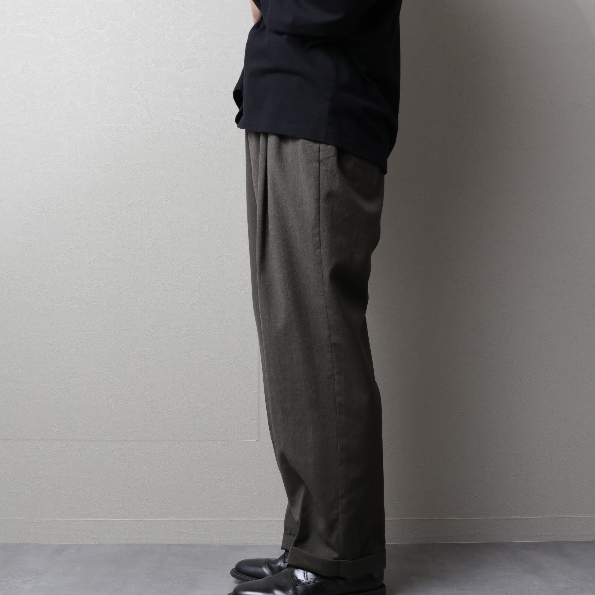 ウエストに2タックが入り太さのあるシルエットに裾はダブル仕上げ。
