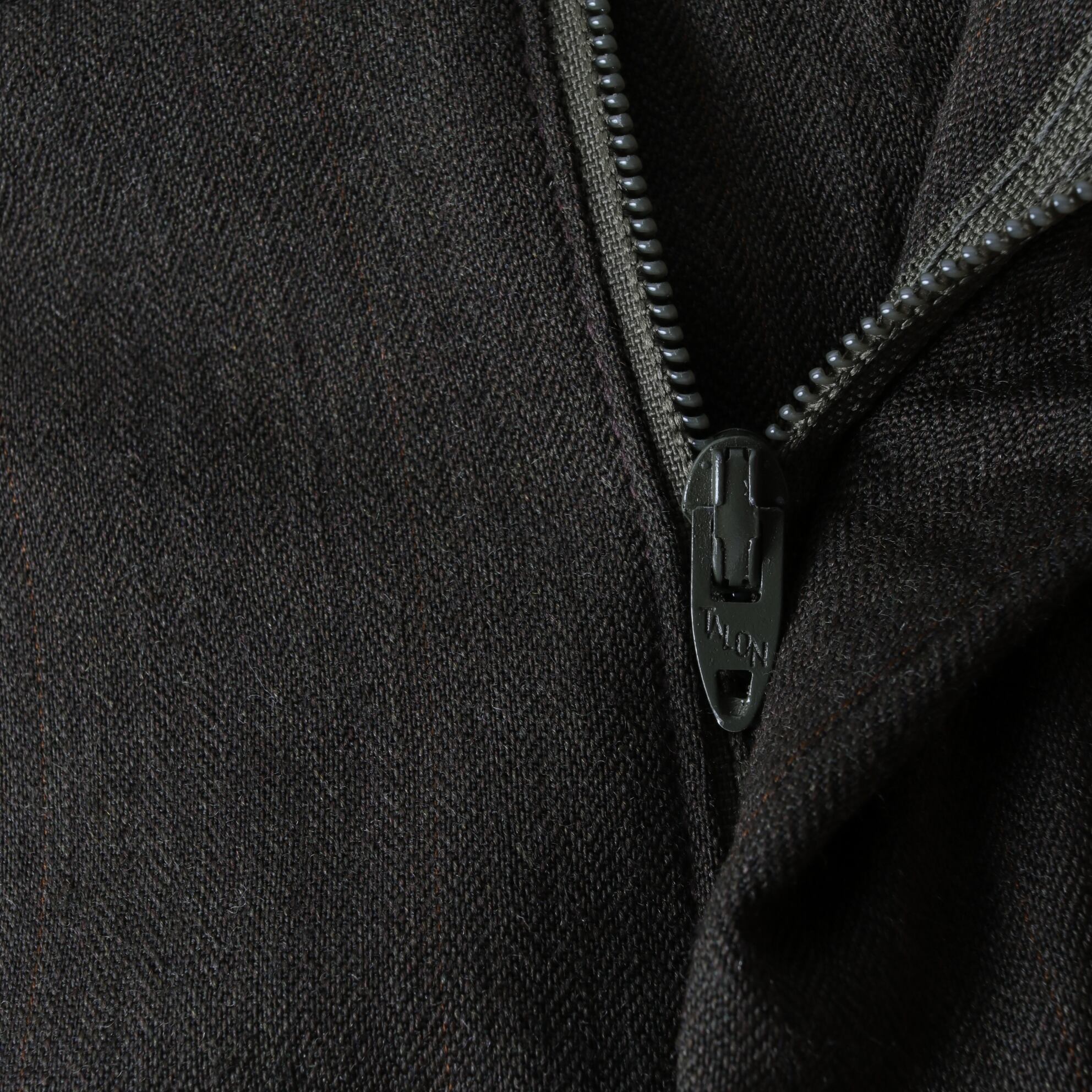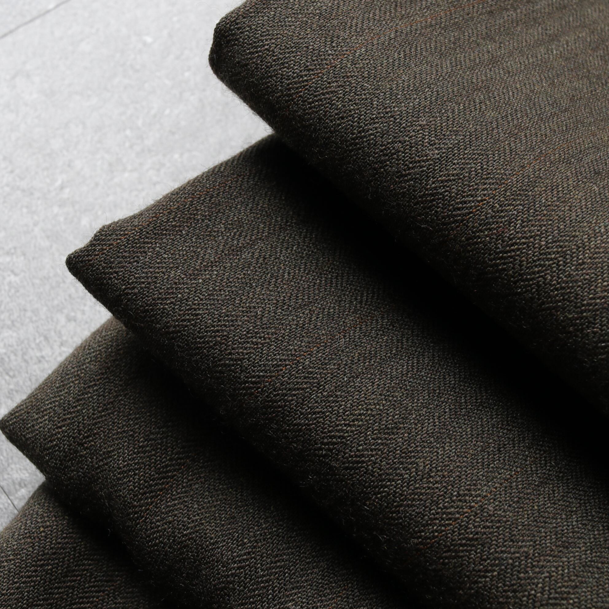 ヘリンボーン織のウール素材。ブラウンに薄っすらオレンジの糸が入る生地。