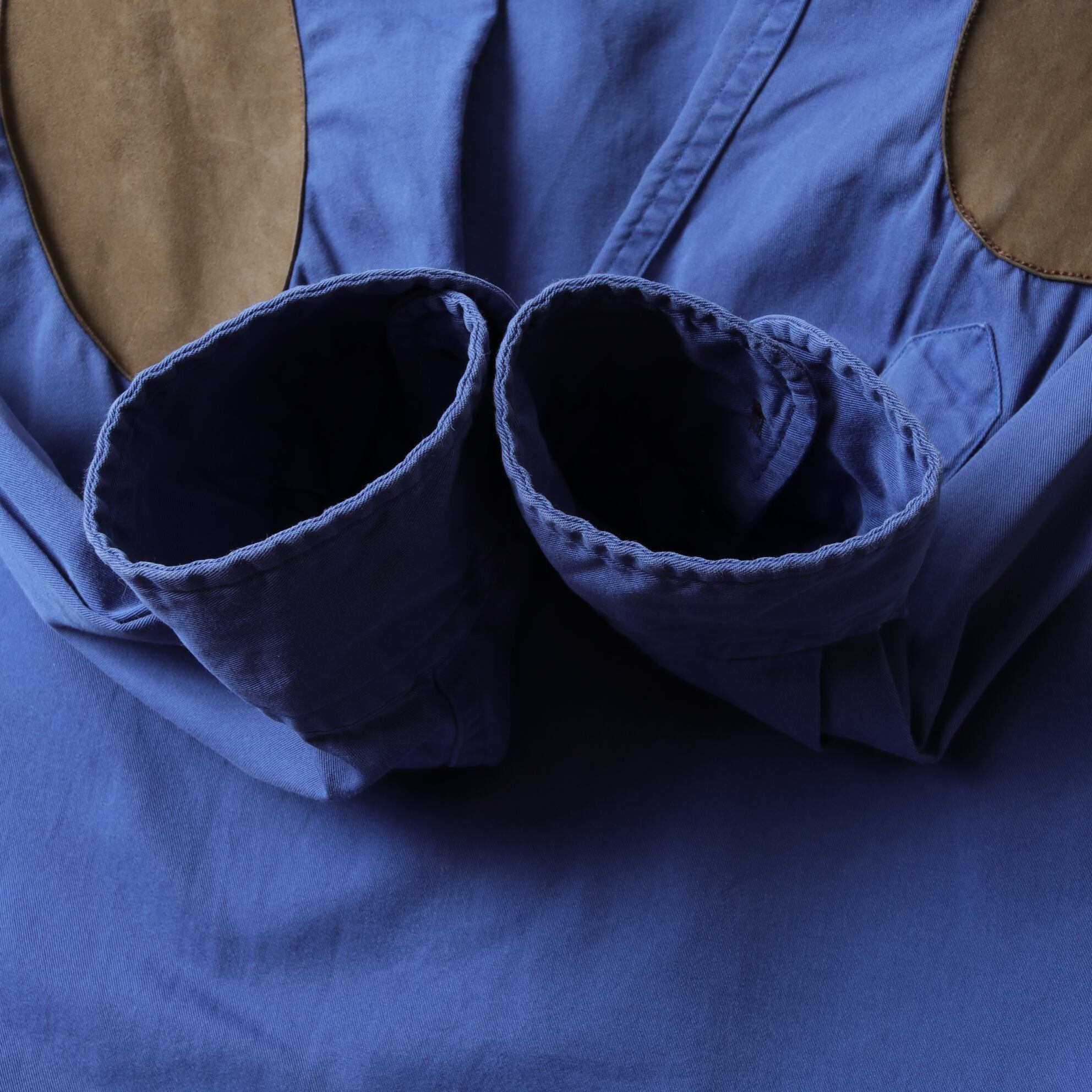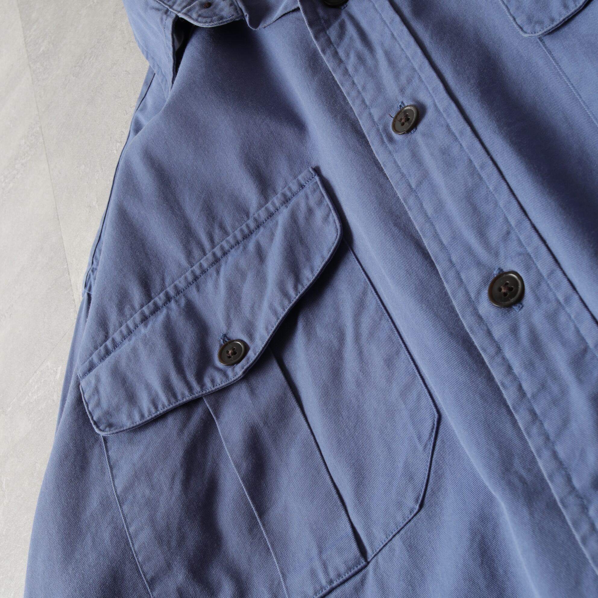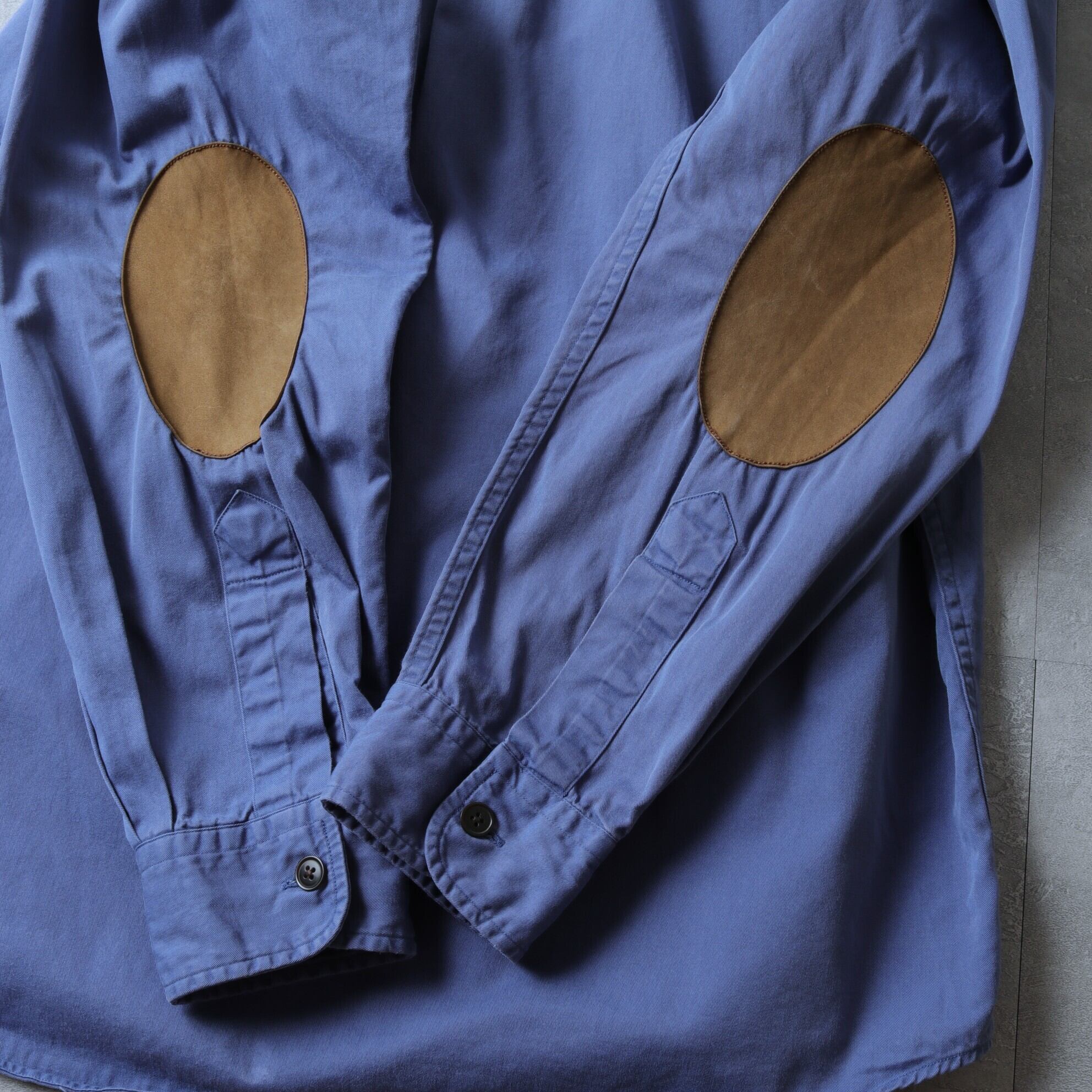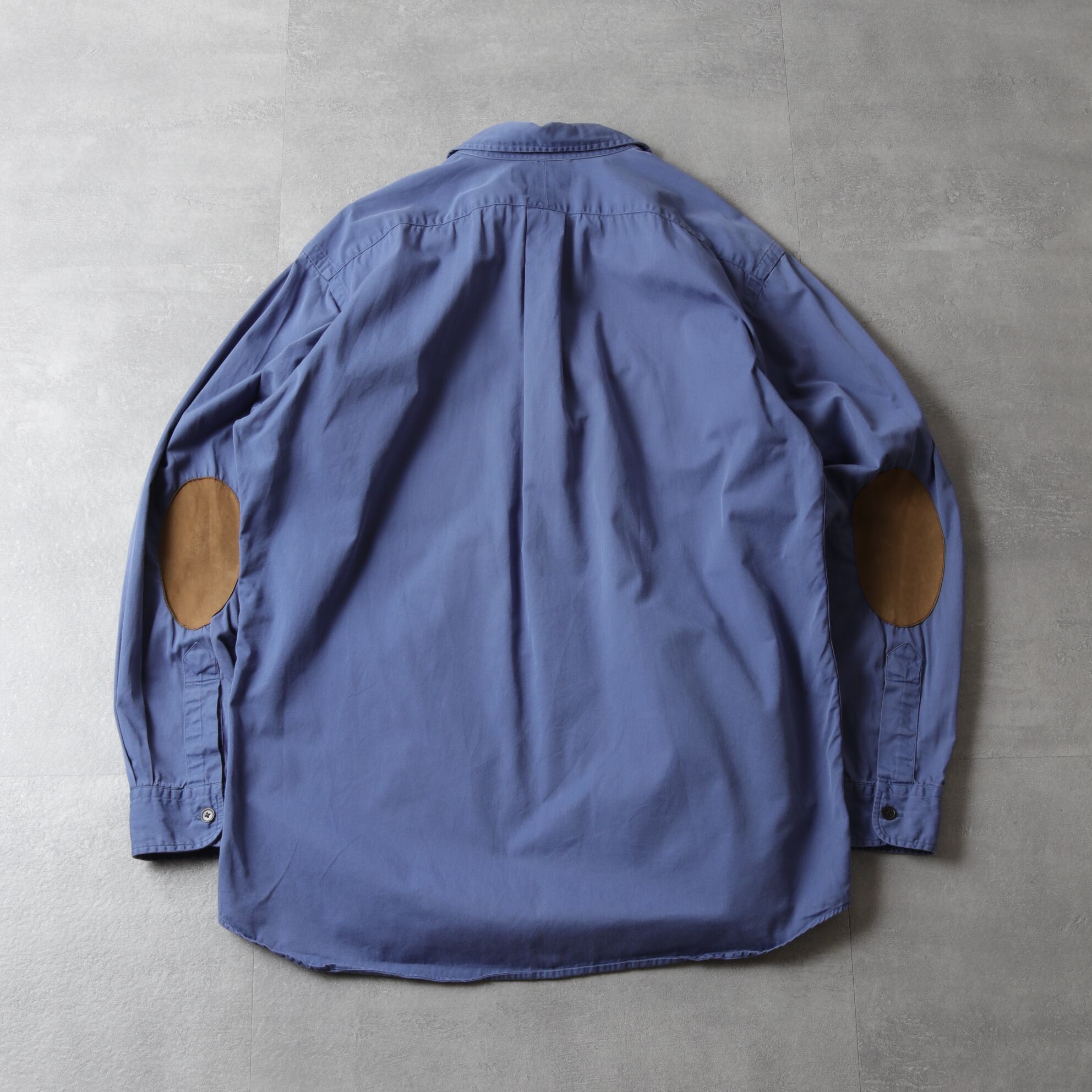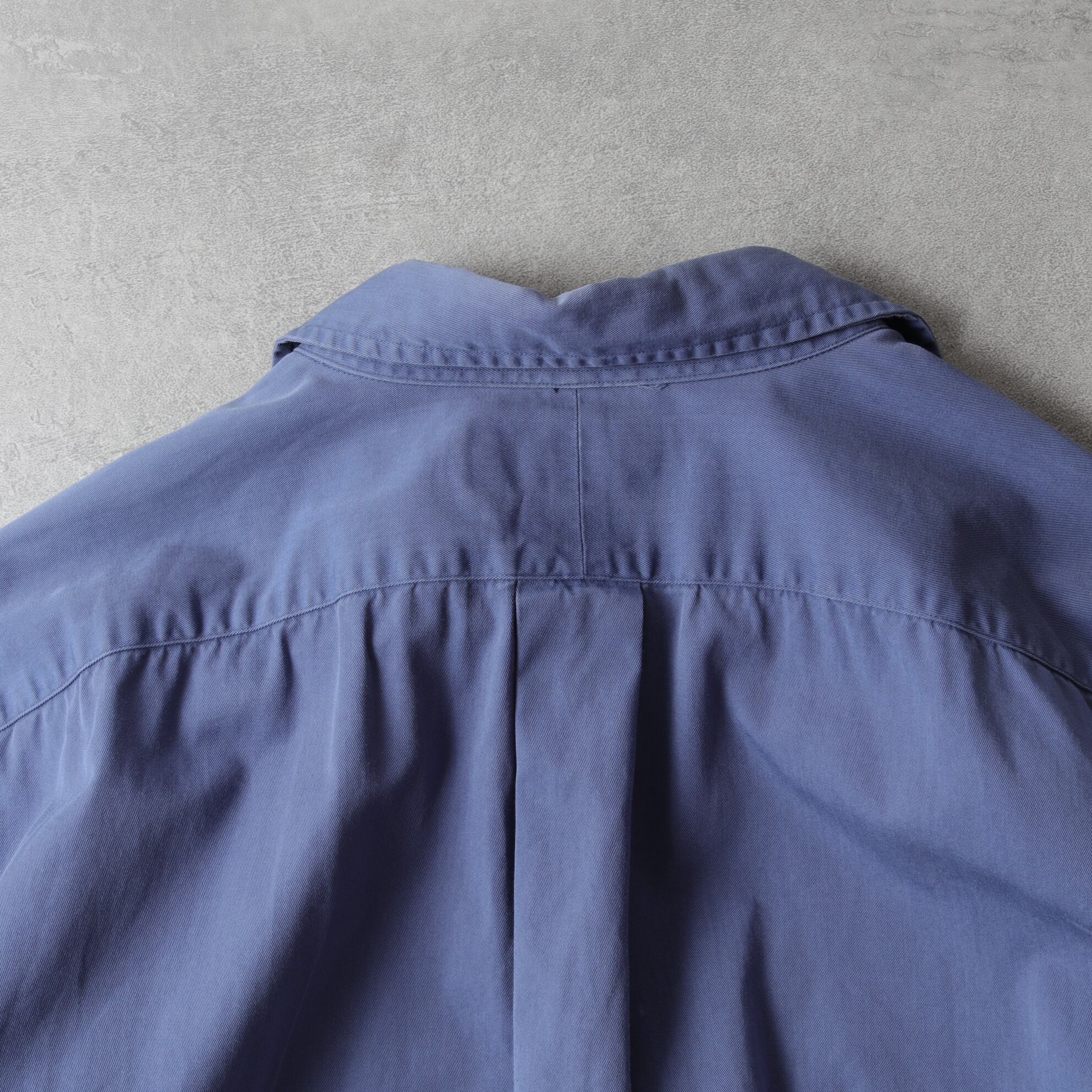 襟はボタンダウンでなく、レギュラーカラー。そしてくすんだブルーが絶妙です。