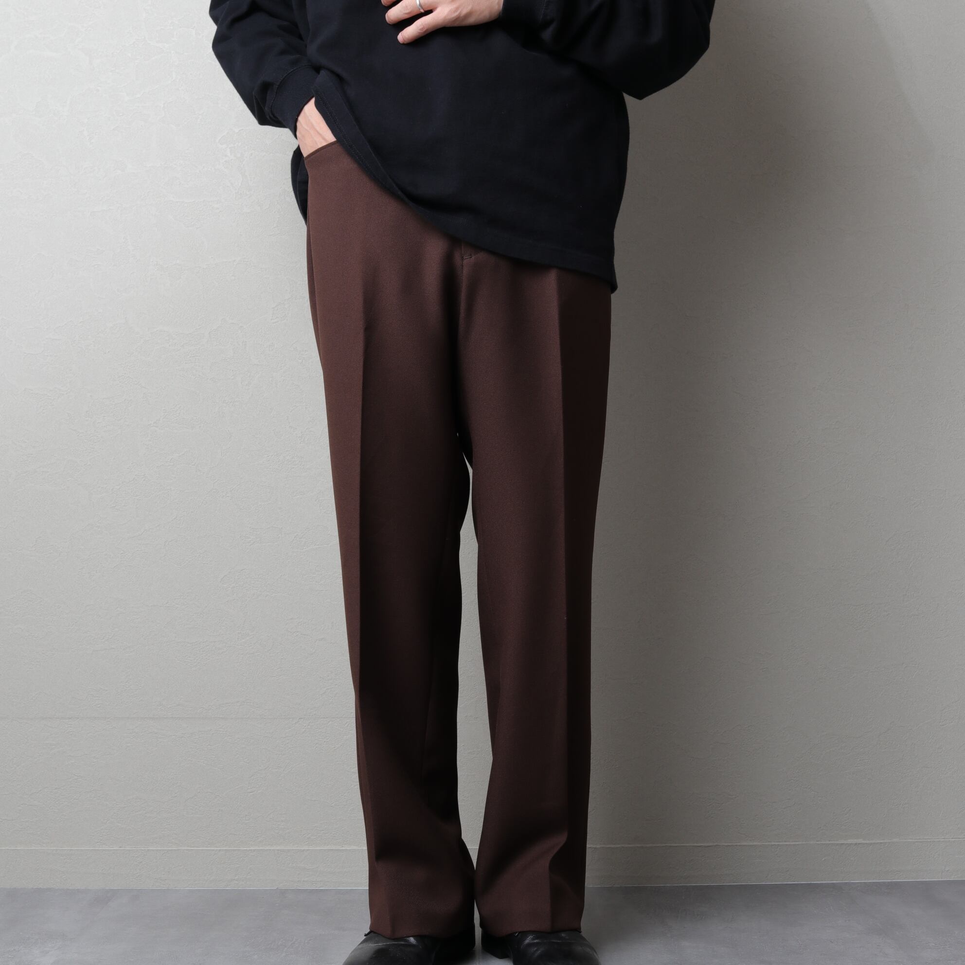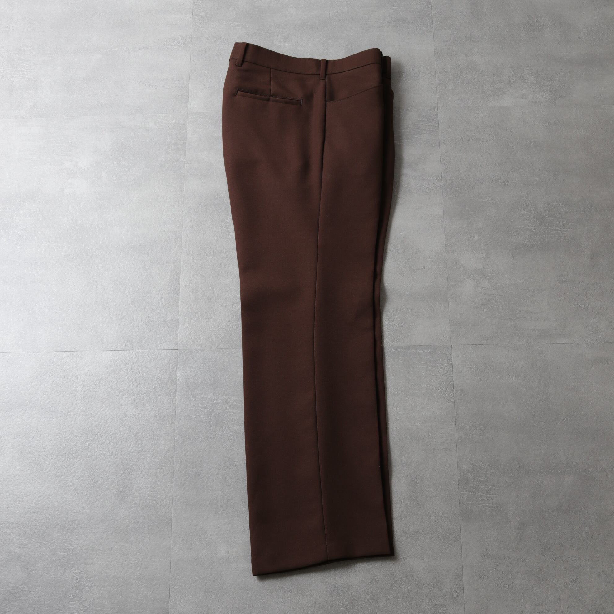 シワになりにくく、ケアしやすい、かつ通年穿けるポリ素材のパンツ。