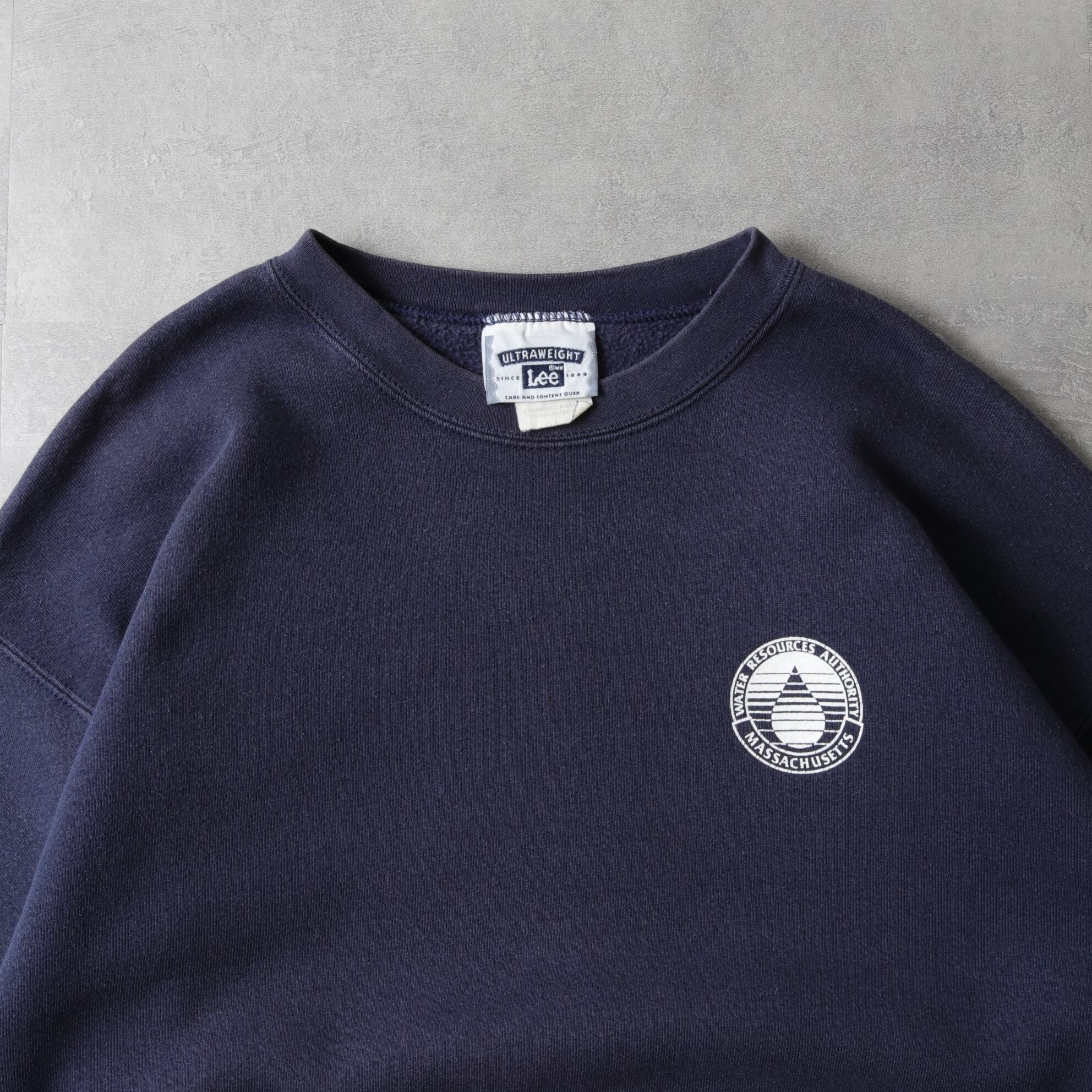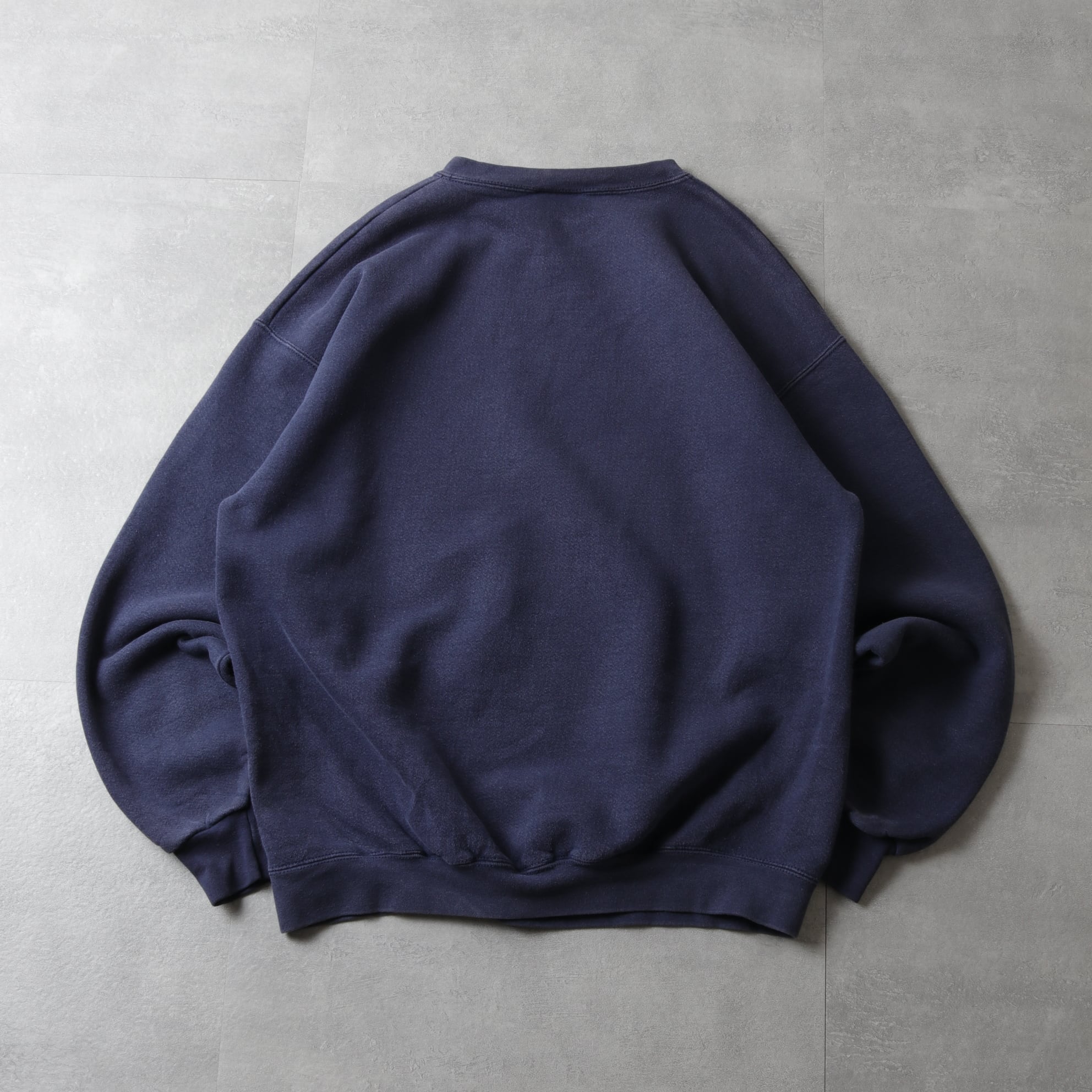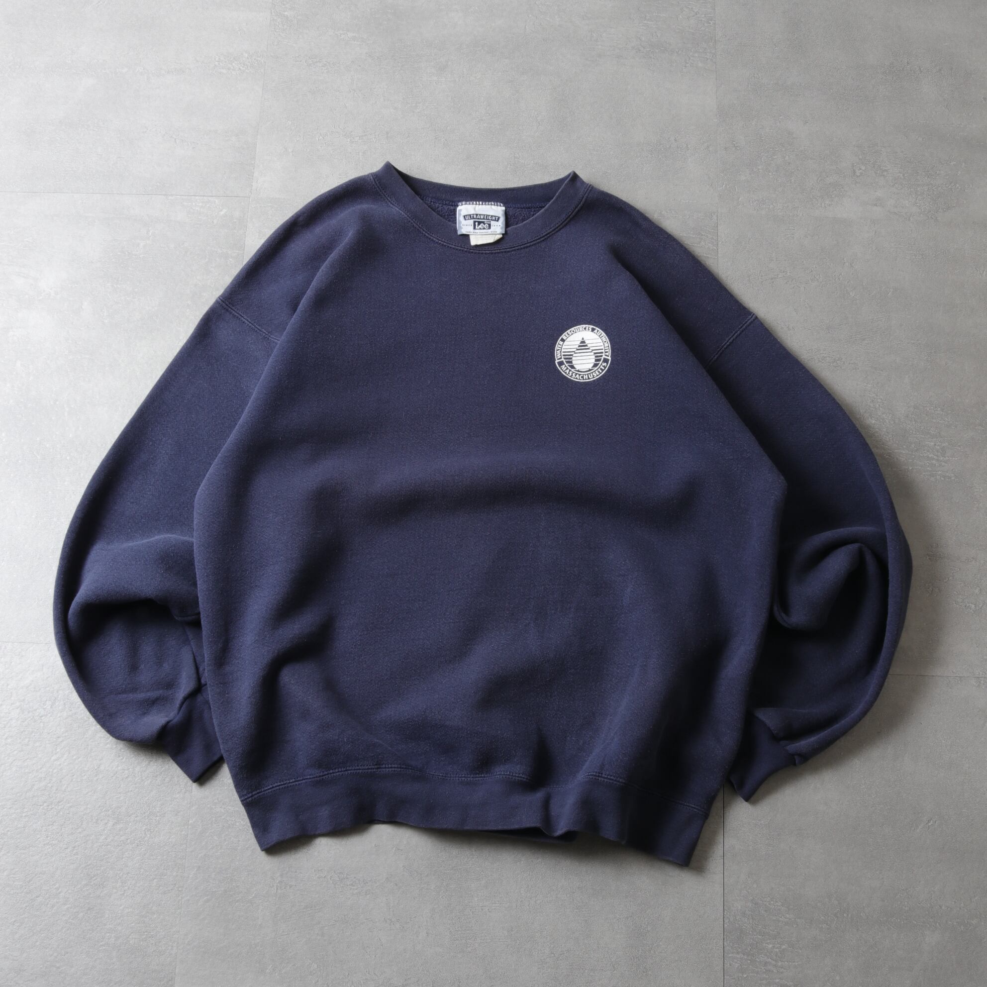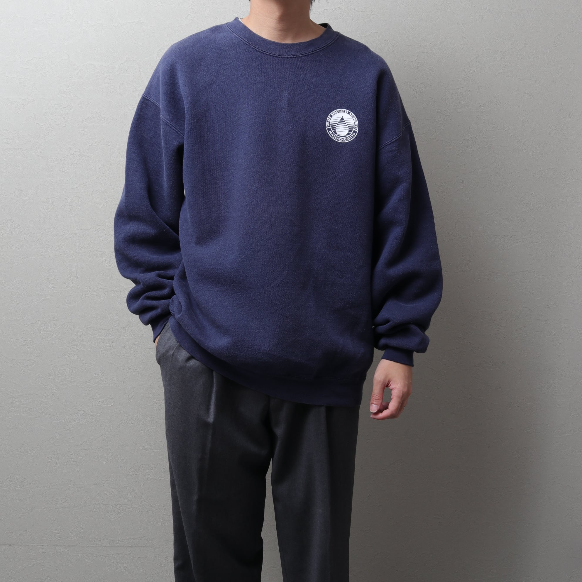 シンプルなスウェットながらフェードネイビーの色味と水をあしらった単色デザインが良いバランス。