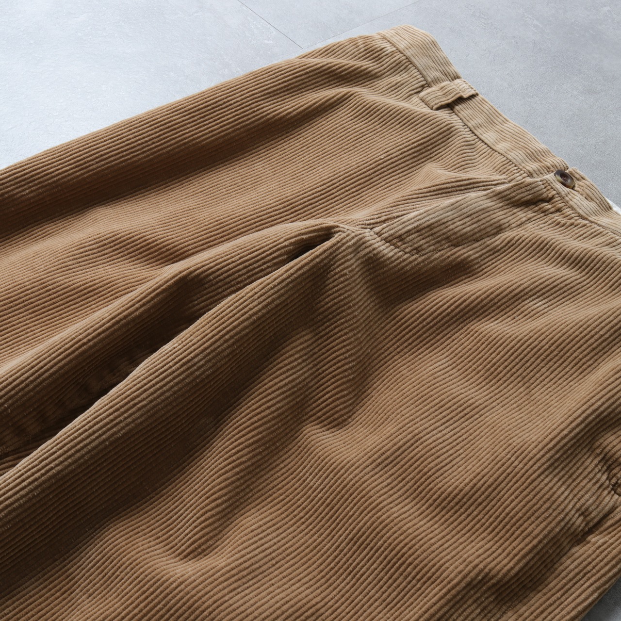 クラシックな太畝コーデュロイとバックのフラップポケット。