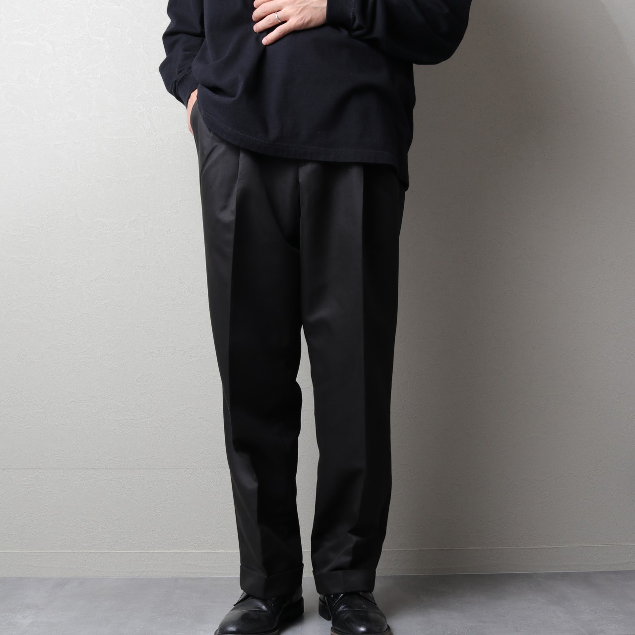 ウエストにアウトタックが入るゆとりあるストレートシルエットです。