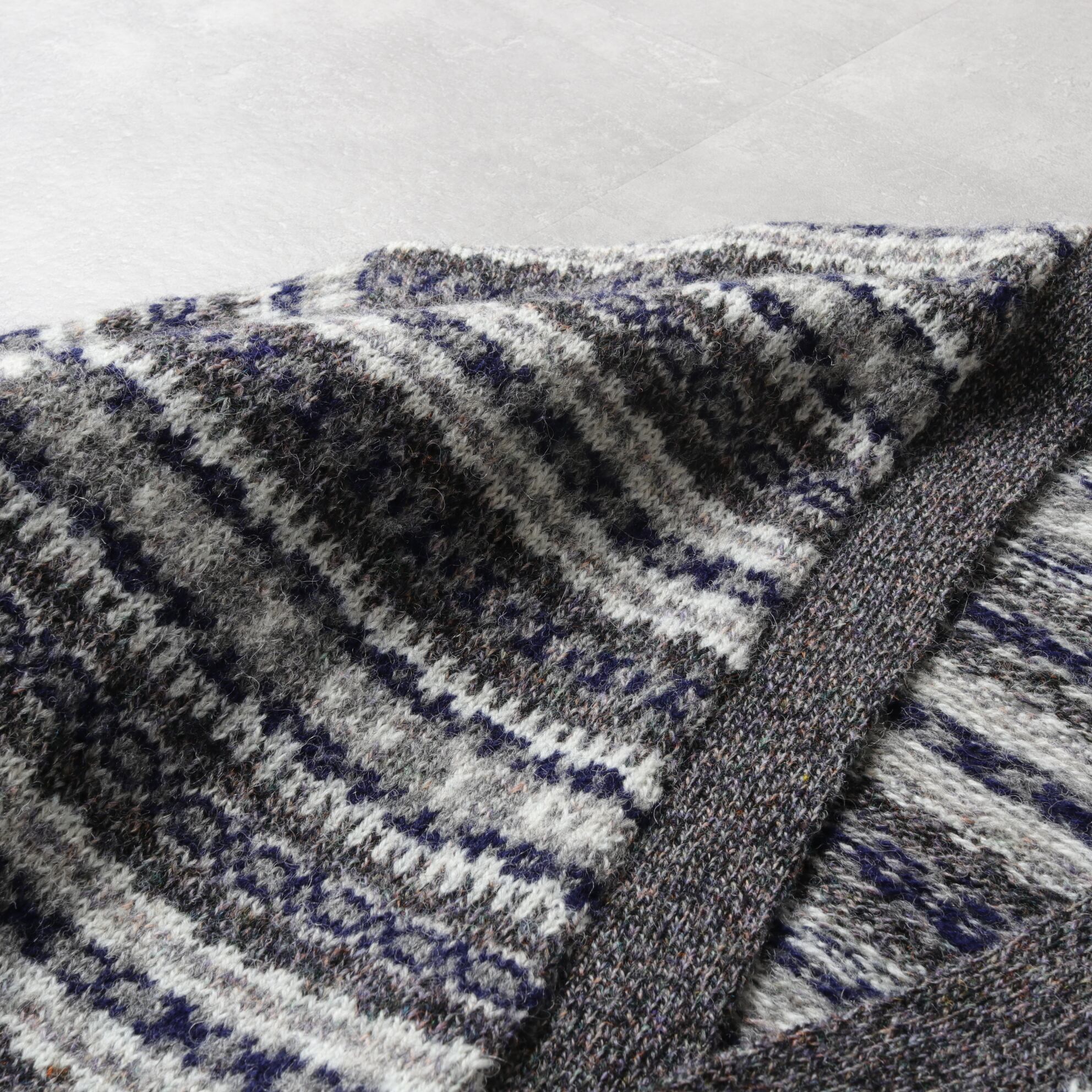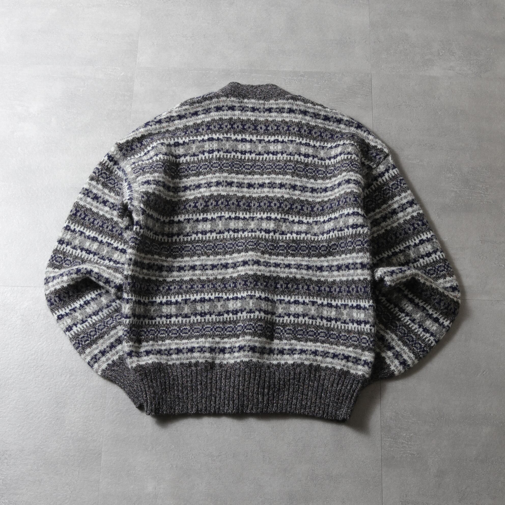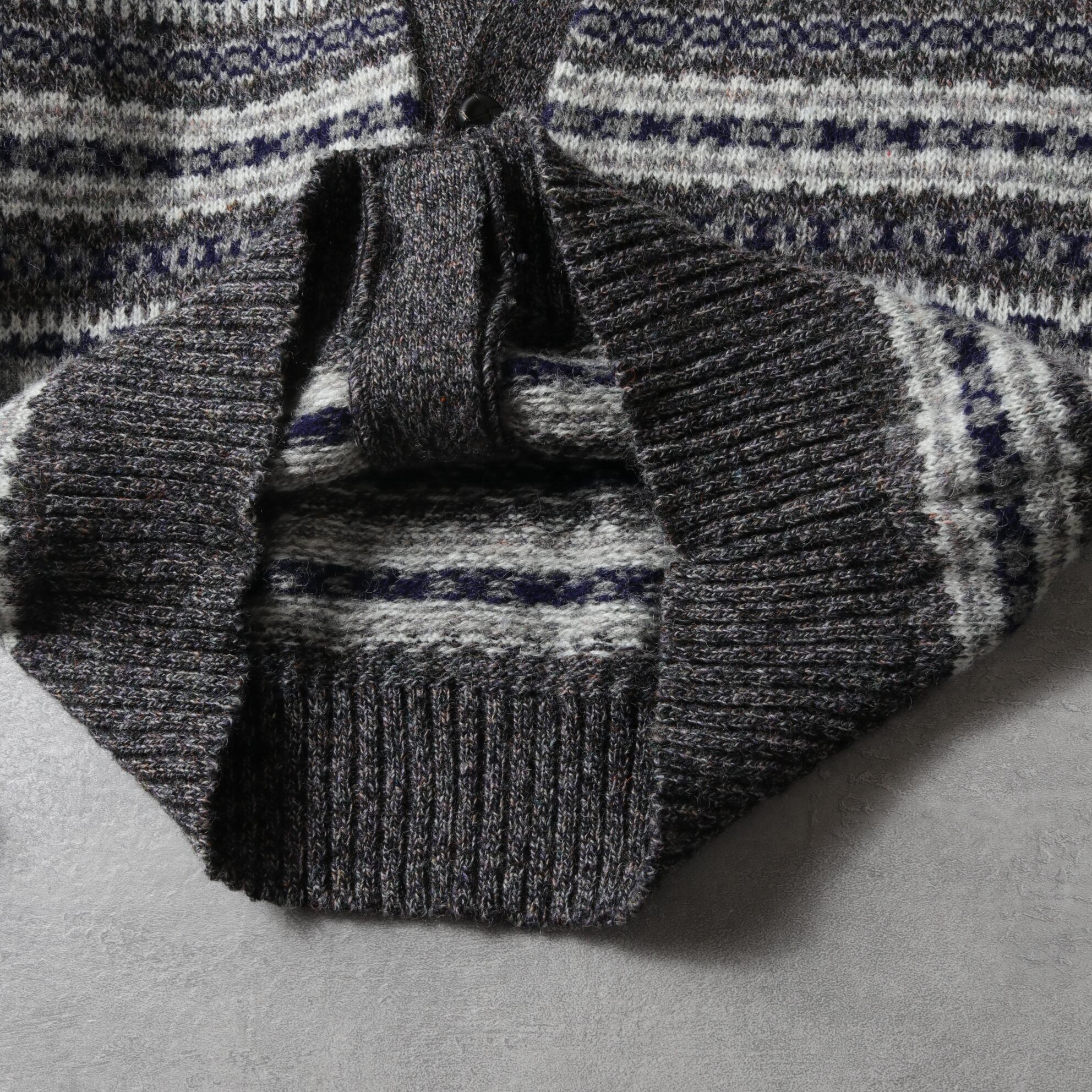 本場イギリス製のウール100%ニットで落ち着いたカラーリングのフェアアイルパターン。