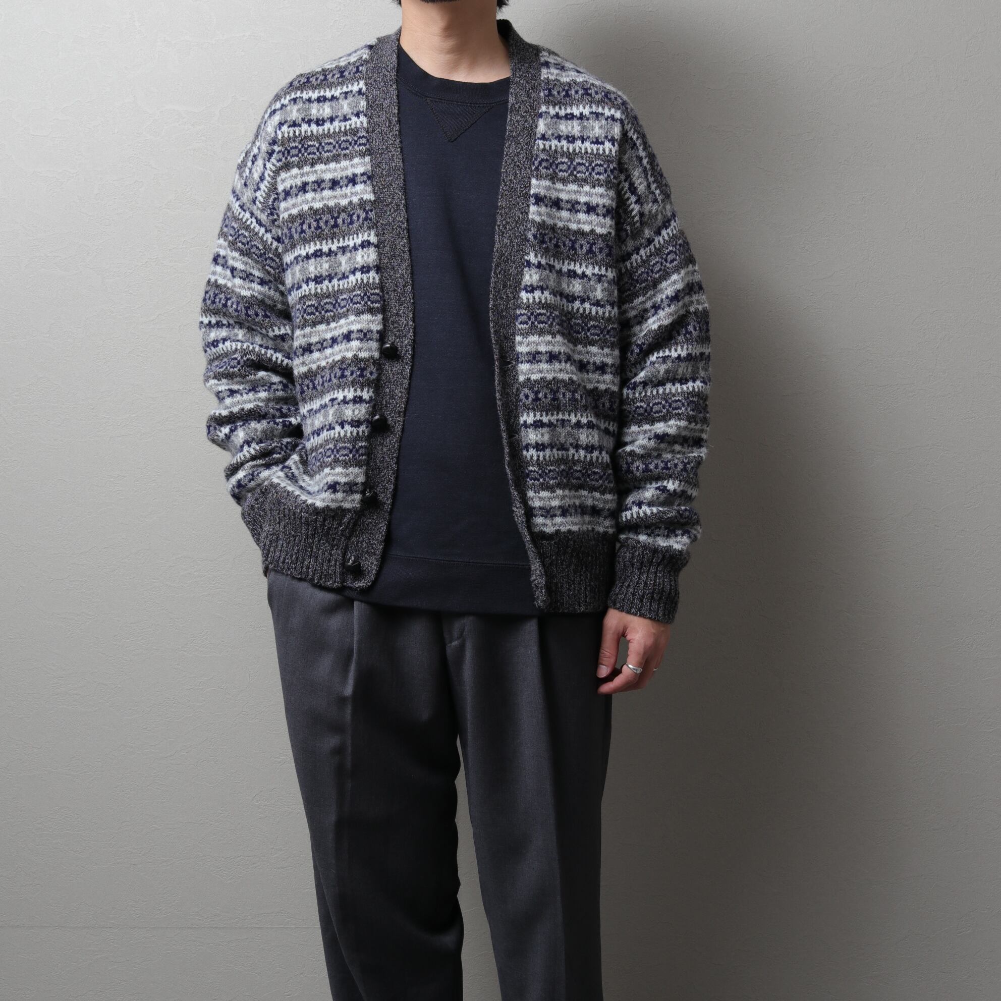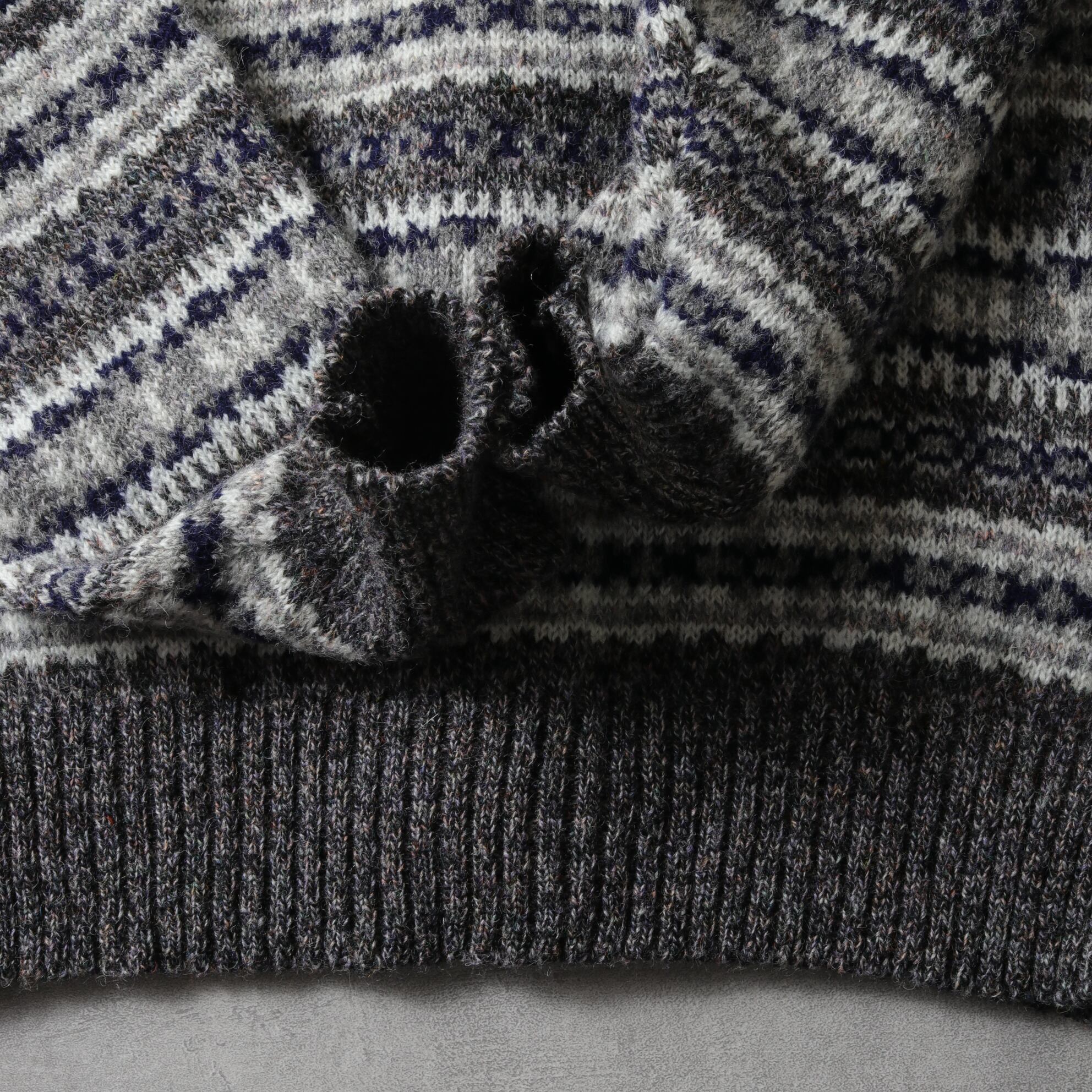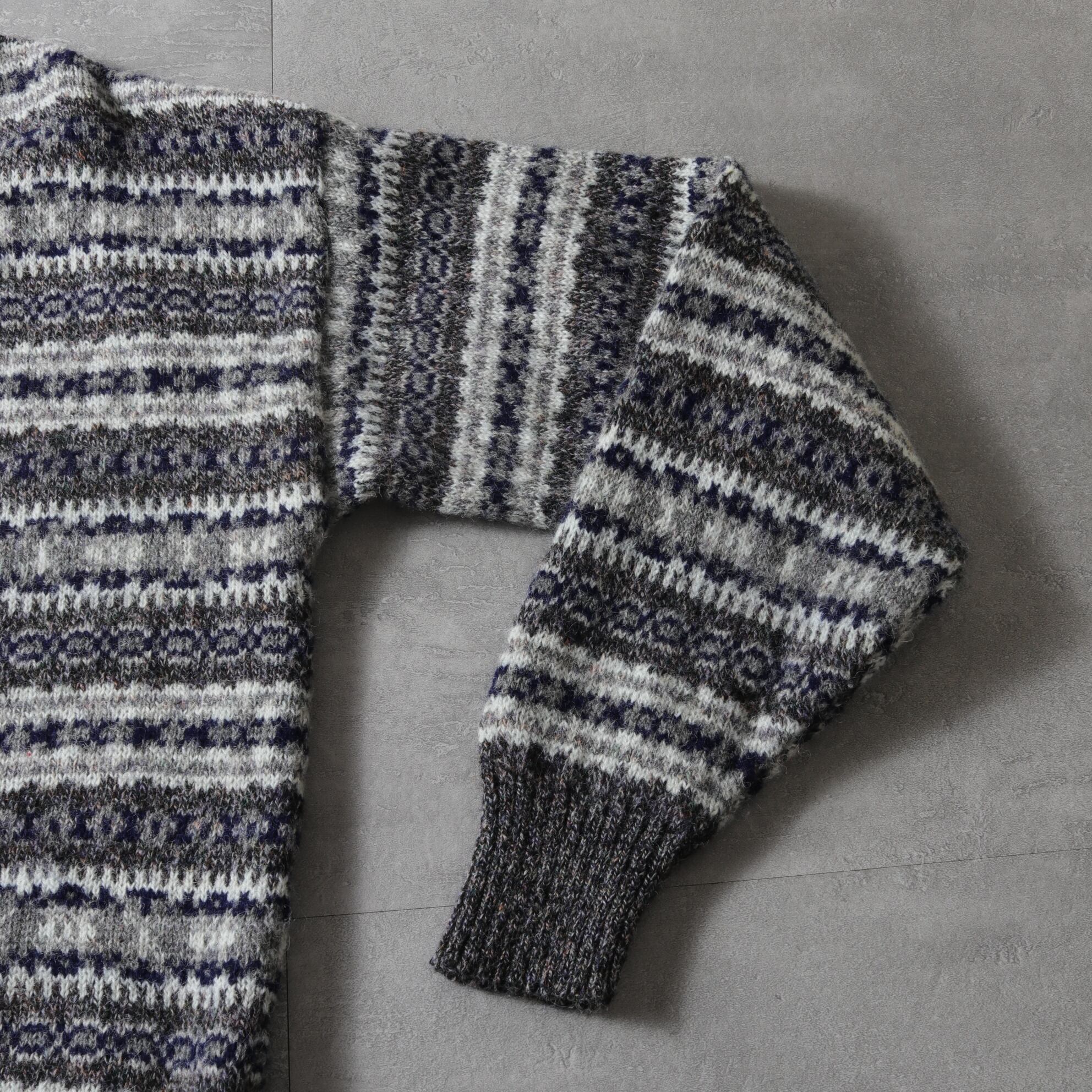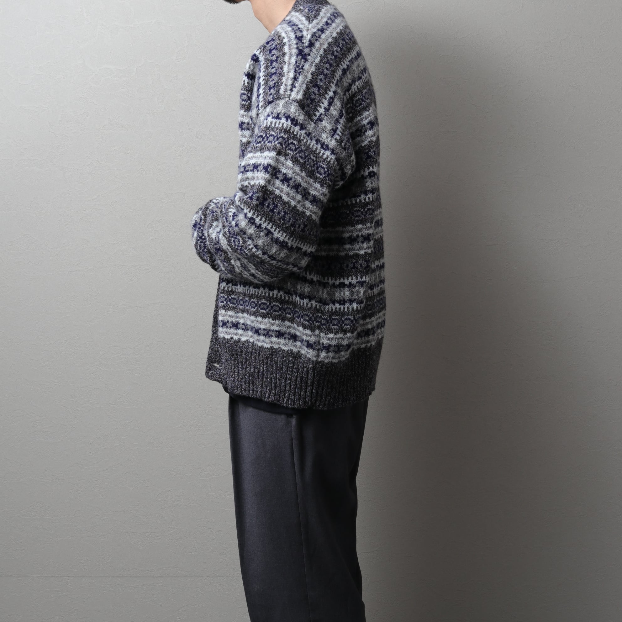 本場イギリス製のウール100%ニットで落ち着いたカラーリングのフェアアイルパターン。