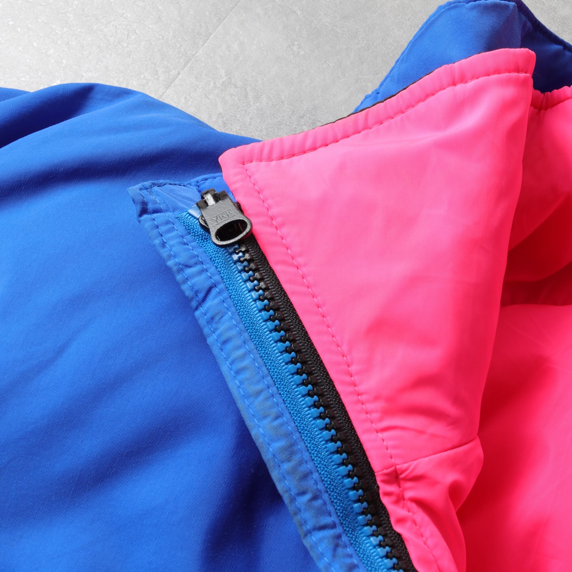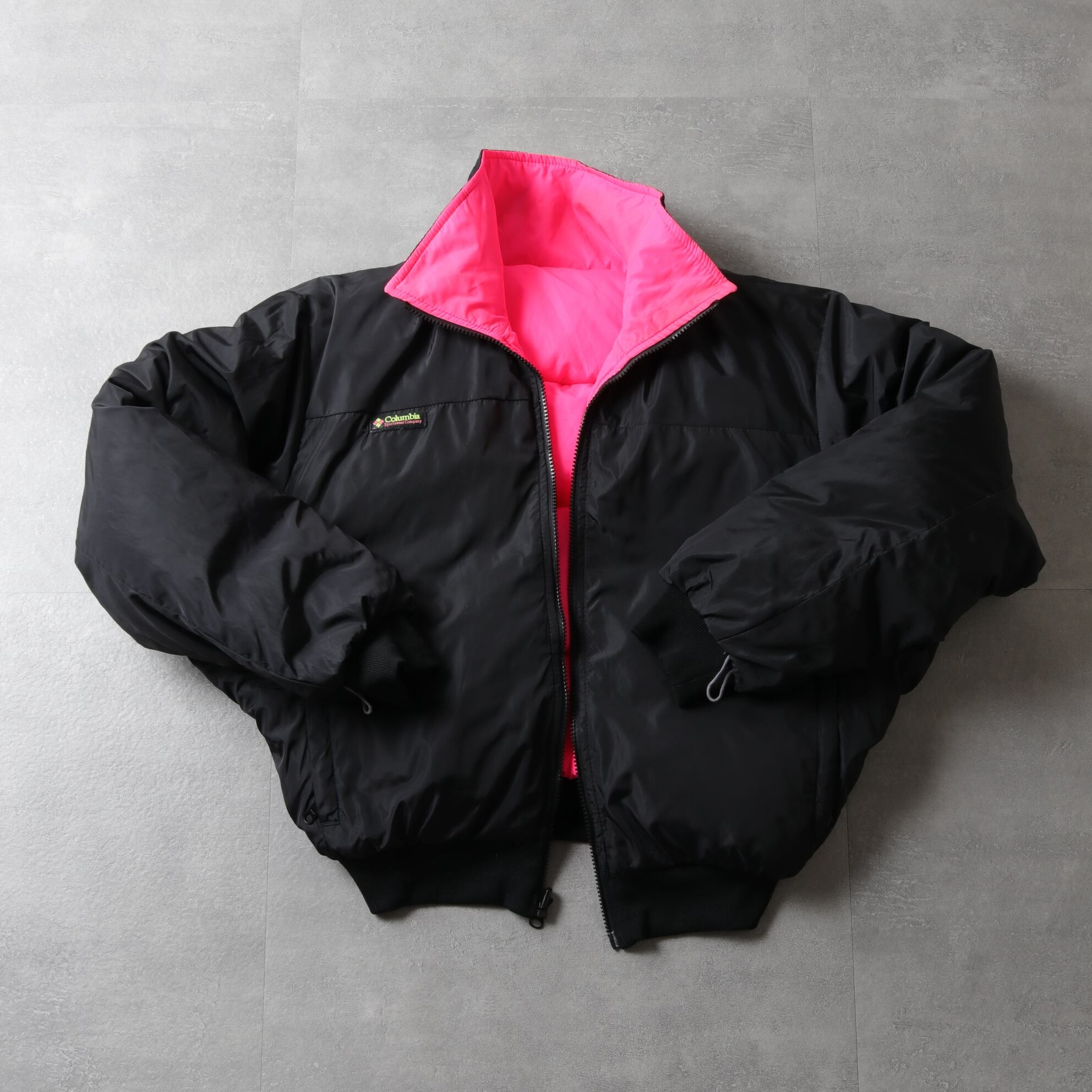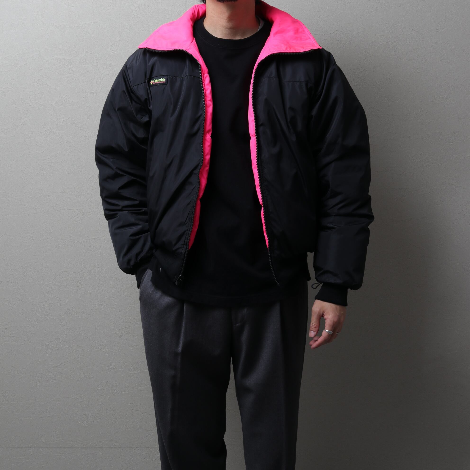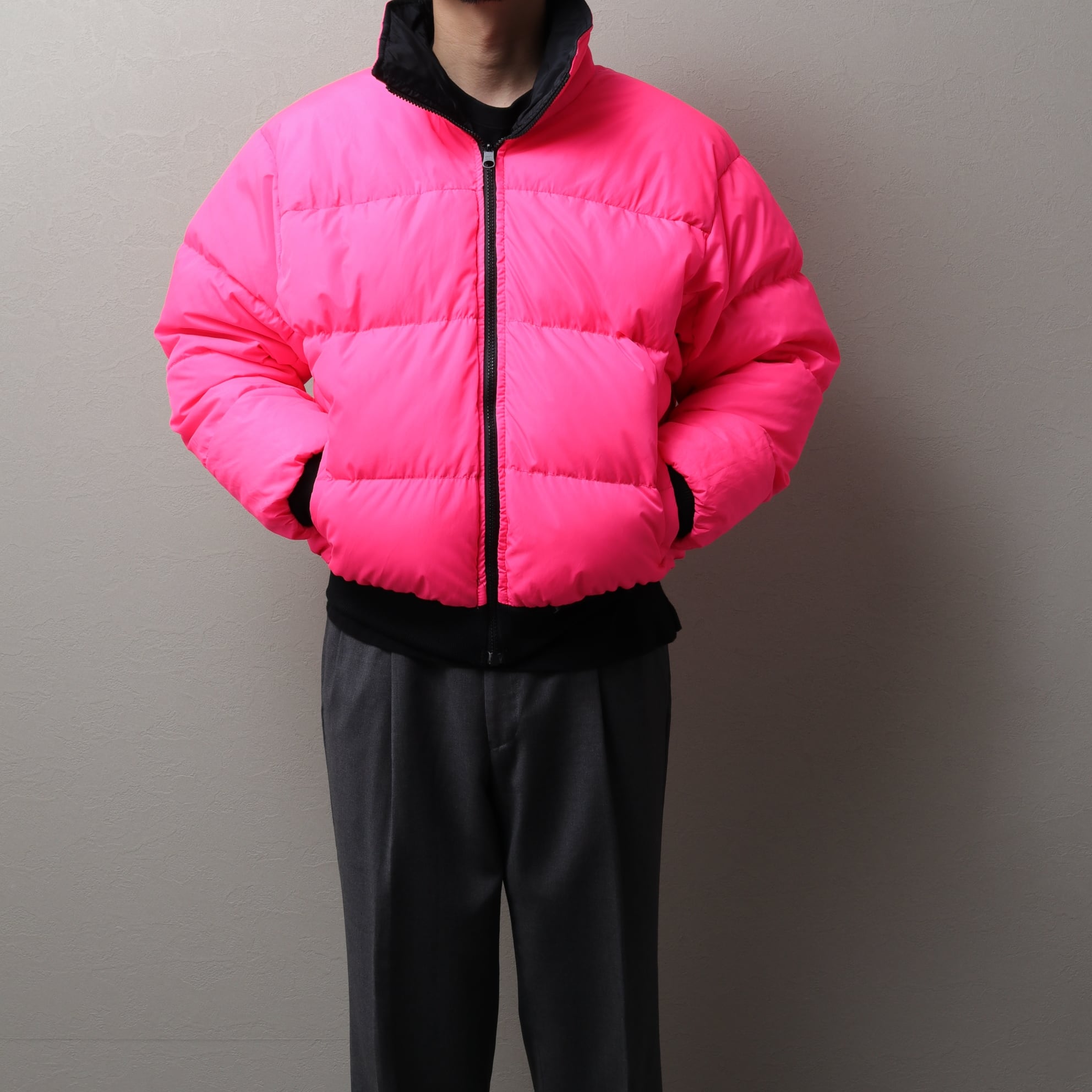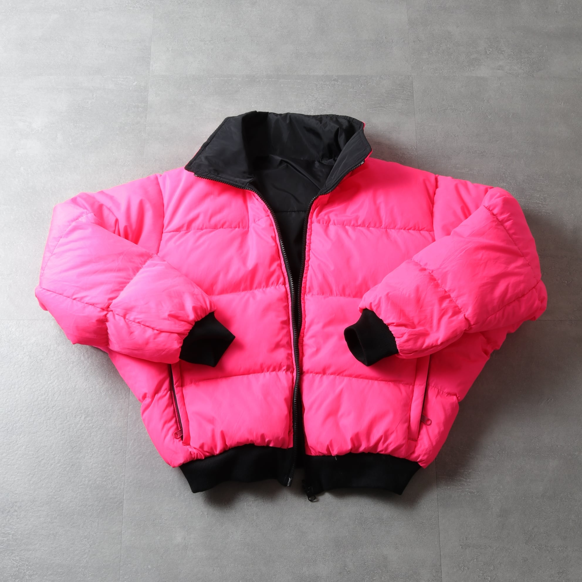 リバーシブルダウンジャケットはピンク、ブラックのグッドカラーリング。