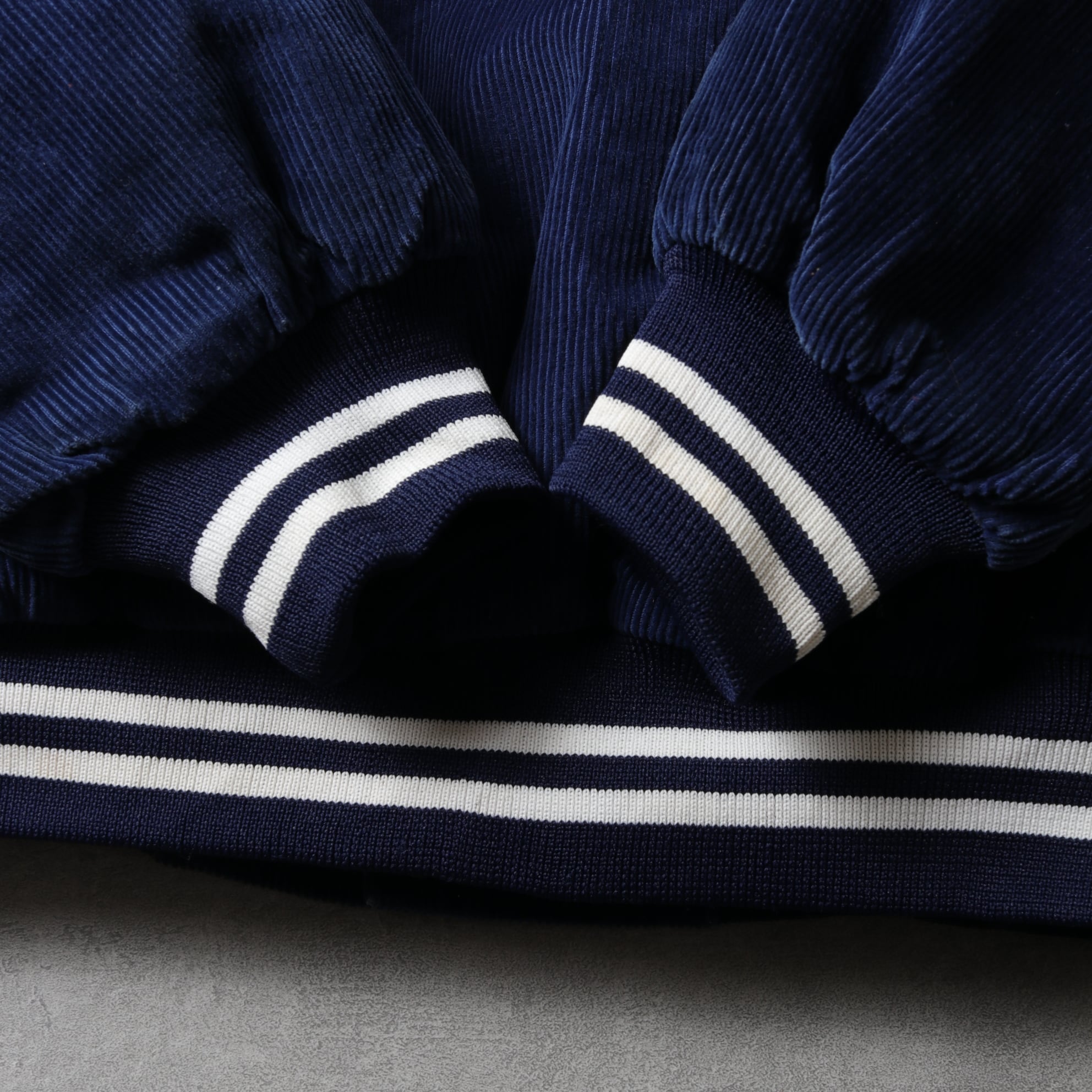 襟付きのアワードジャケットタイプでネイビーにホワイトラインのシンプルなデザイン