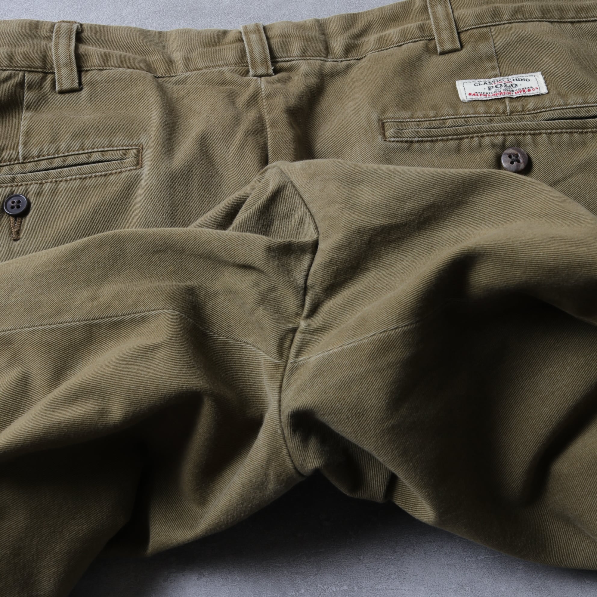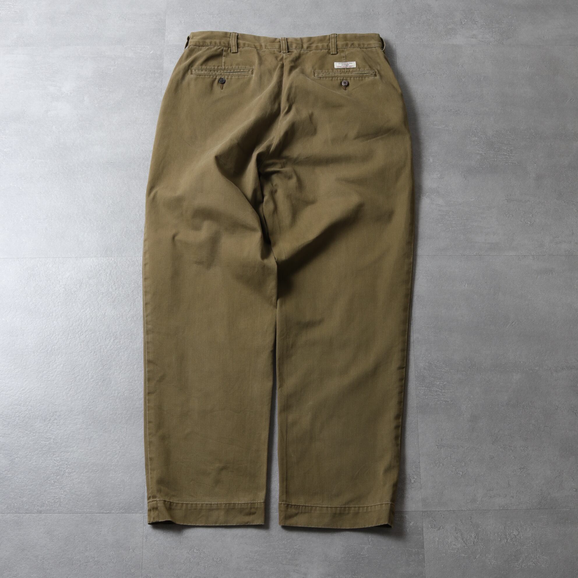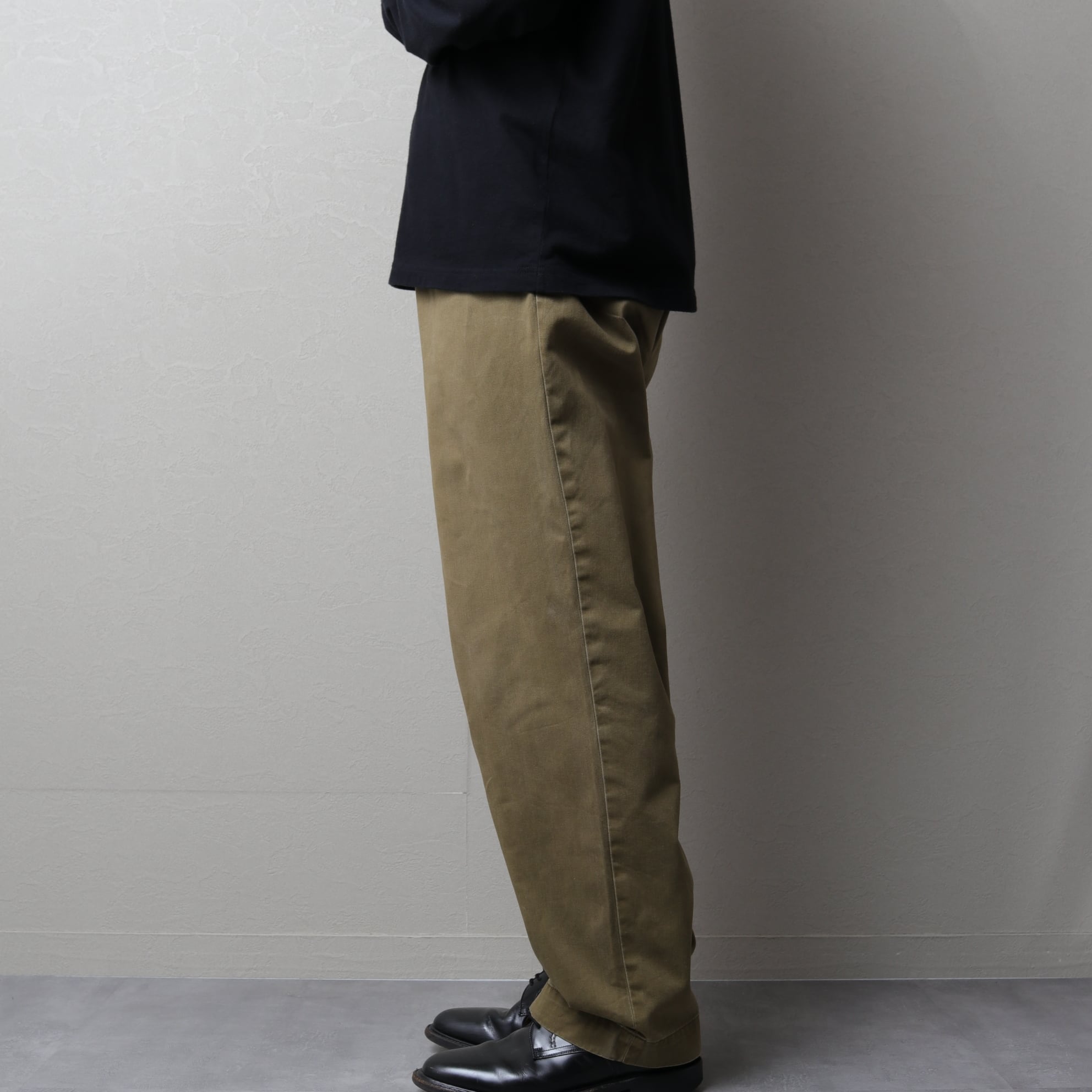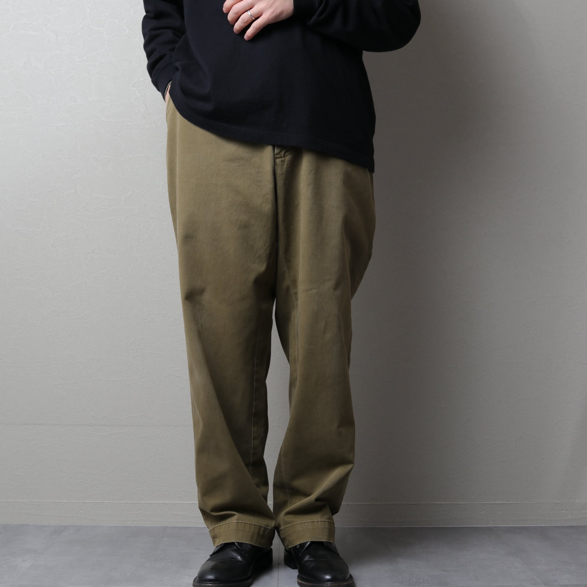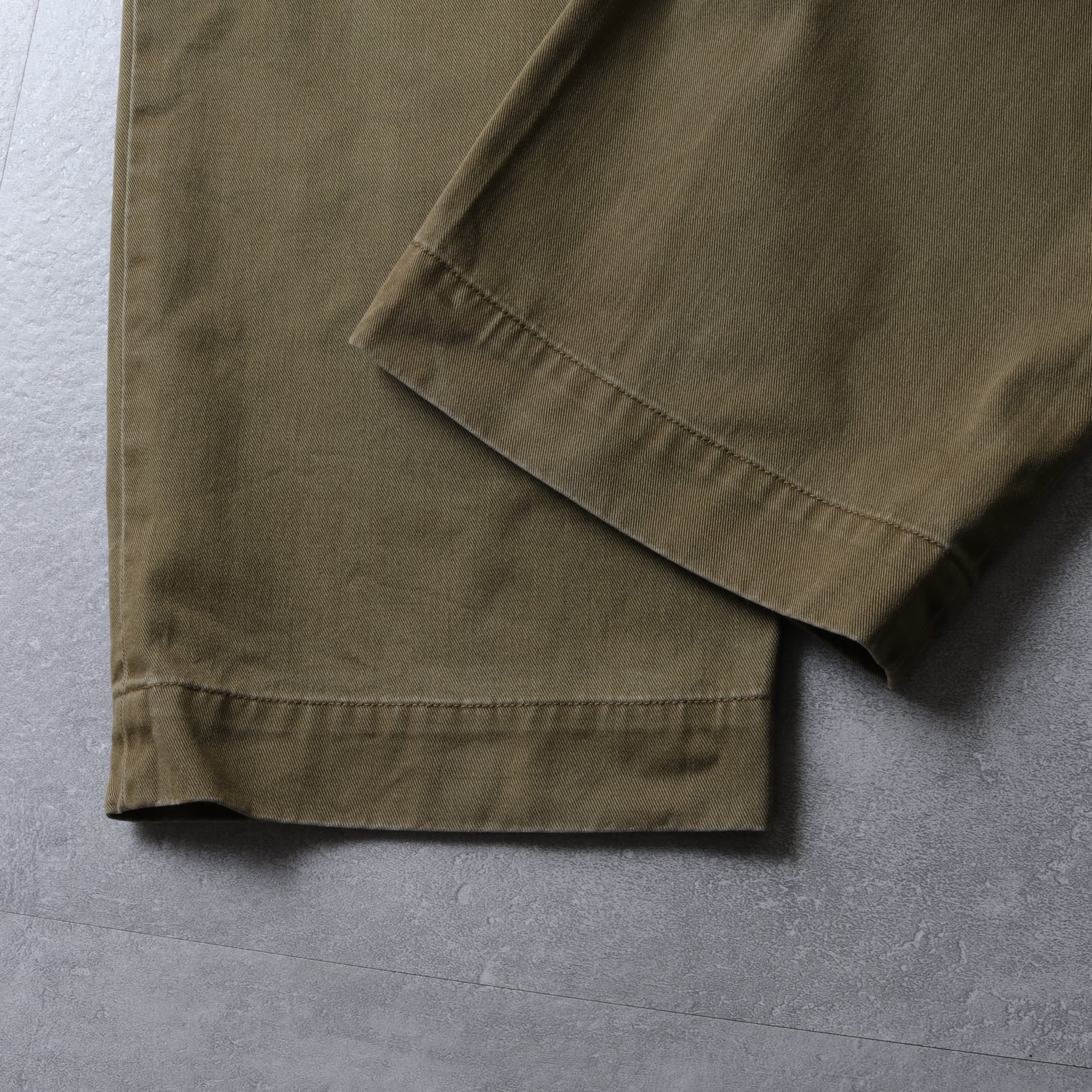 ツイル地の風合いやパッカリング、ヘム幅からアーミーチノが連想できる一本。