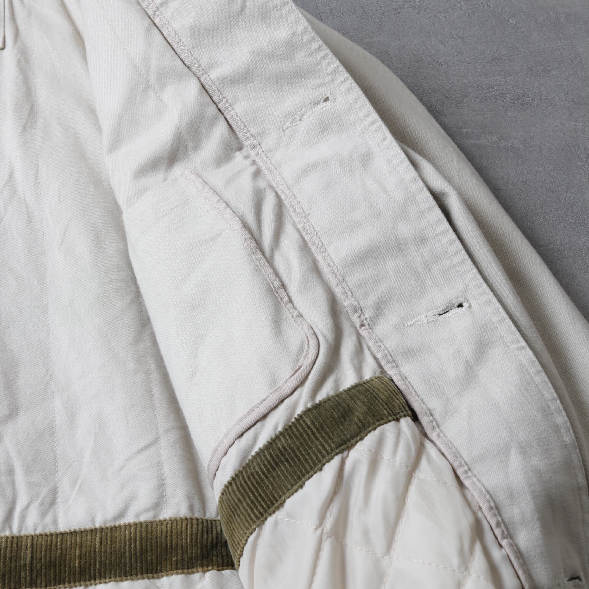 高密度の織られた厚手のツイル生地で内は薄い中綿入りのキルトライナー。