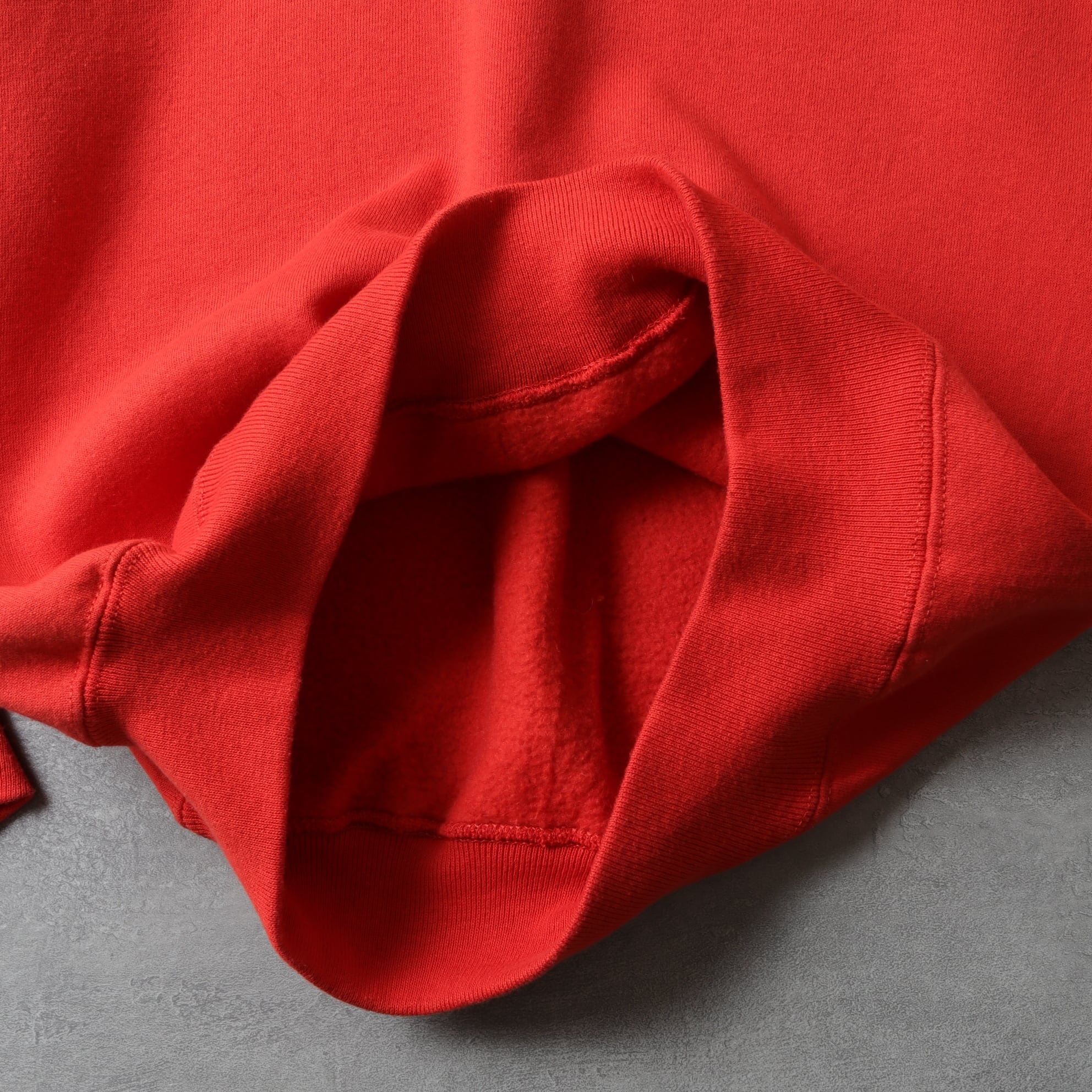コットンポリ50/50の裏起毛ボディにセットインスリーブ。