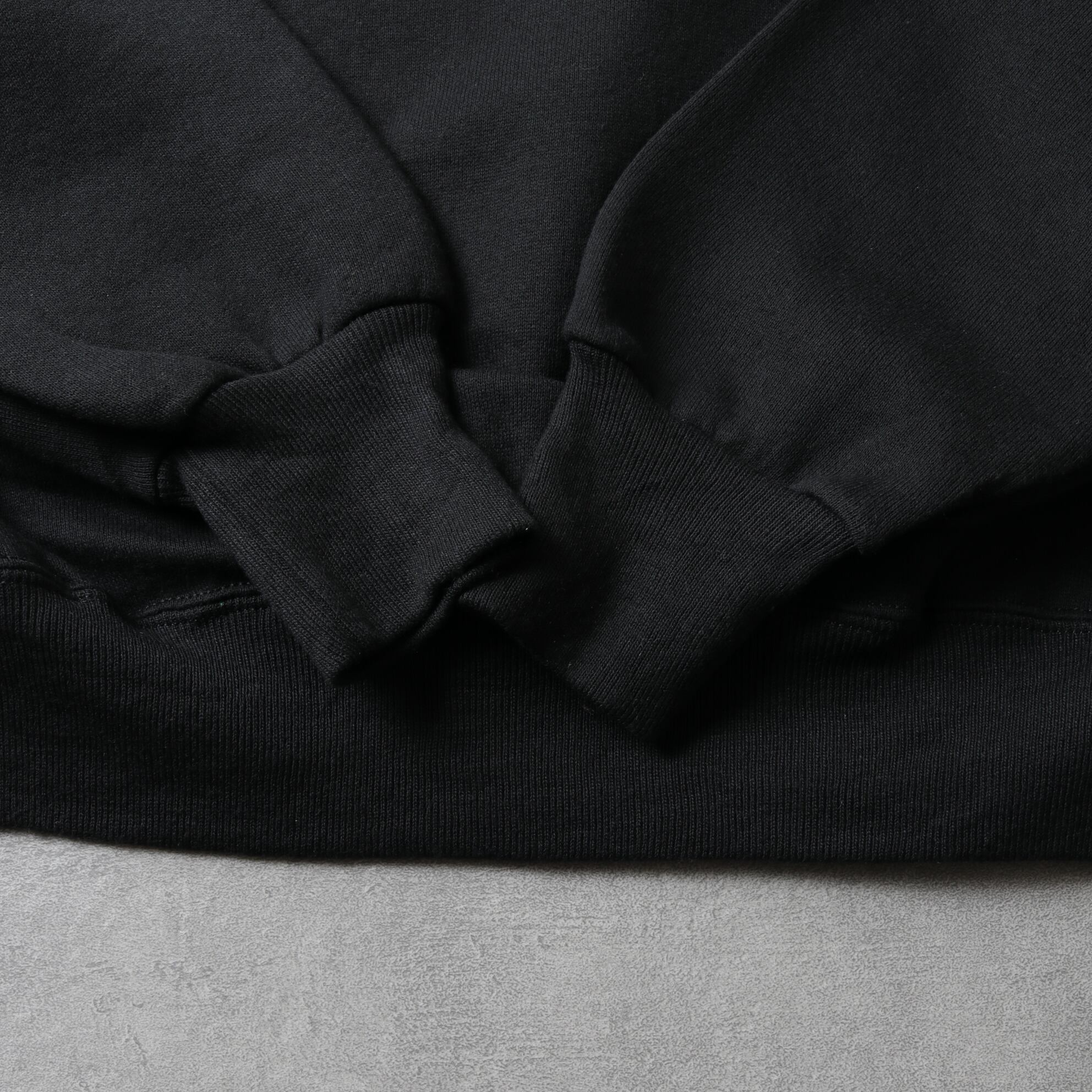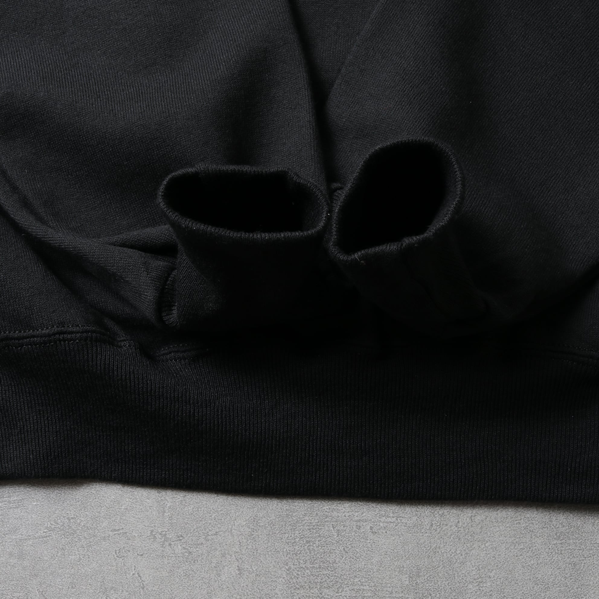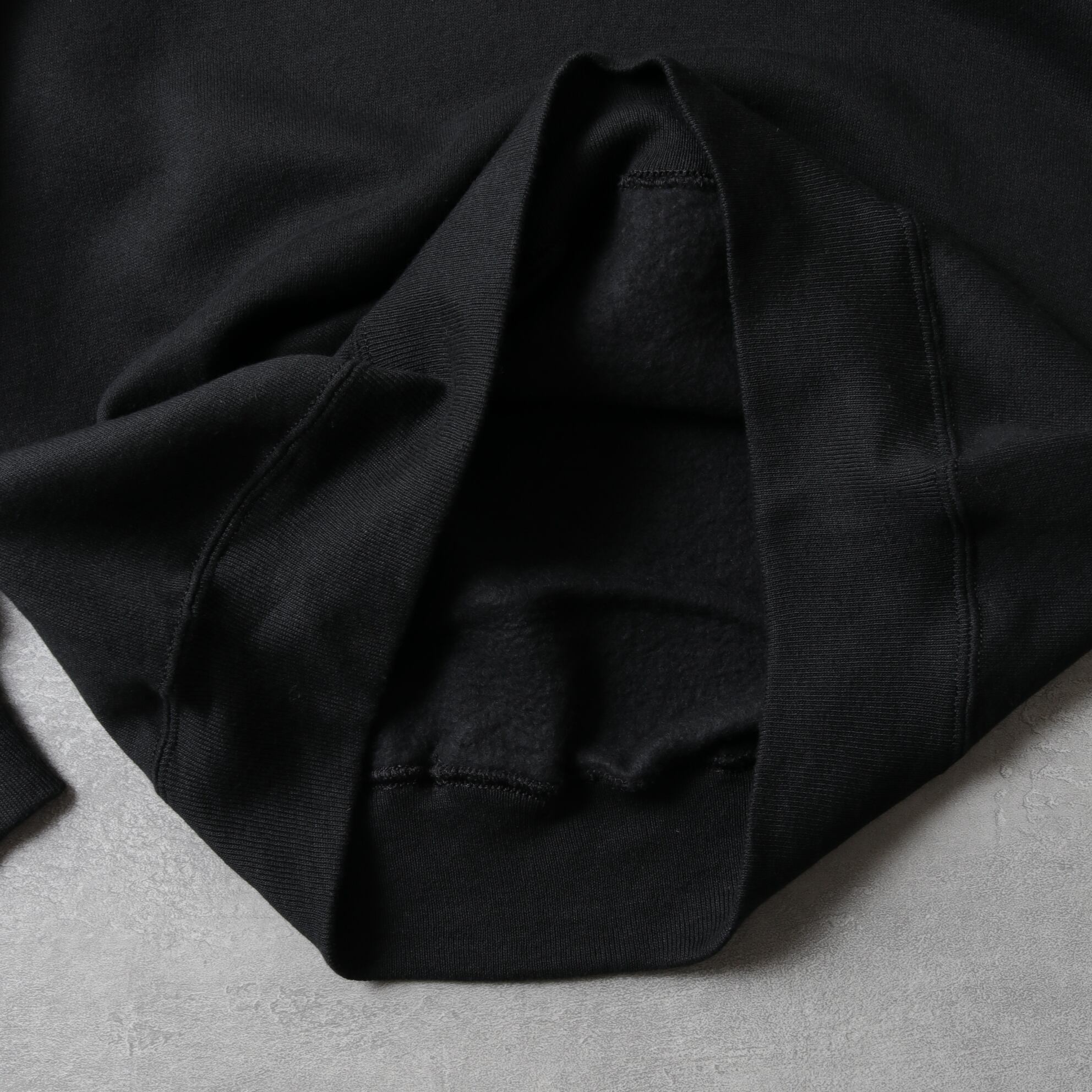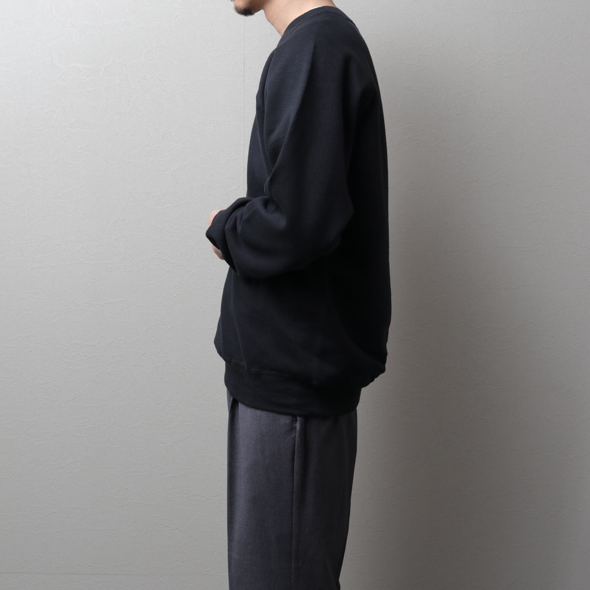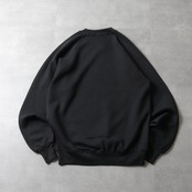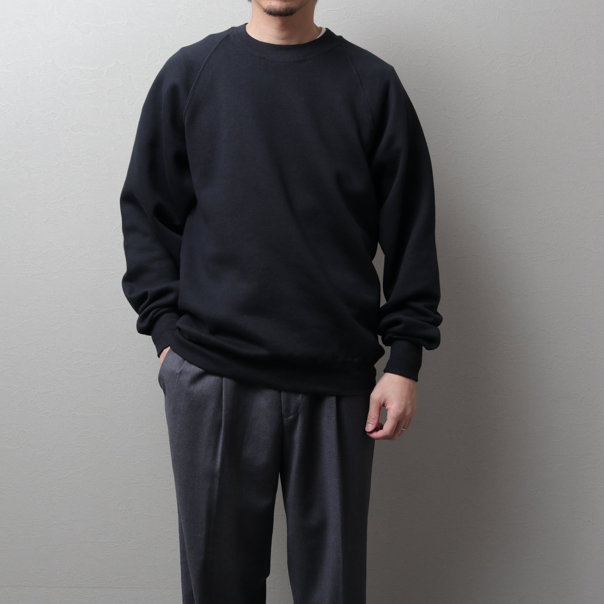 コットンポリ50/50のややライトな裏起毛ボディにラグランスリーブ。