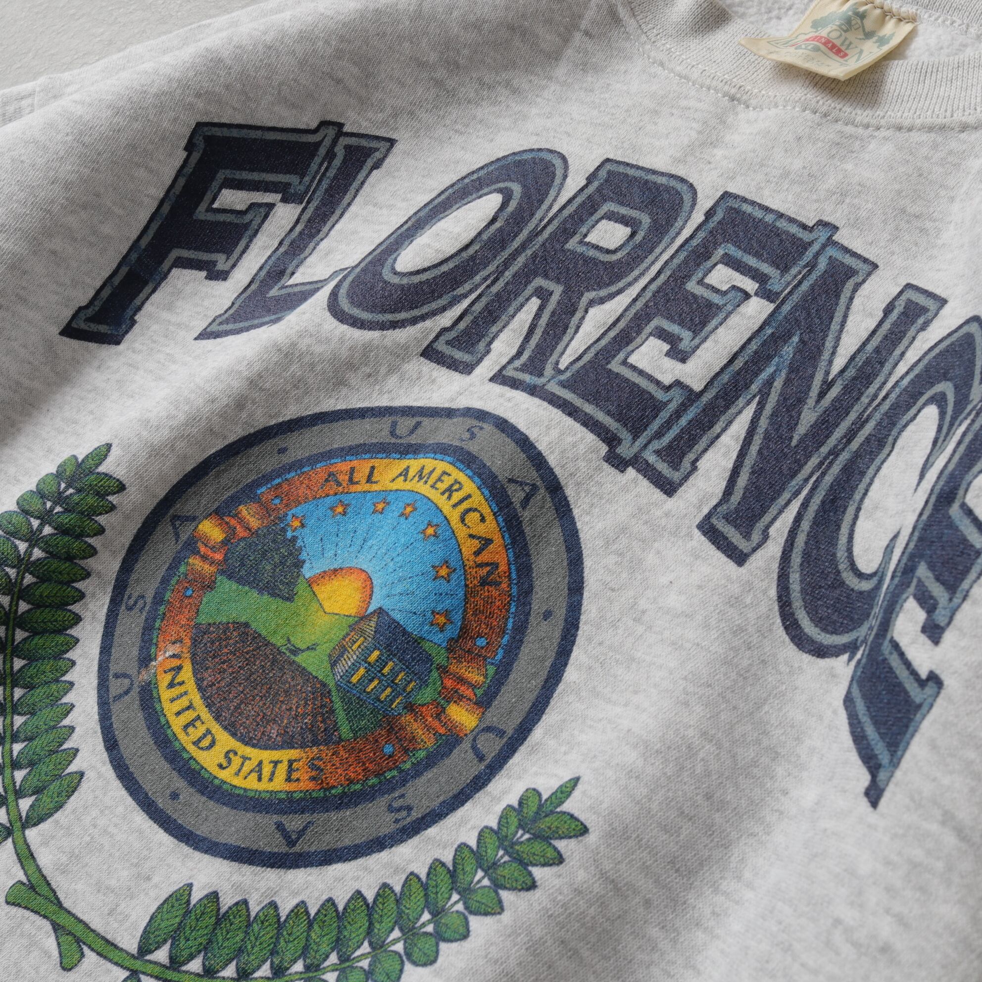 カレッジライクな3段プリントに月桂樹、中央サイクルには風景が描かれた良いデザイン。