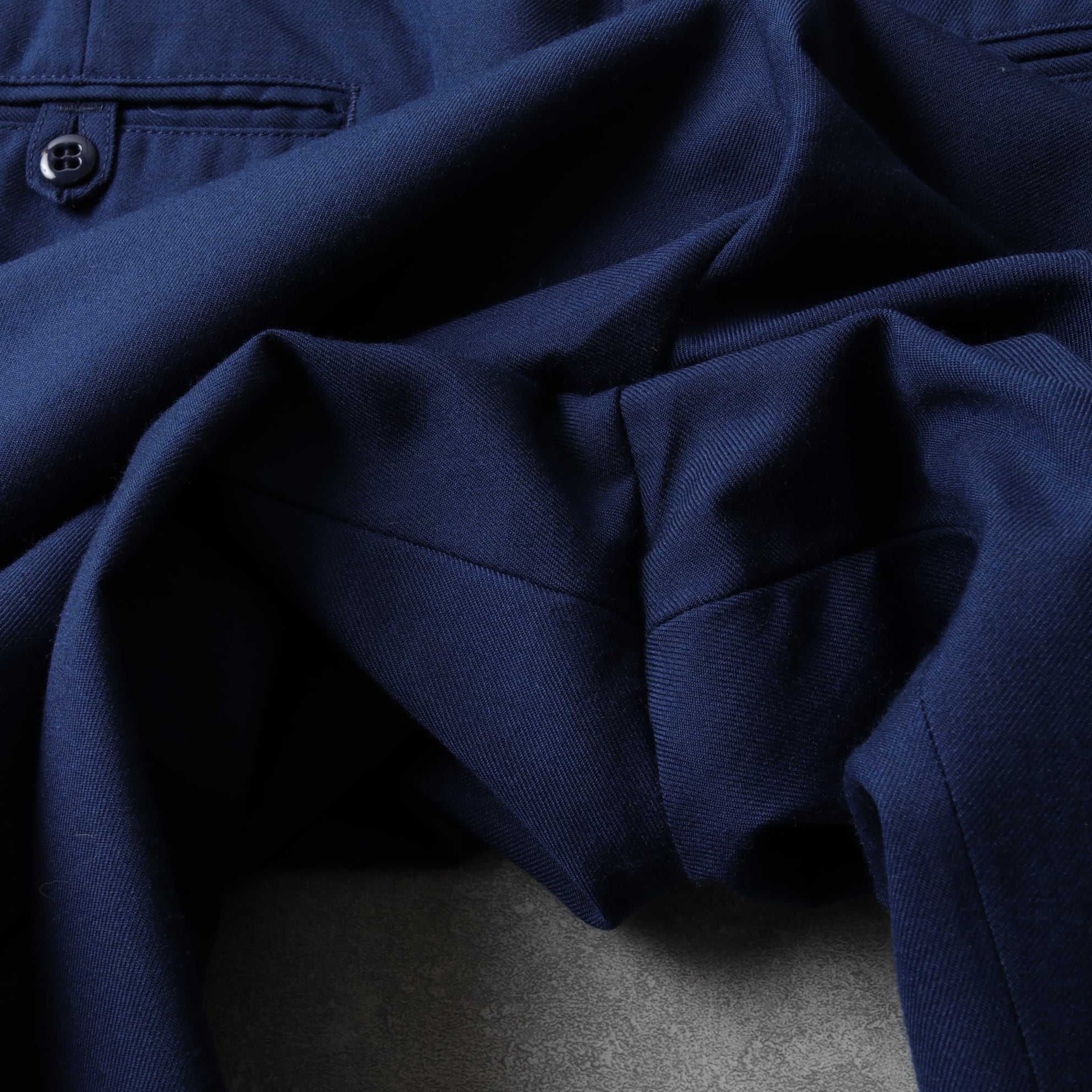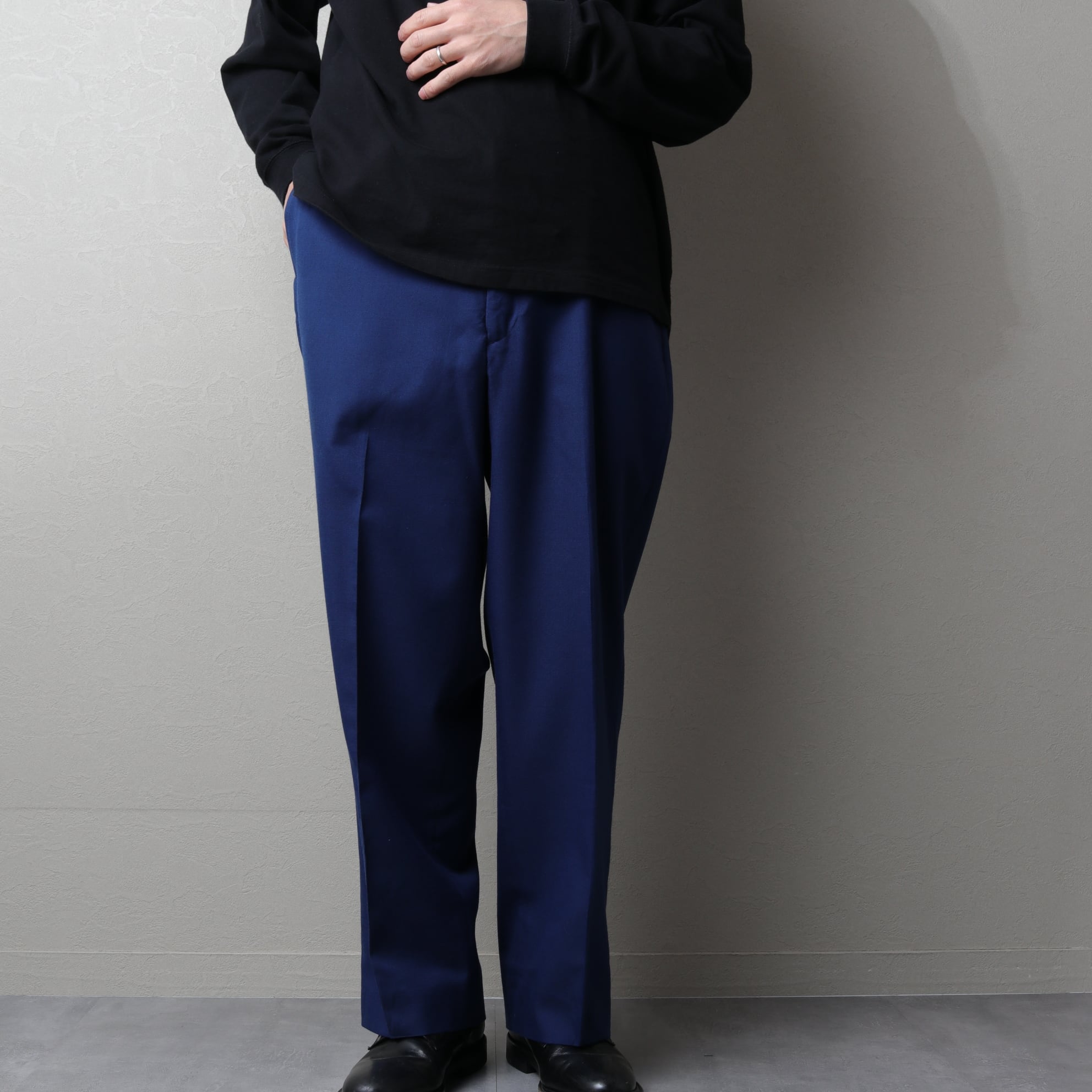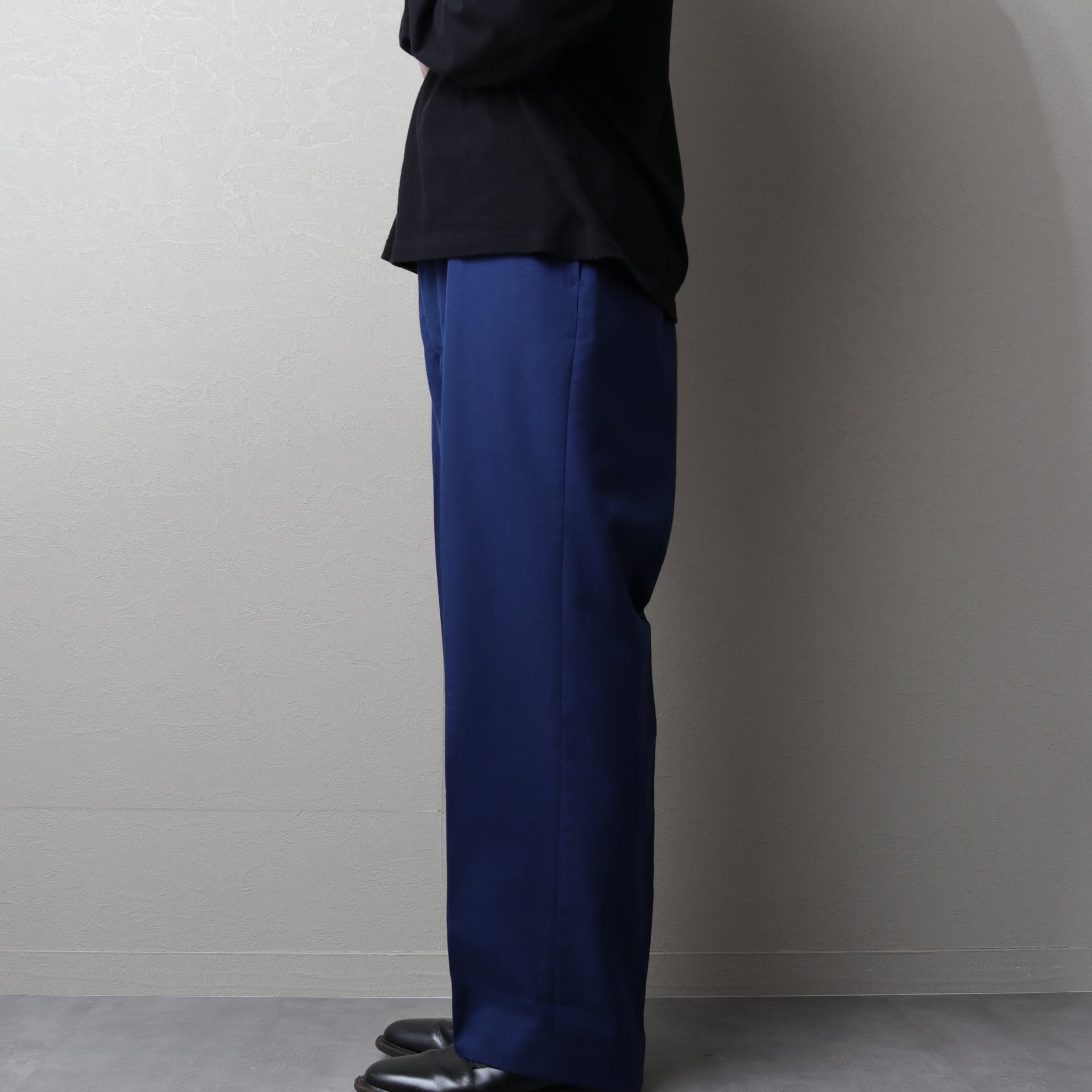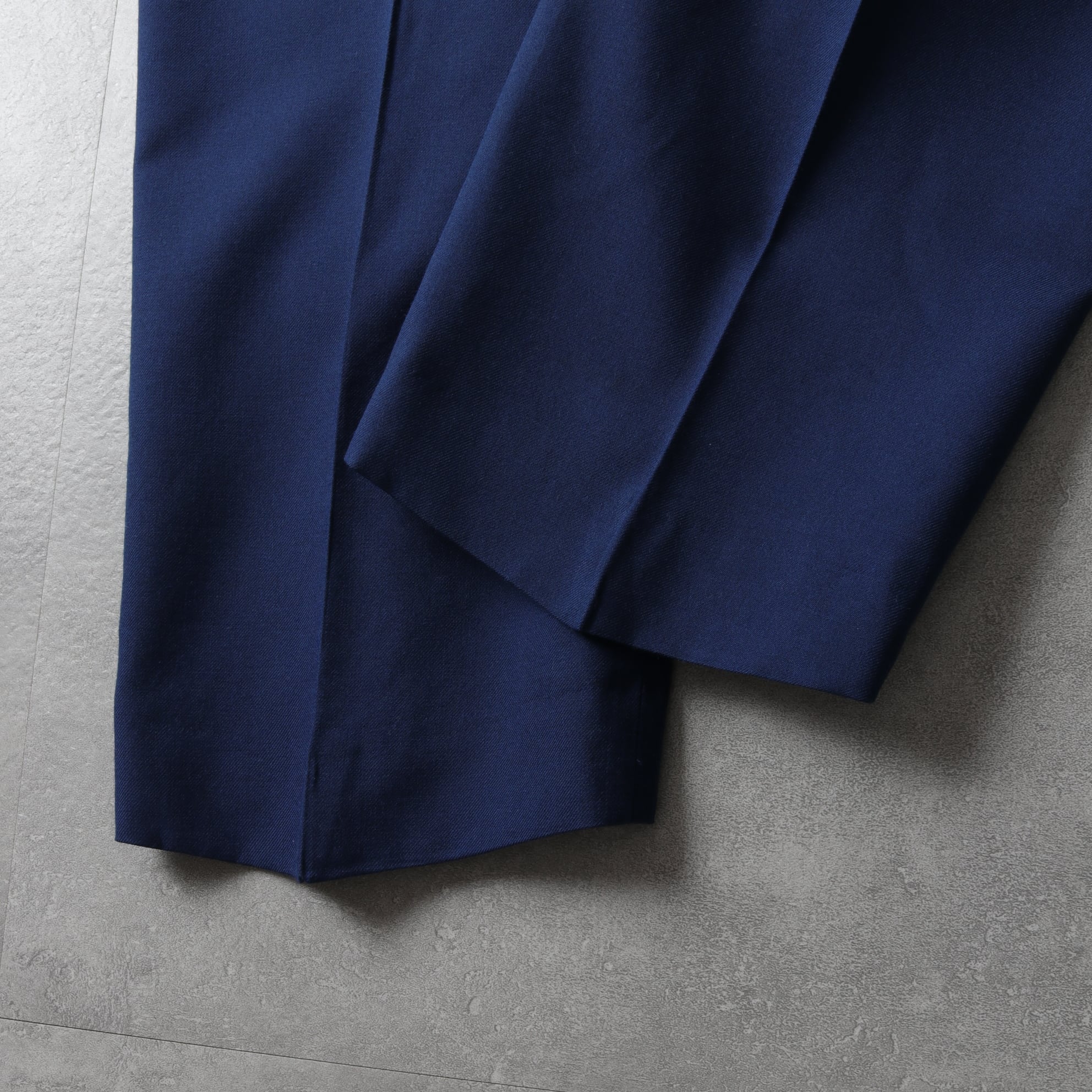 高密度に織られたポリウールのツイル生地に太めのストレートシルエット。