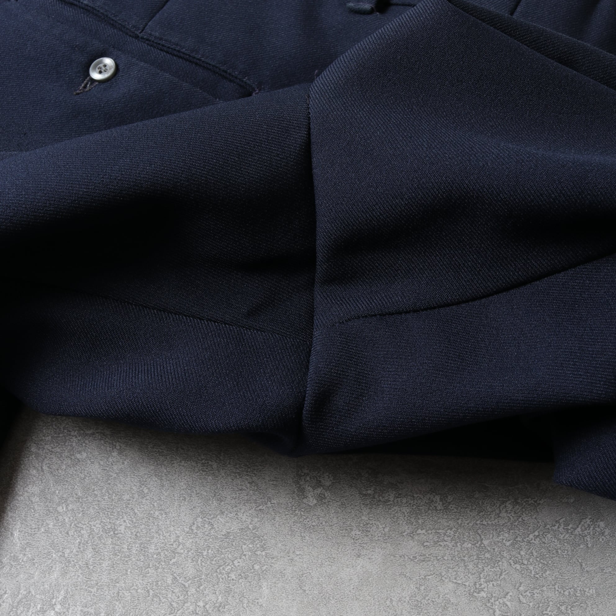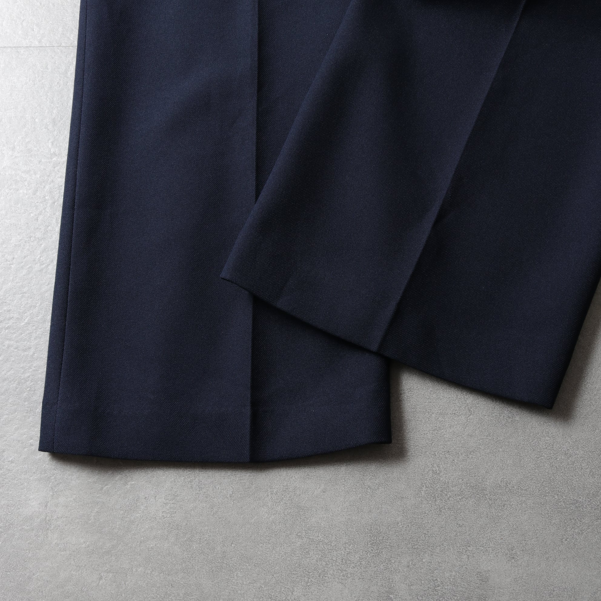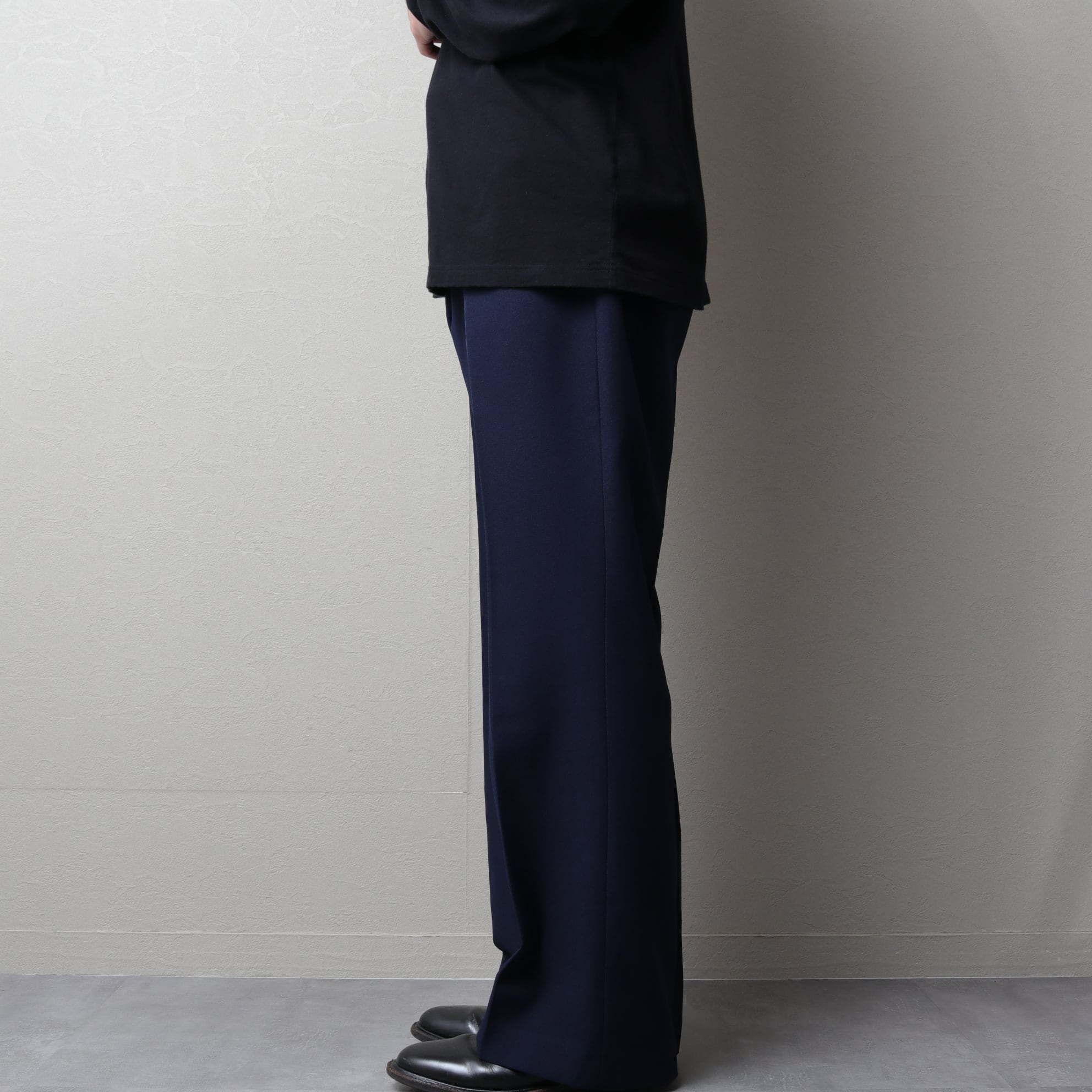 シワになりにくく、ケアしやすい、かつ通年穿けるポリ素材のパンツ。