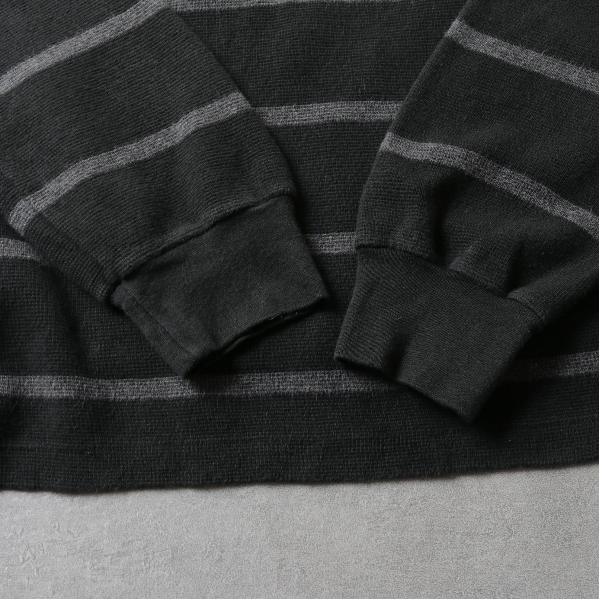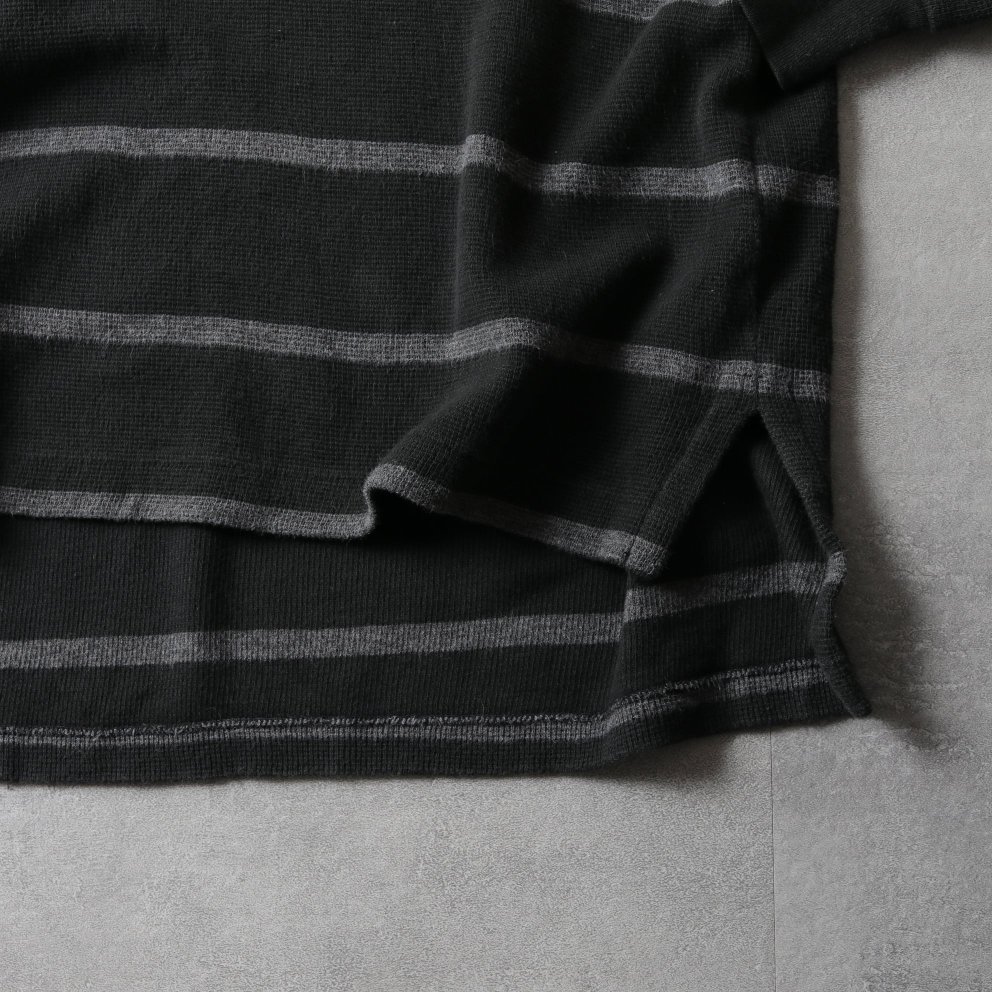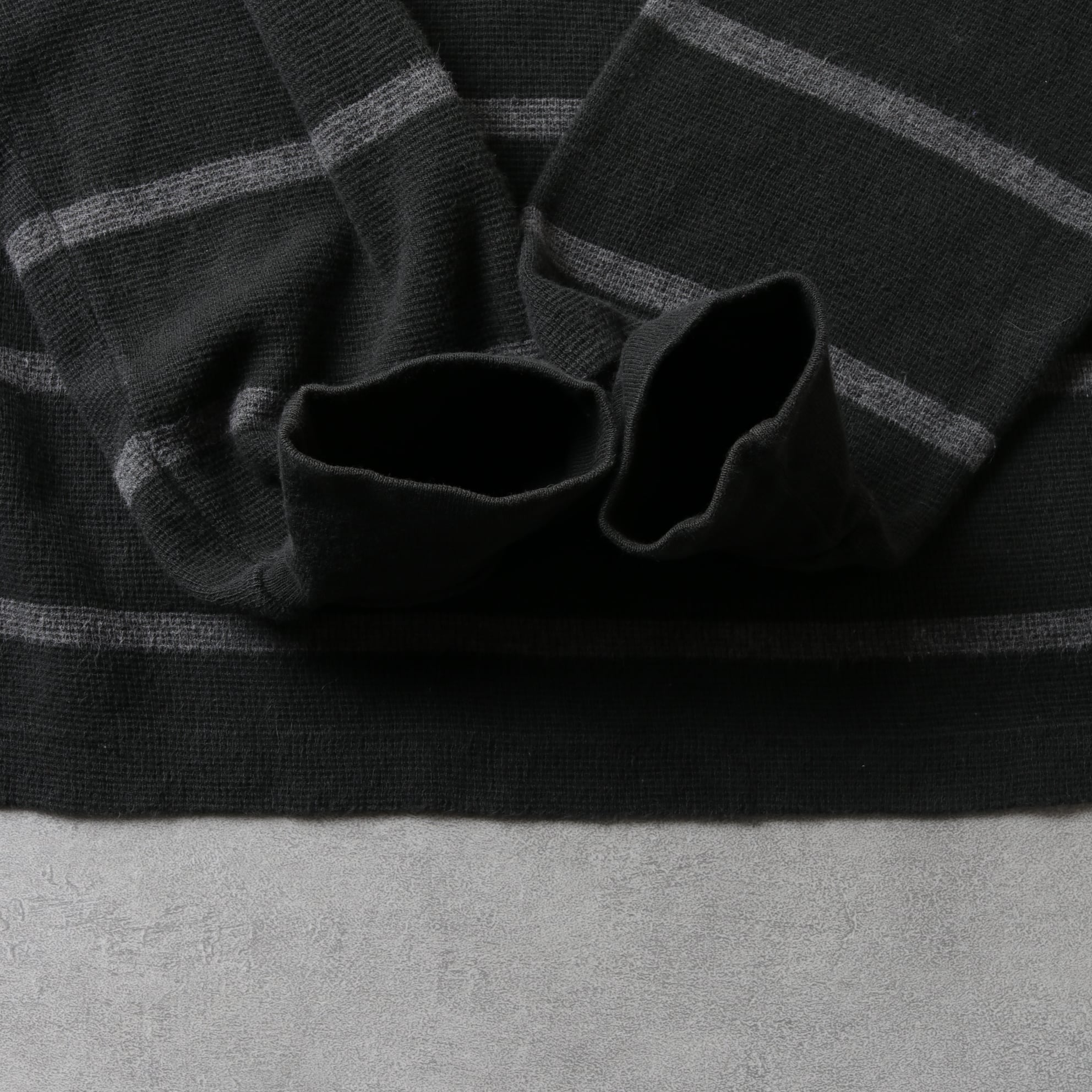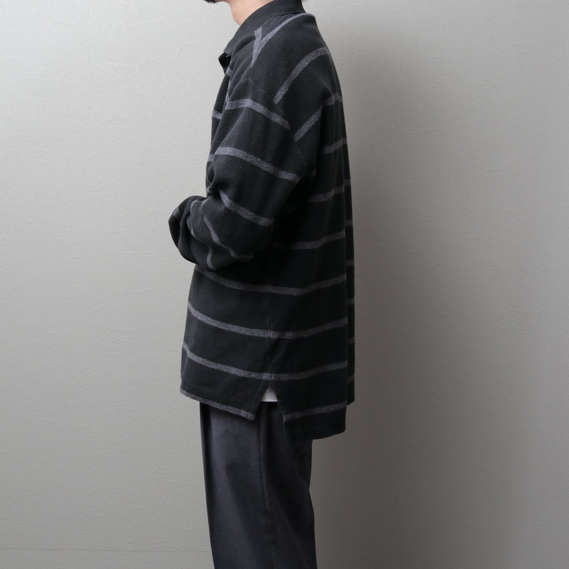 ドライなコットン鹿の子生地にブラック・グレーの細ボーダー。
