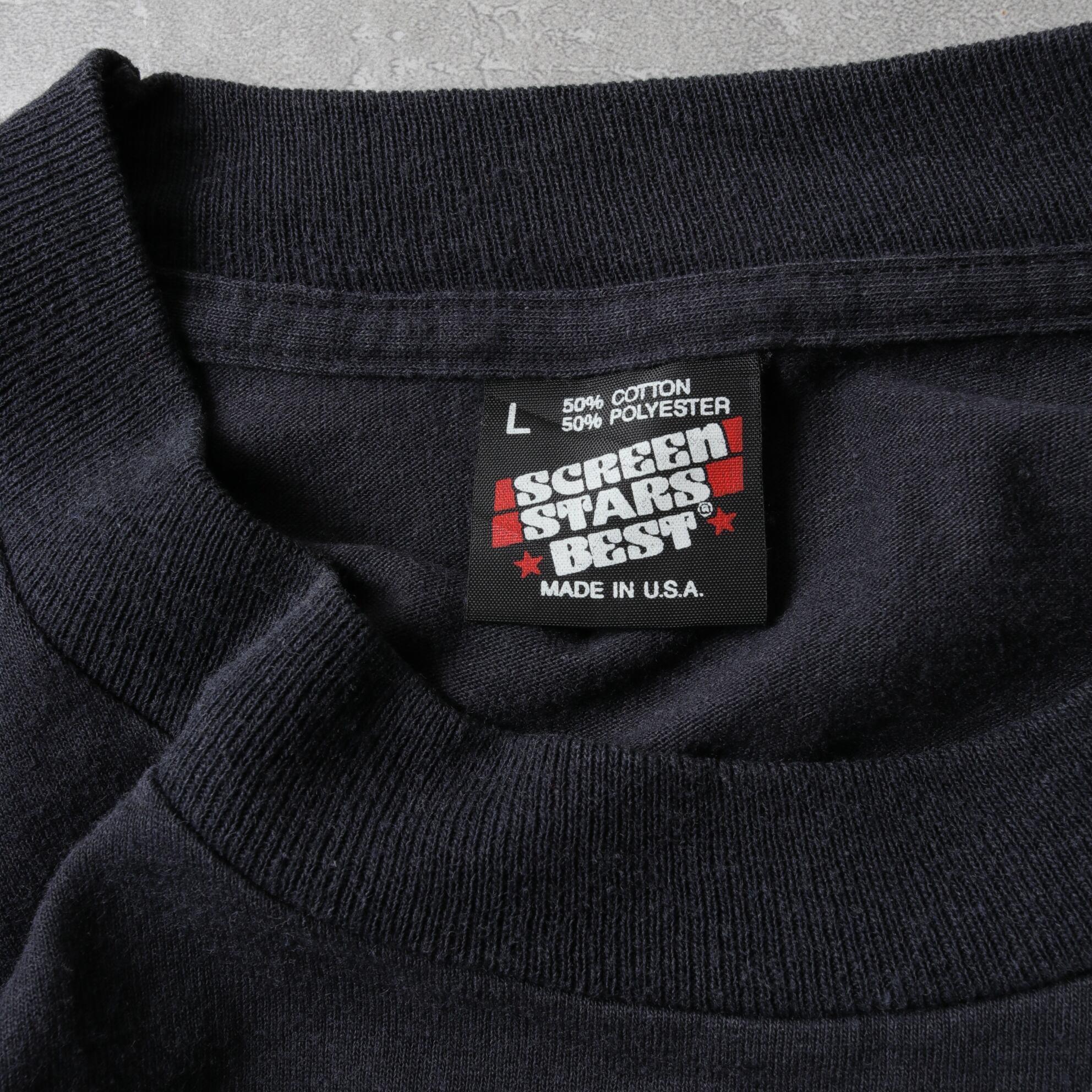 アメリカ製スクリーンスターズのポリコットン50/50ボディ、袖裾シングルです。