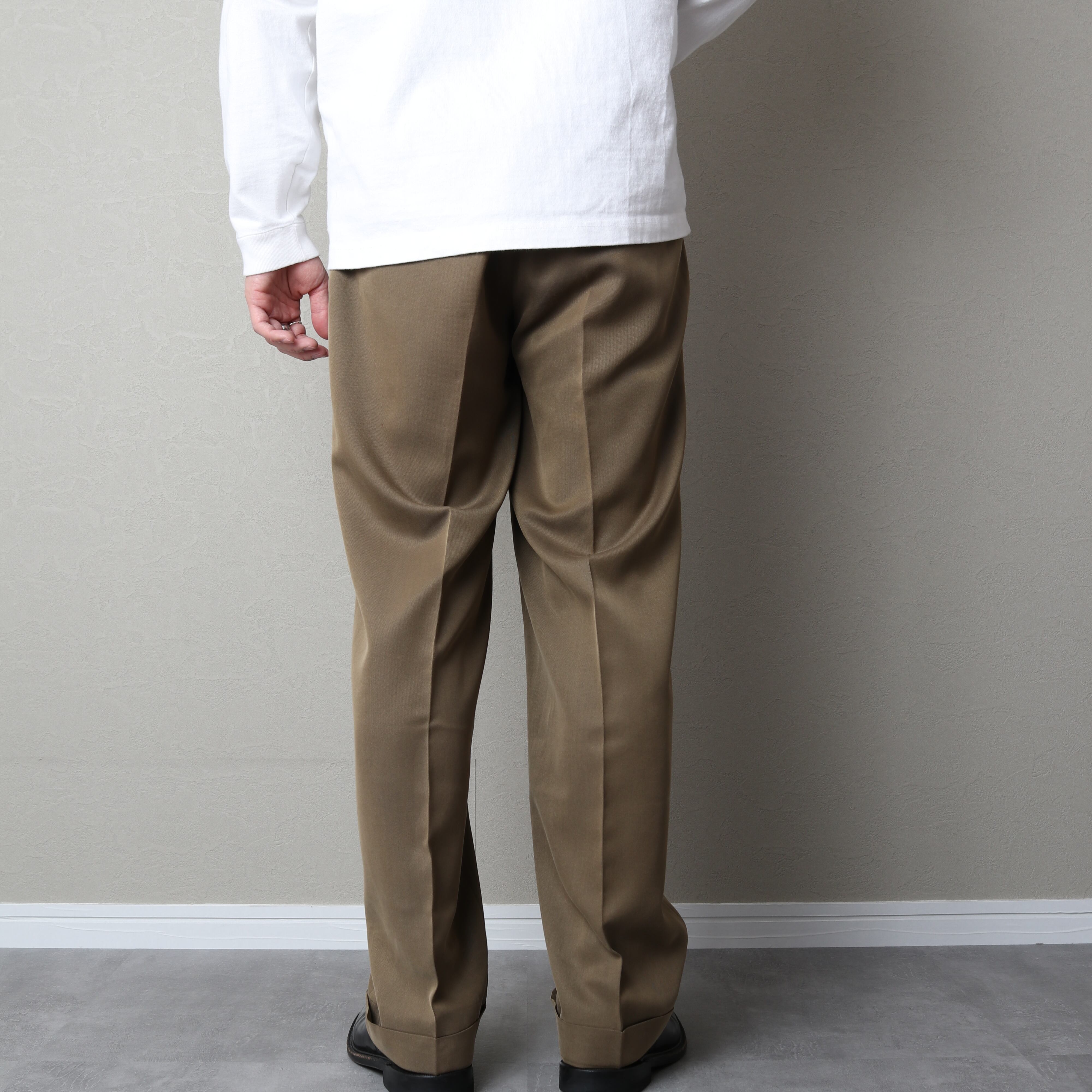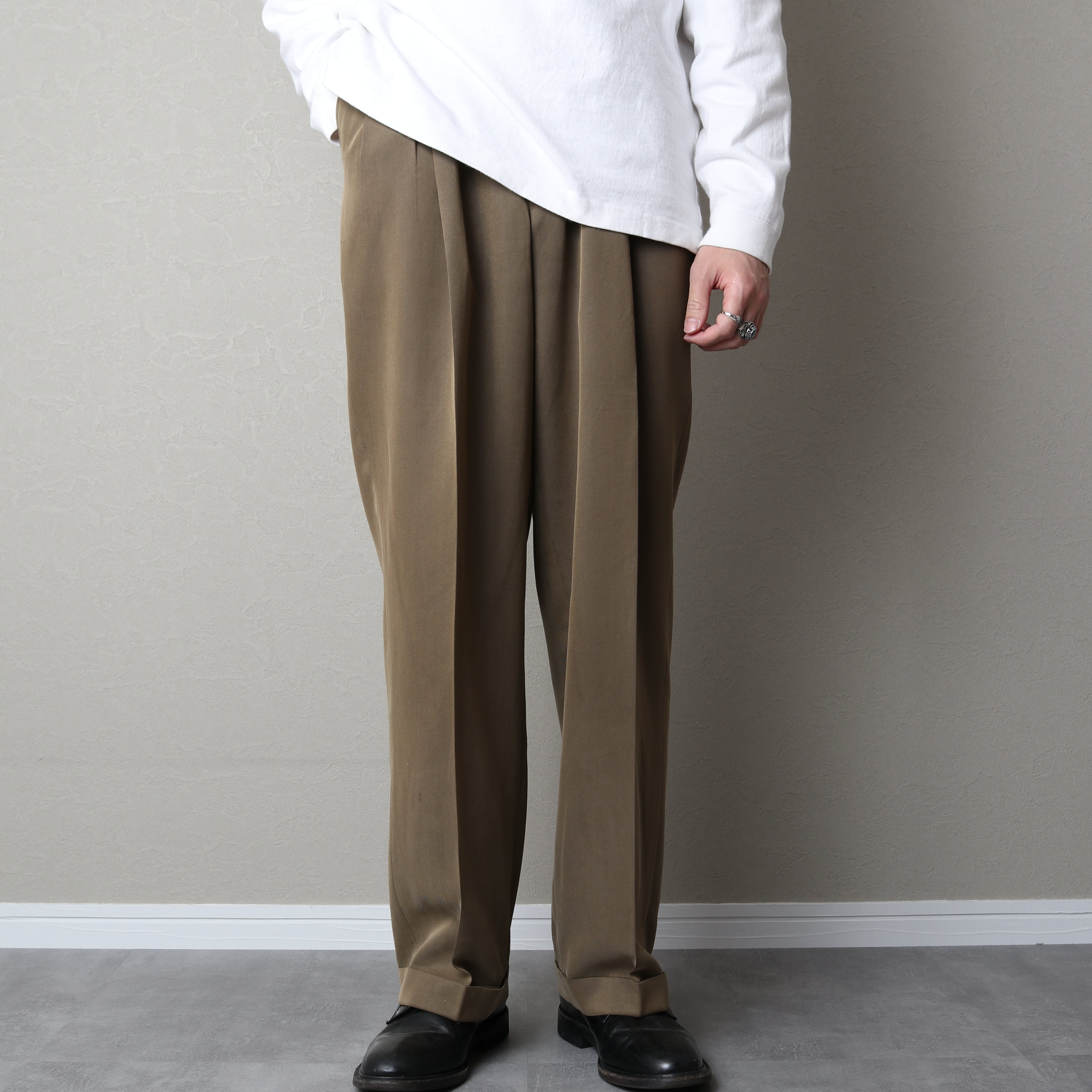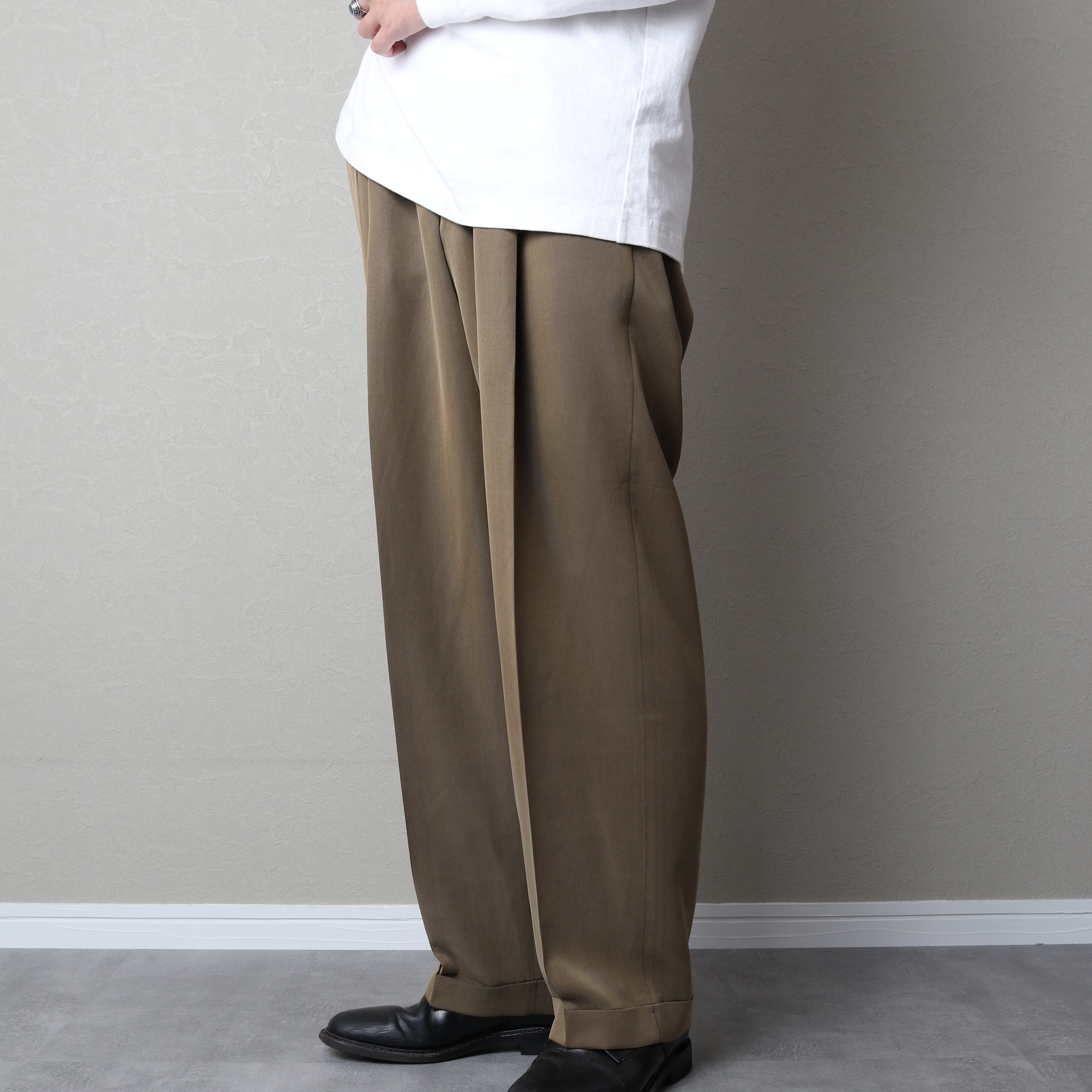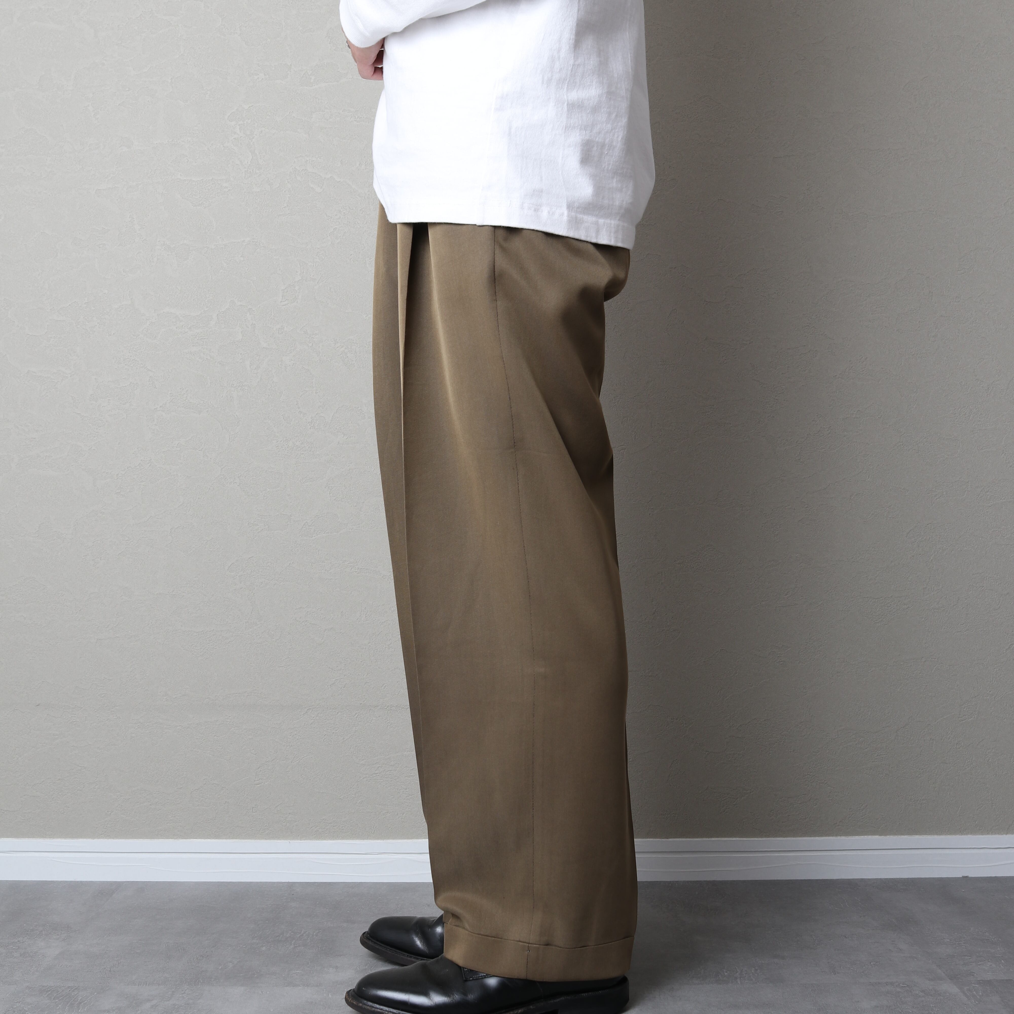 光沢のあるブラウンにツータックのワイドシルエットにダブル仕上げとクラシックな仕様。