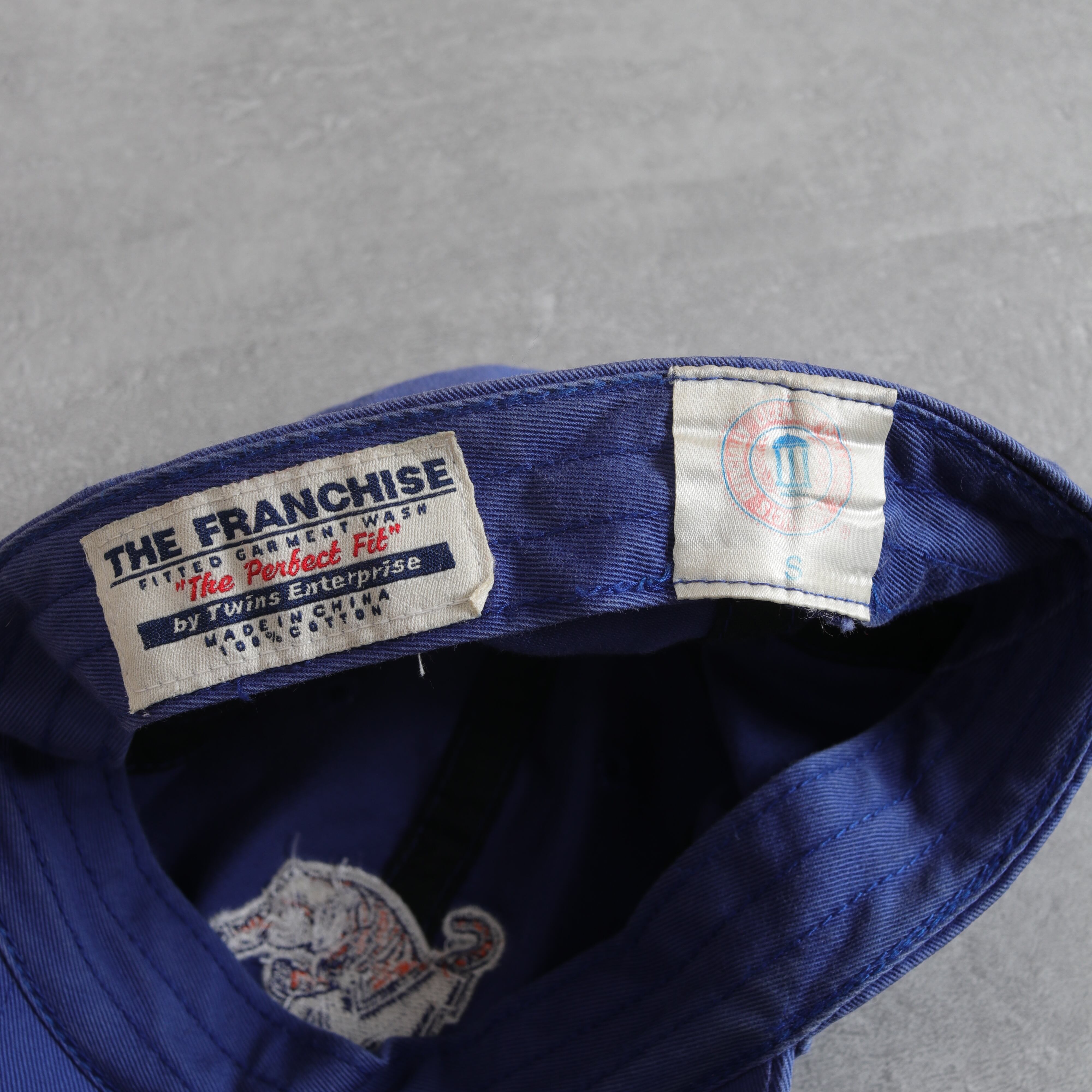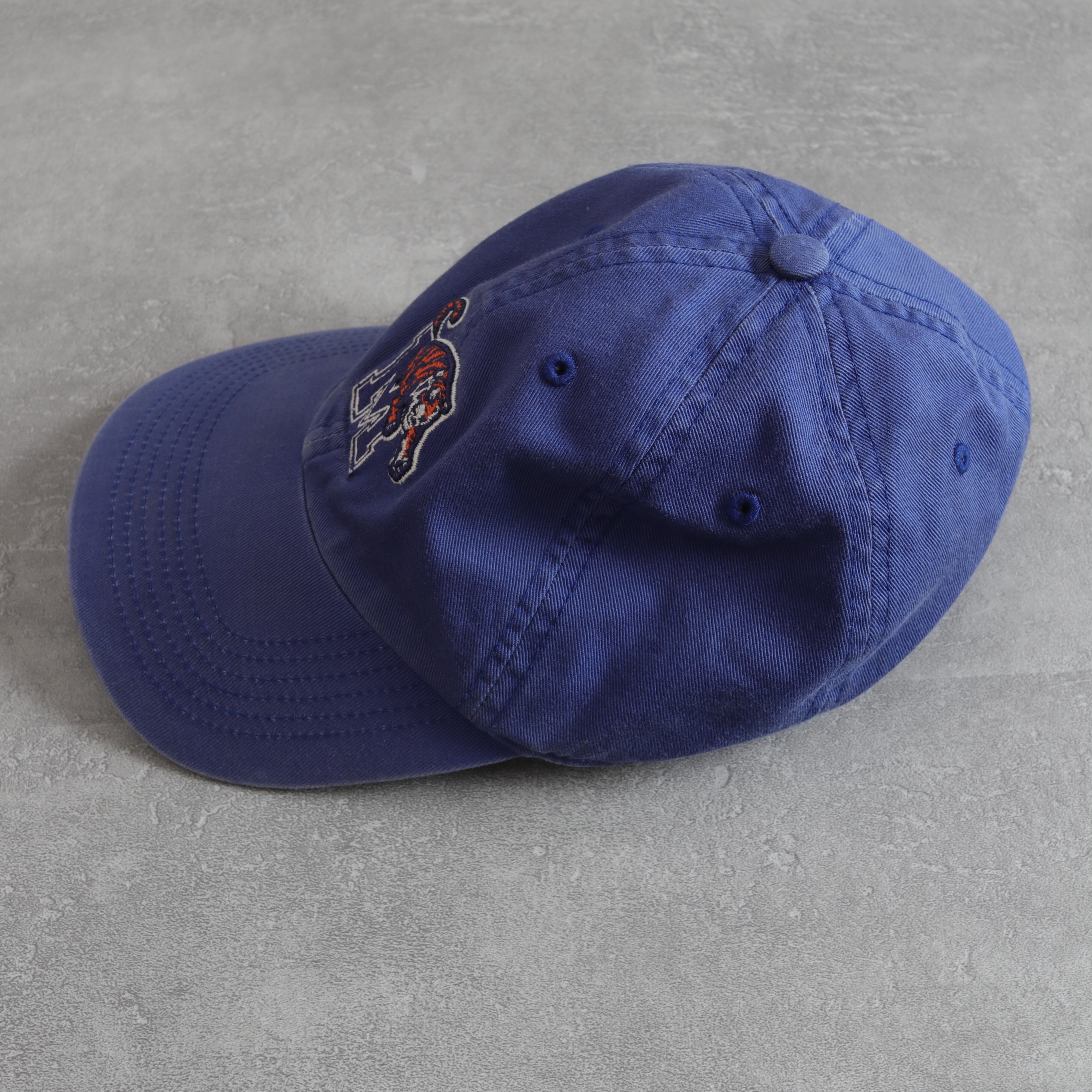 気持ちよく色落ちしたブルーの6パネルキャップ。カレッジロゴ入り。