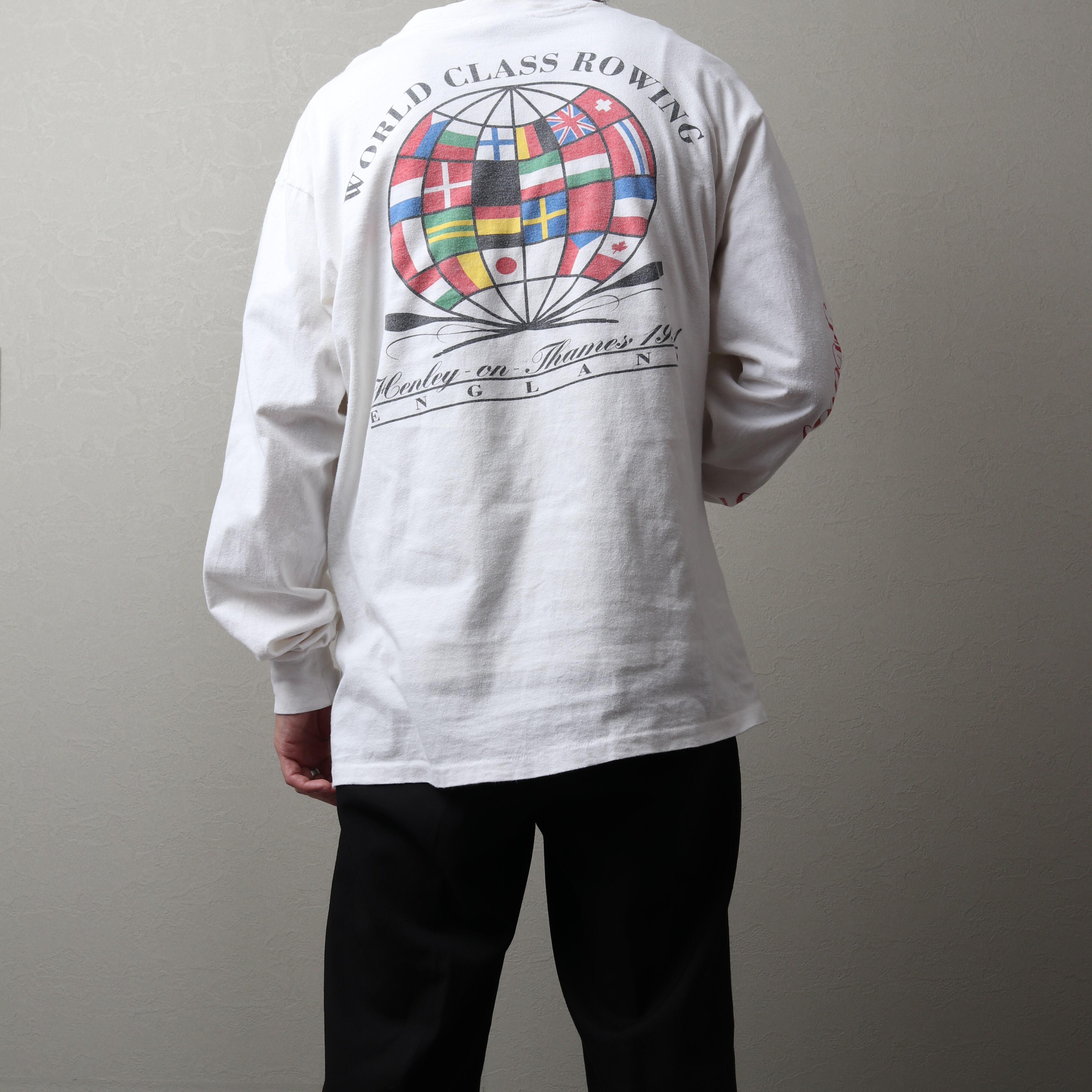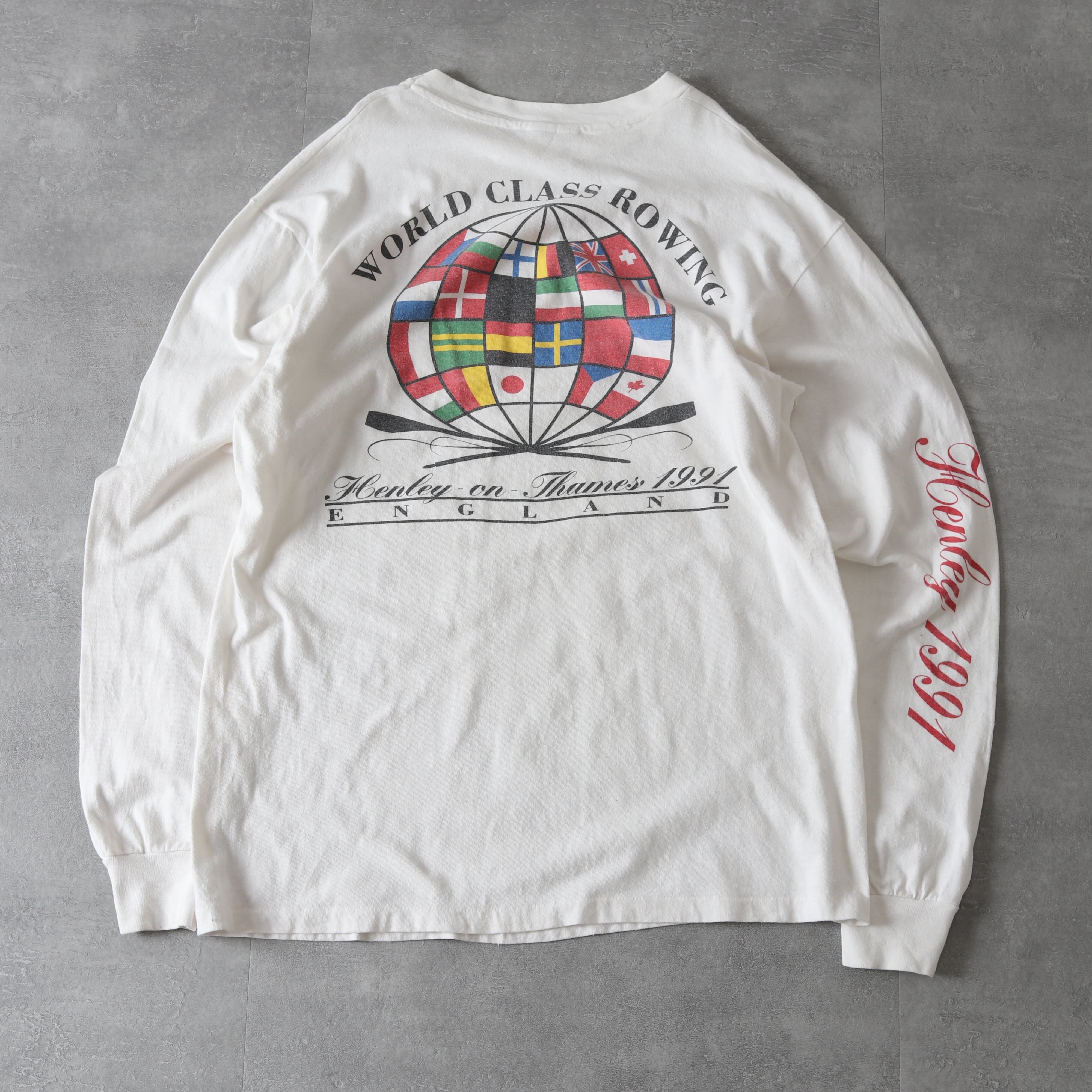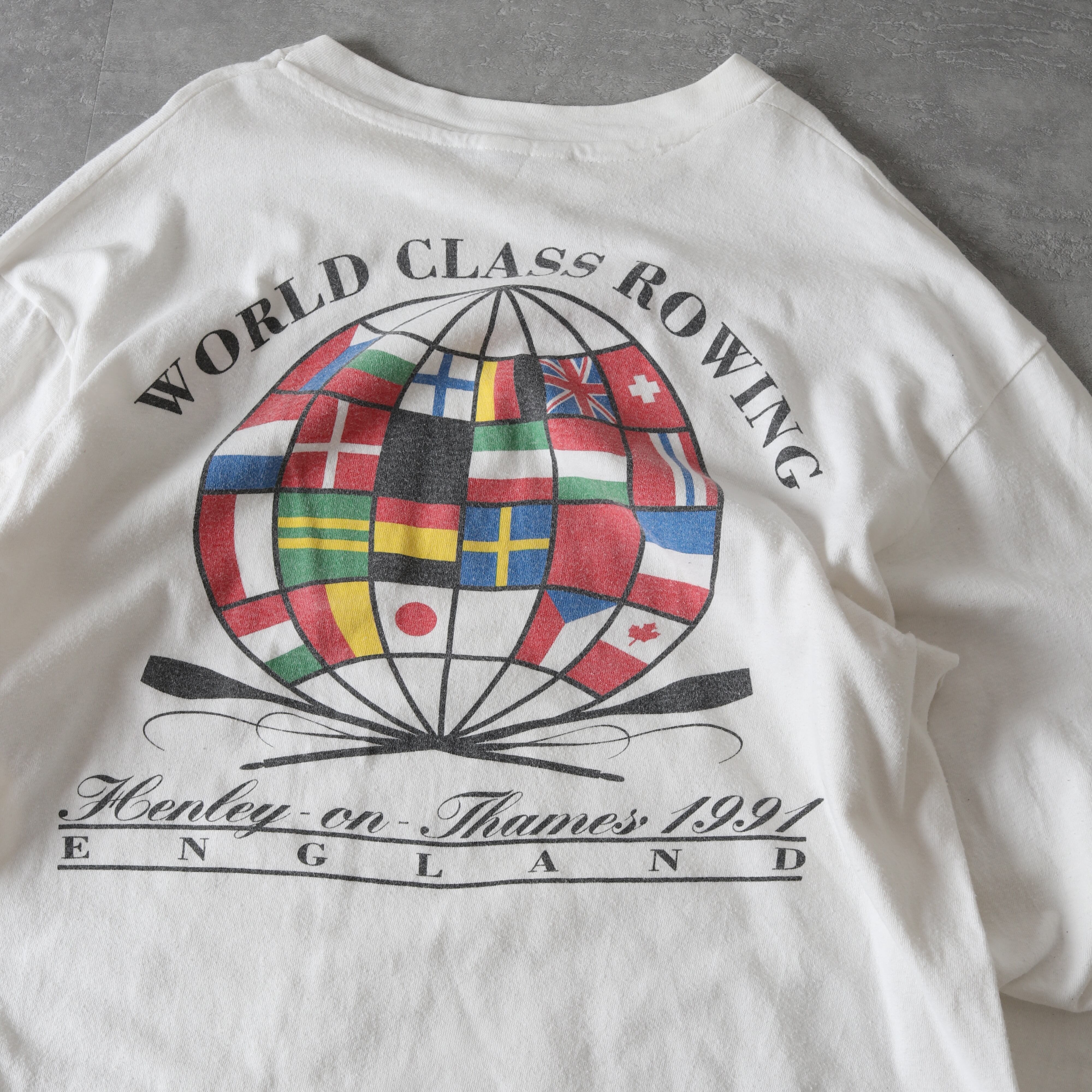 1991年のボート競技世界大会の際に制作されたものと思われ、両面+袖プリントが施されています。