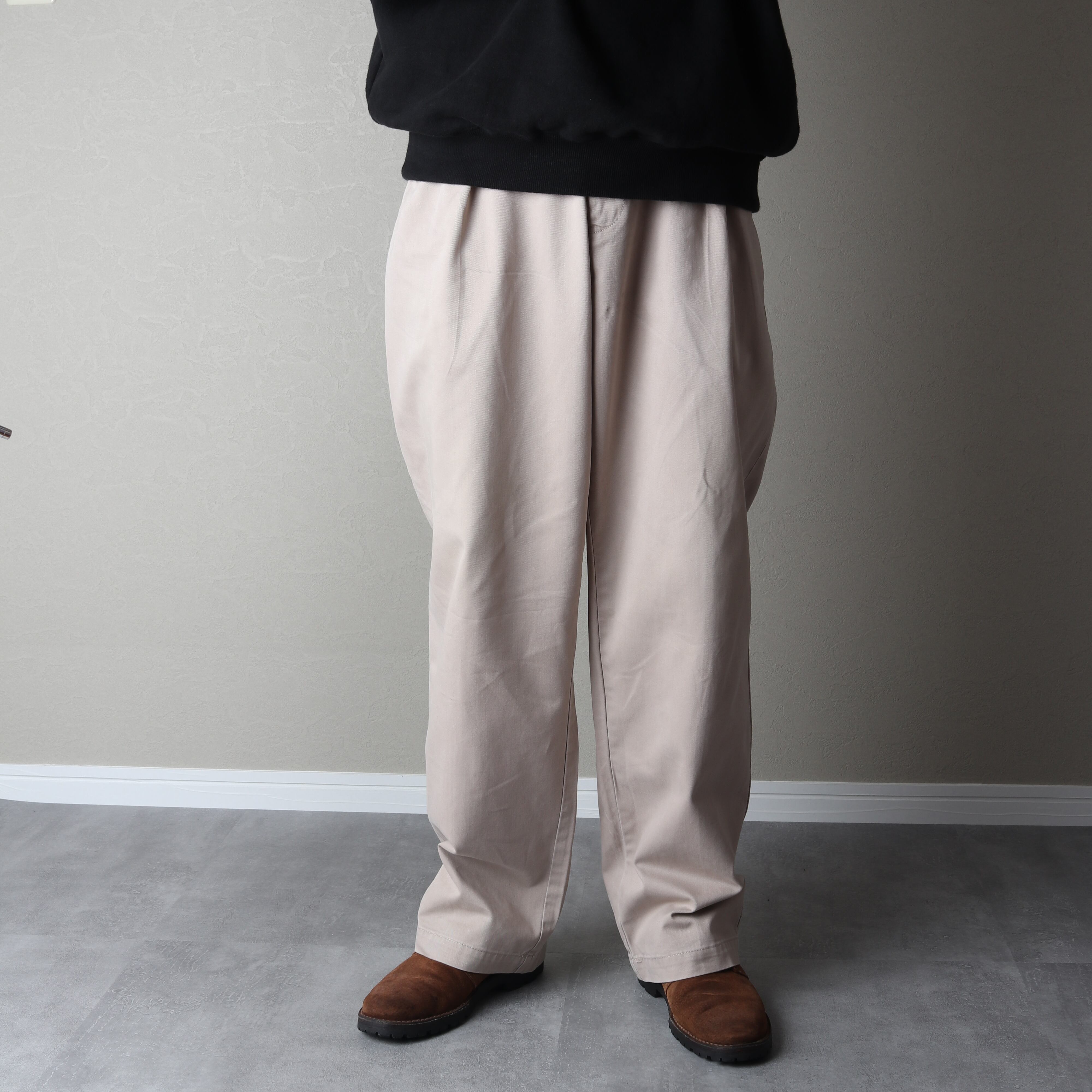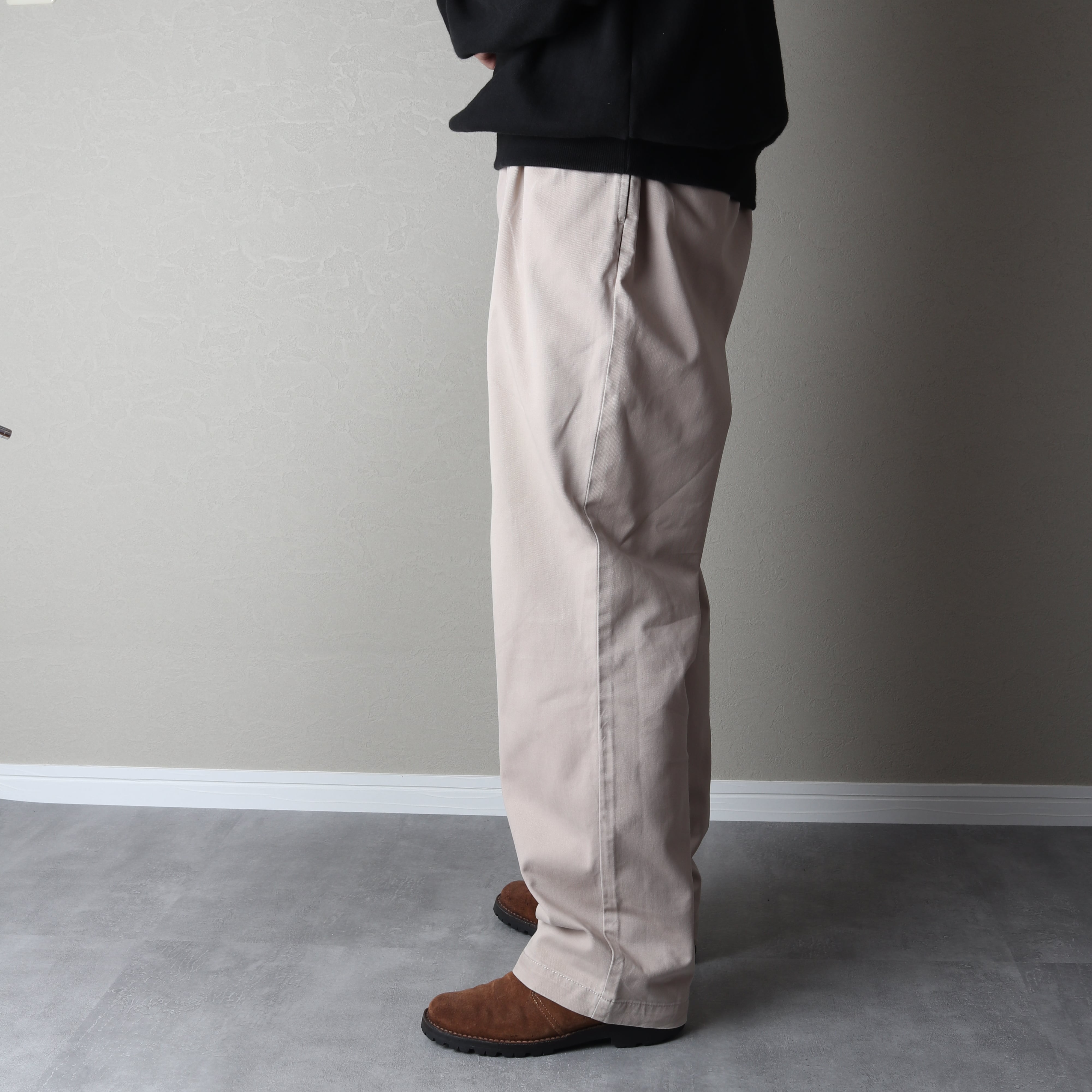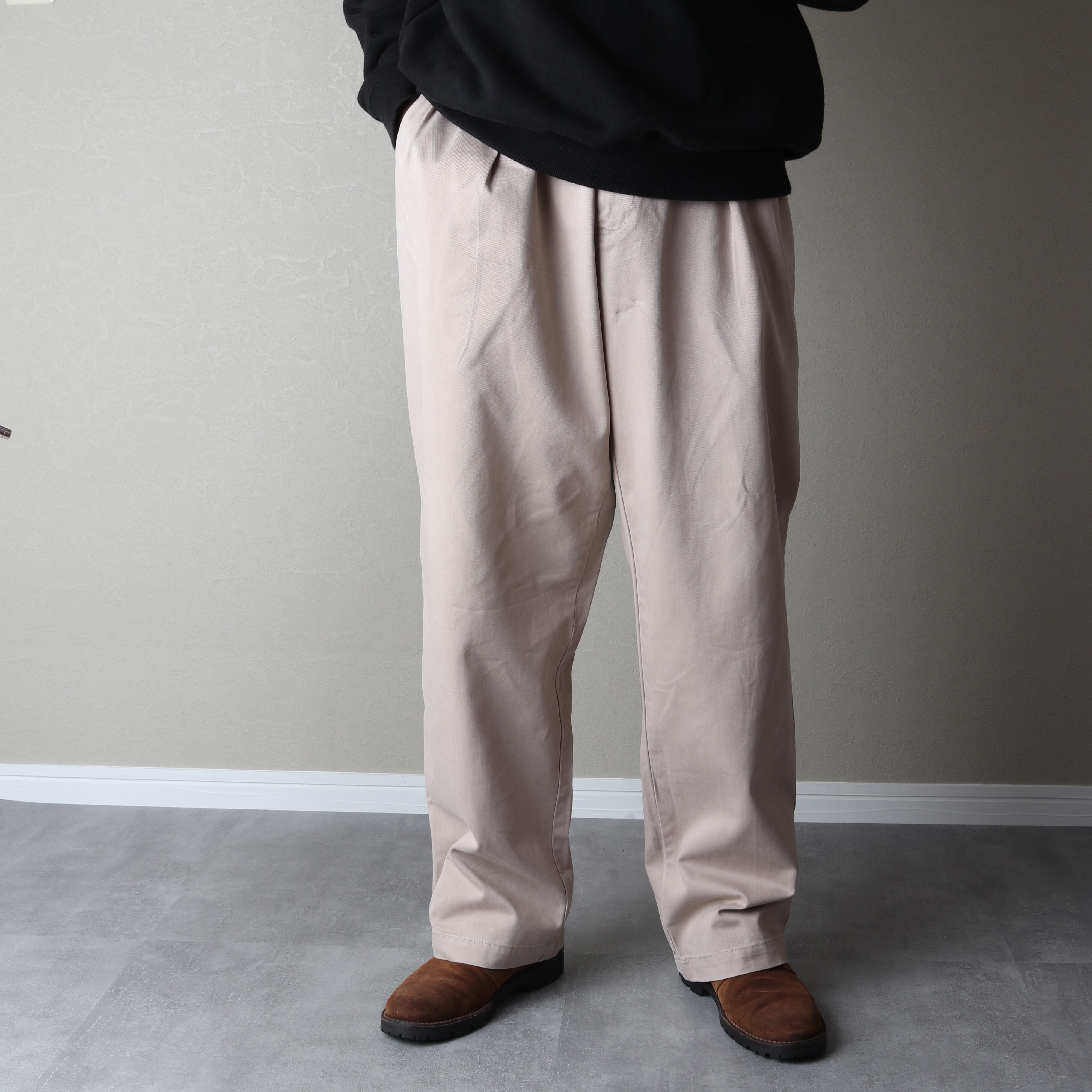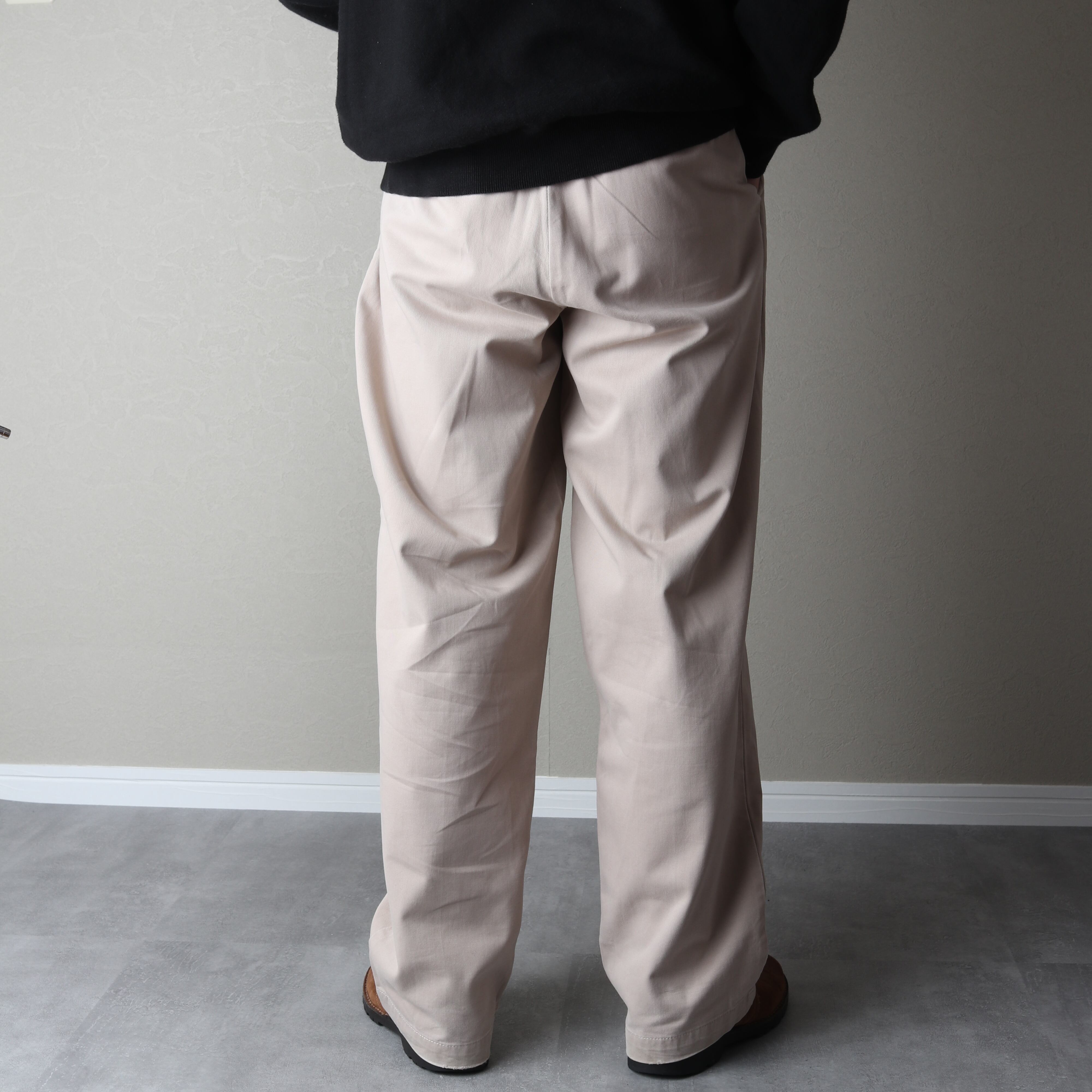 ツータックで腰回りにゆとりがあり、裾にかけてゆるいテーパードがかかっているのが特徴。