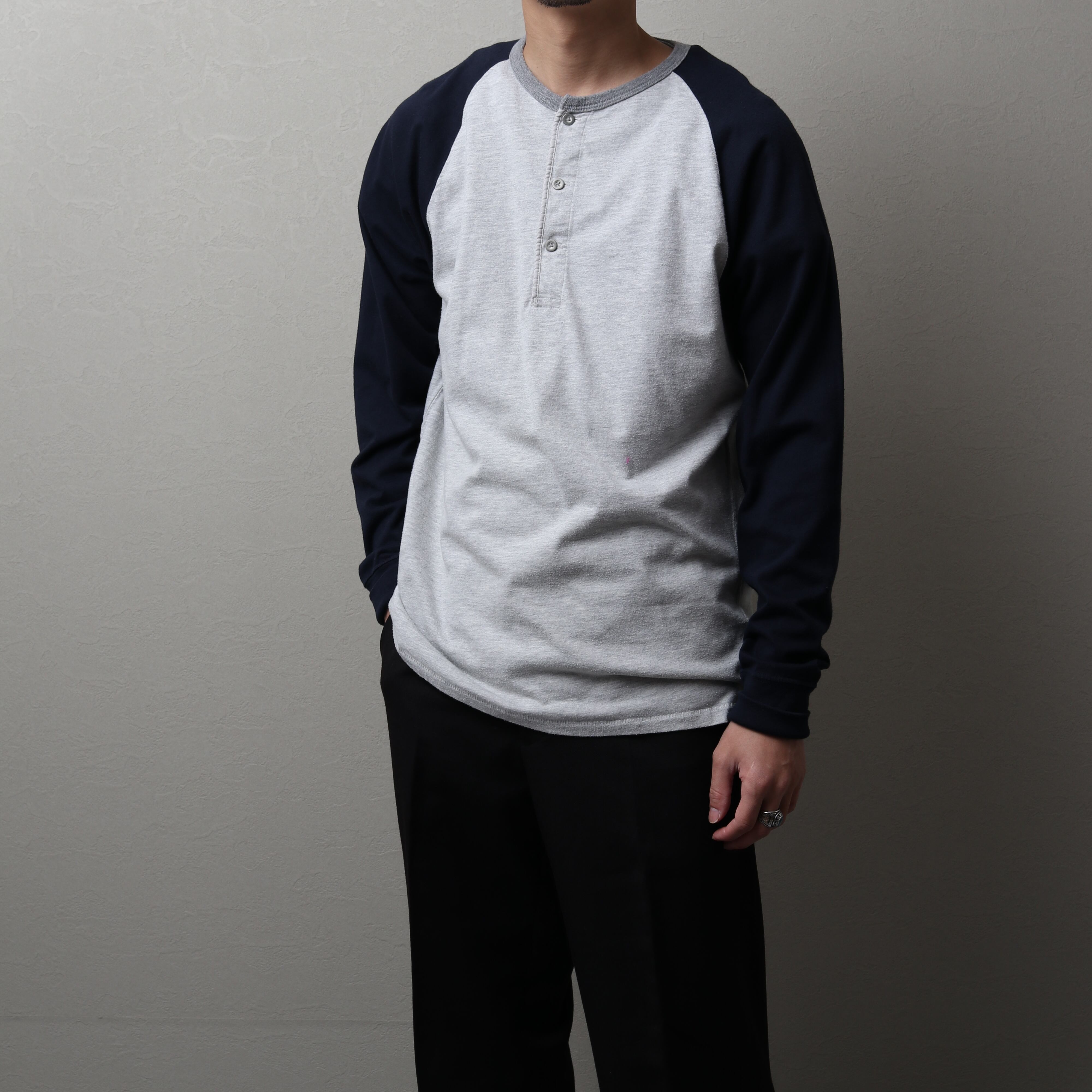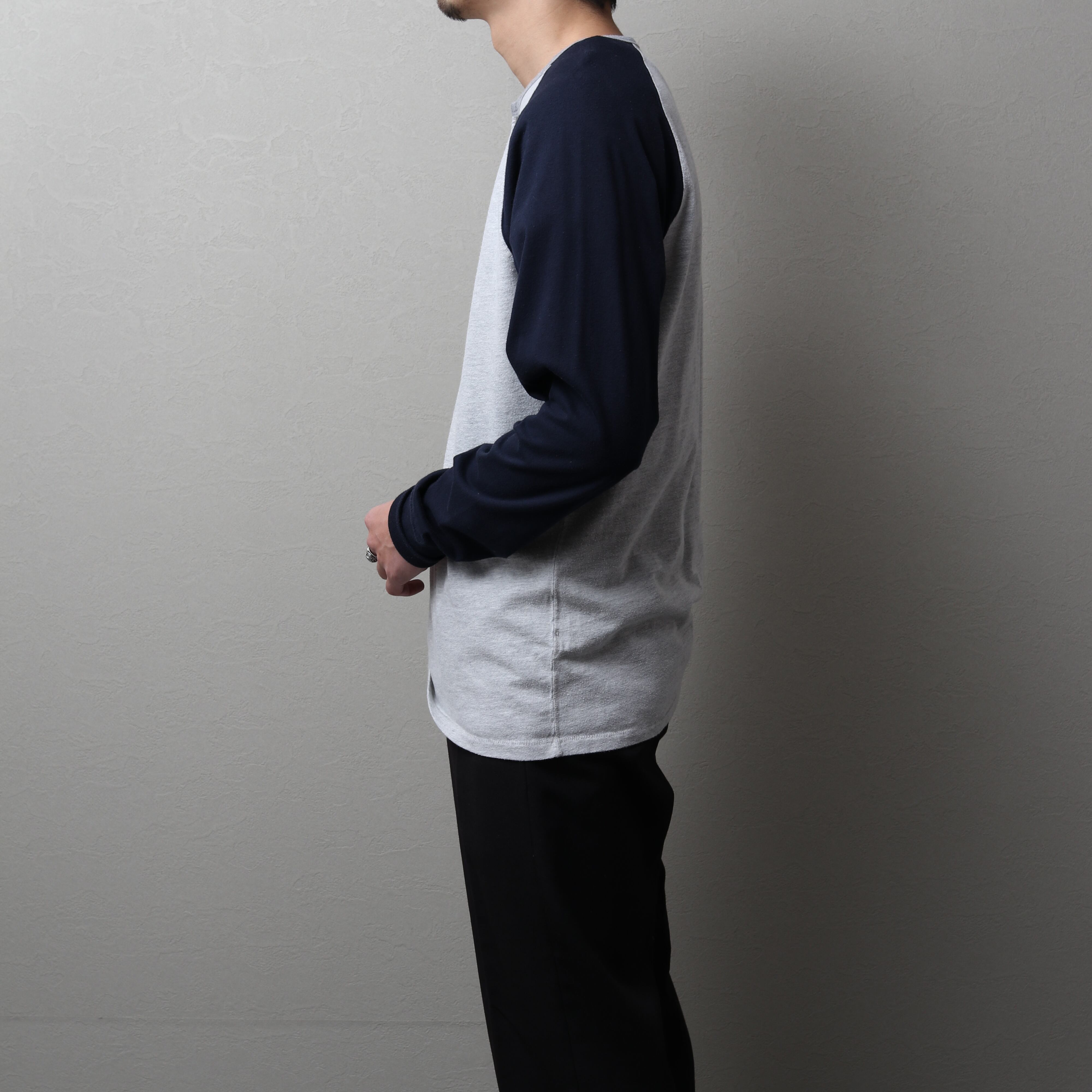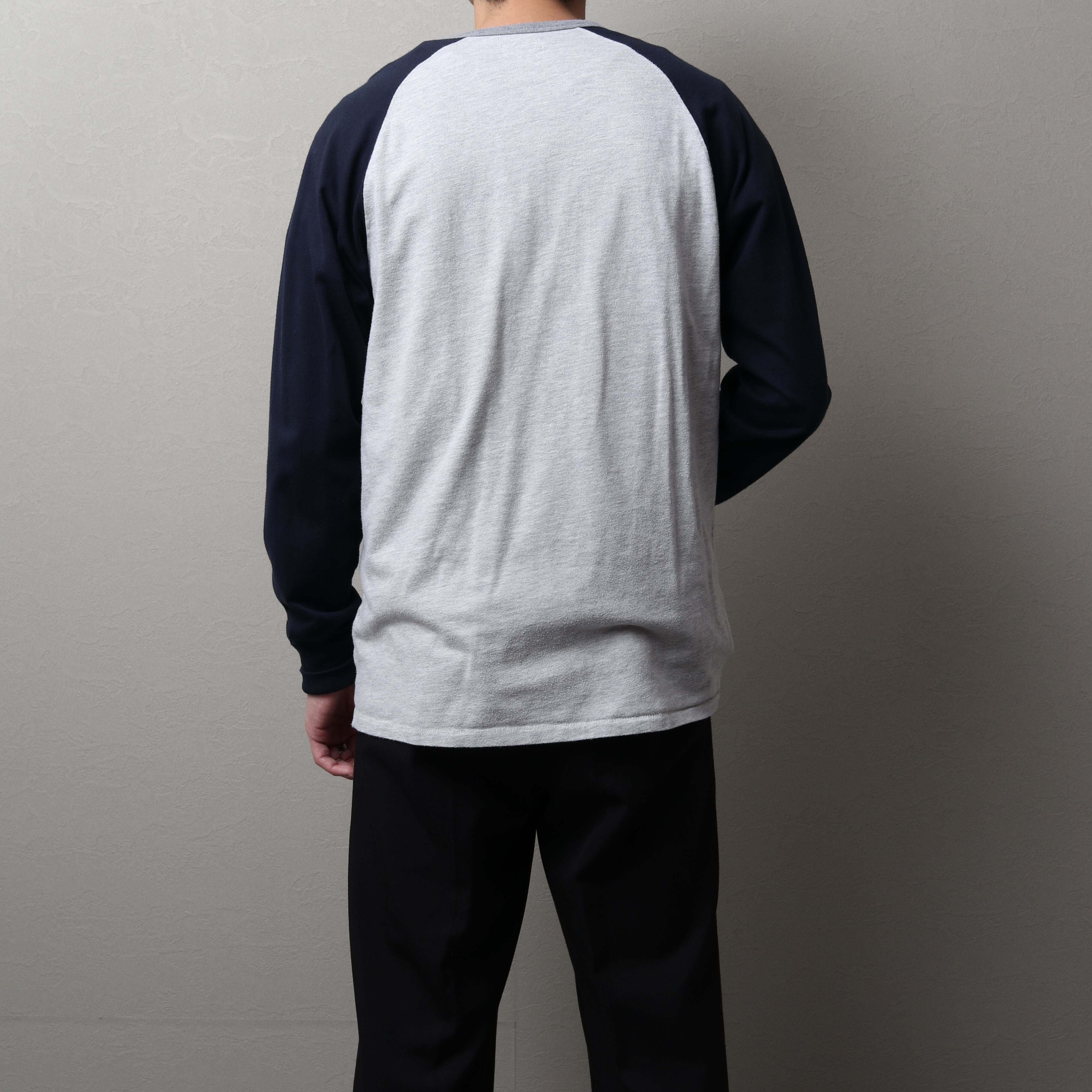 ラグランスリーブでボディとスリーブがツートーンになっているベースボールTタイプ。