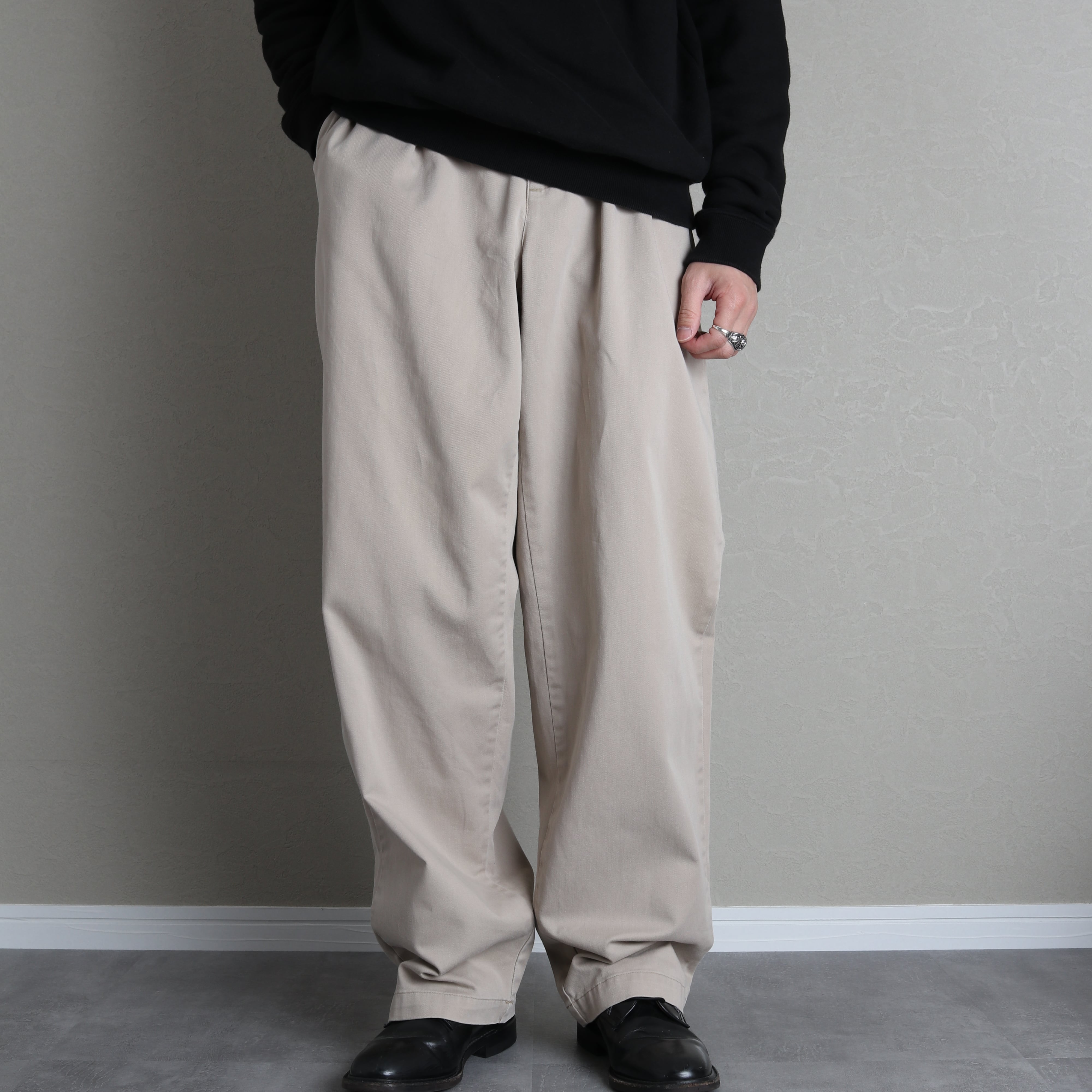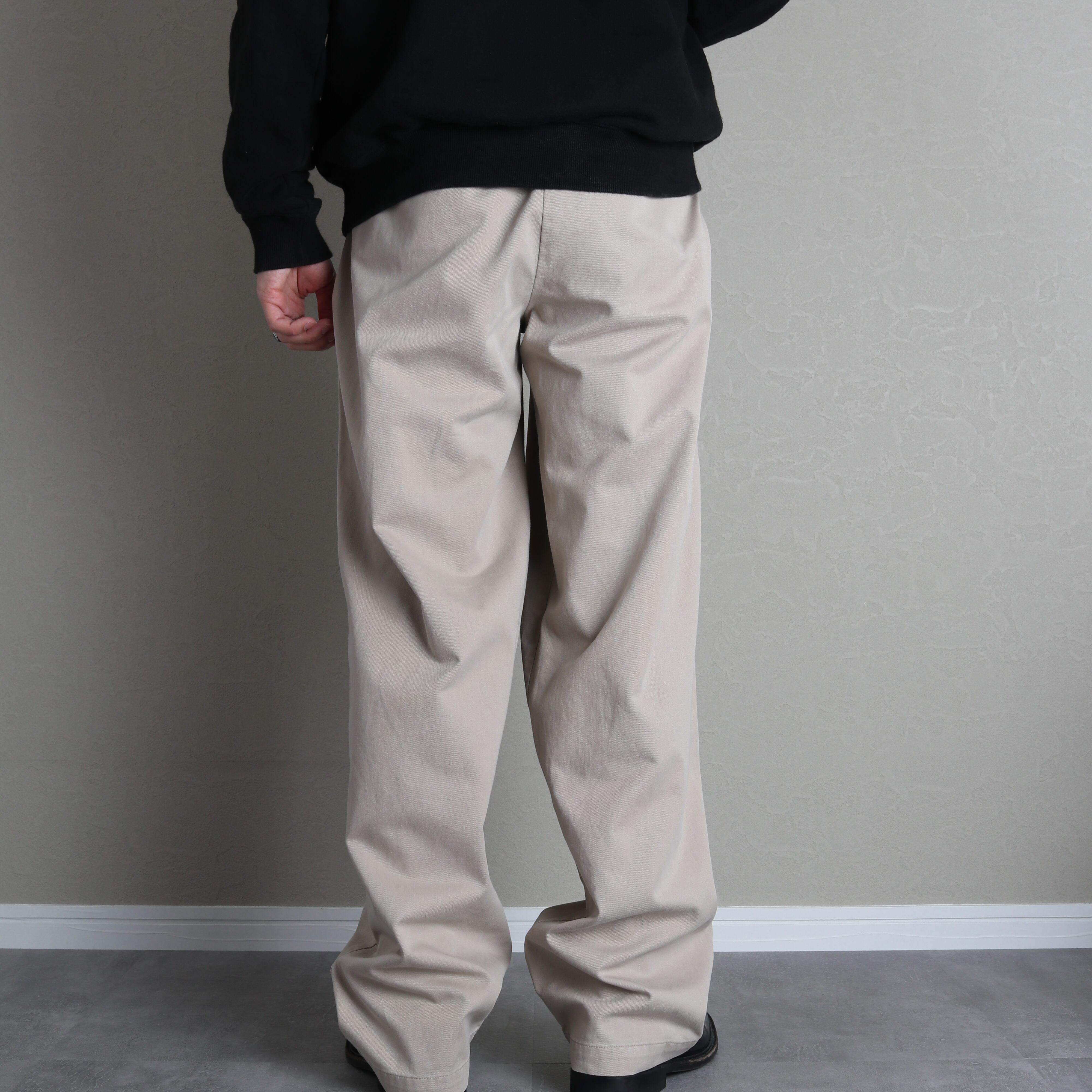 ツータックで腰回りにゆとりがあり、裾にかけてゆるいテーパードがかかっているのが特徴。