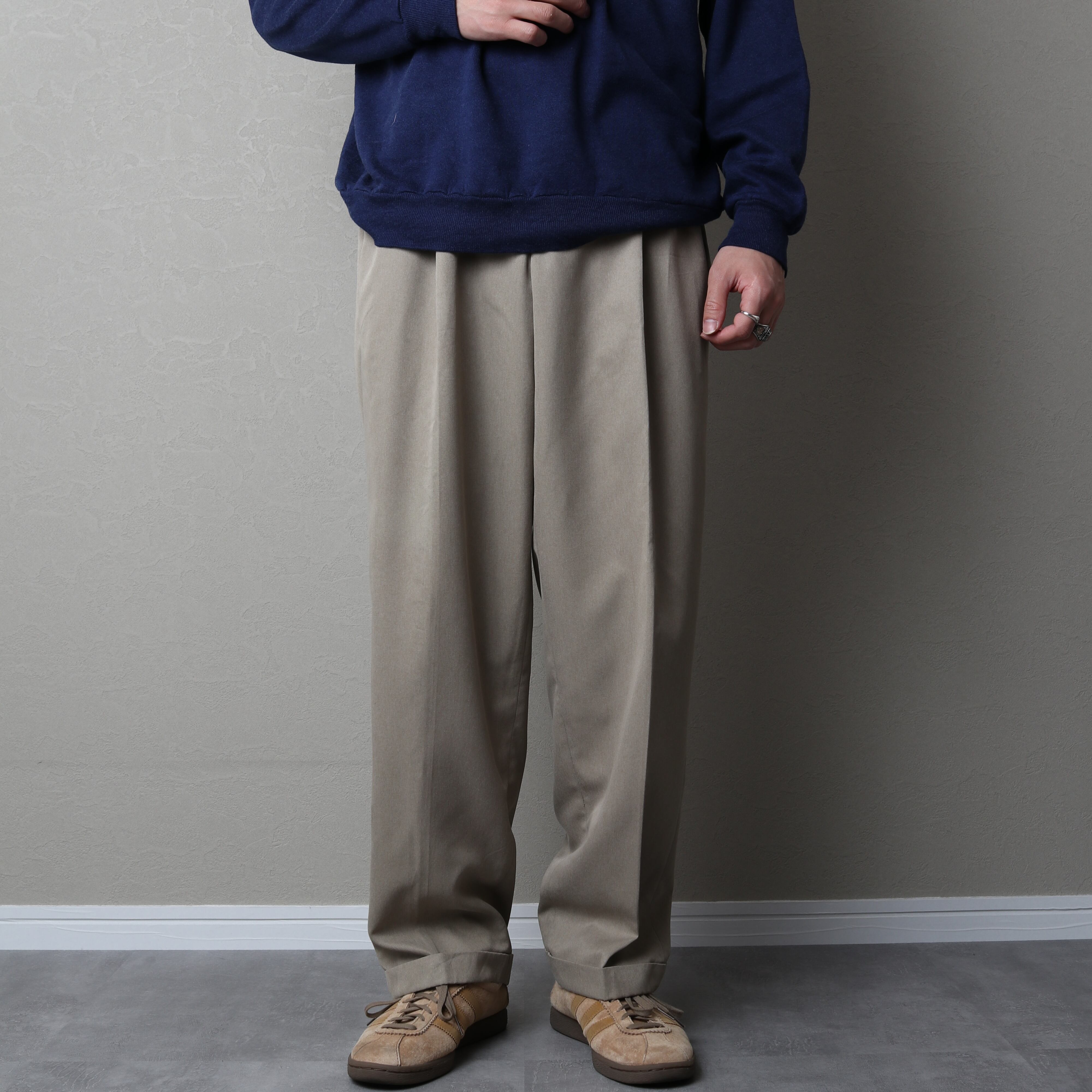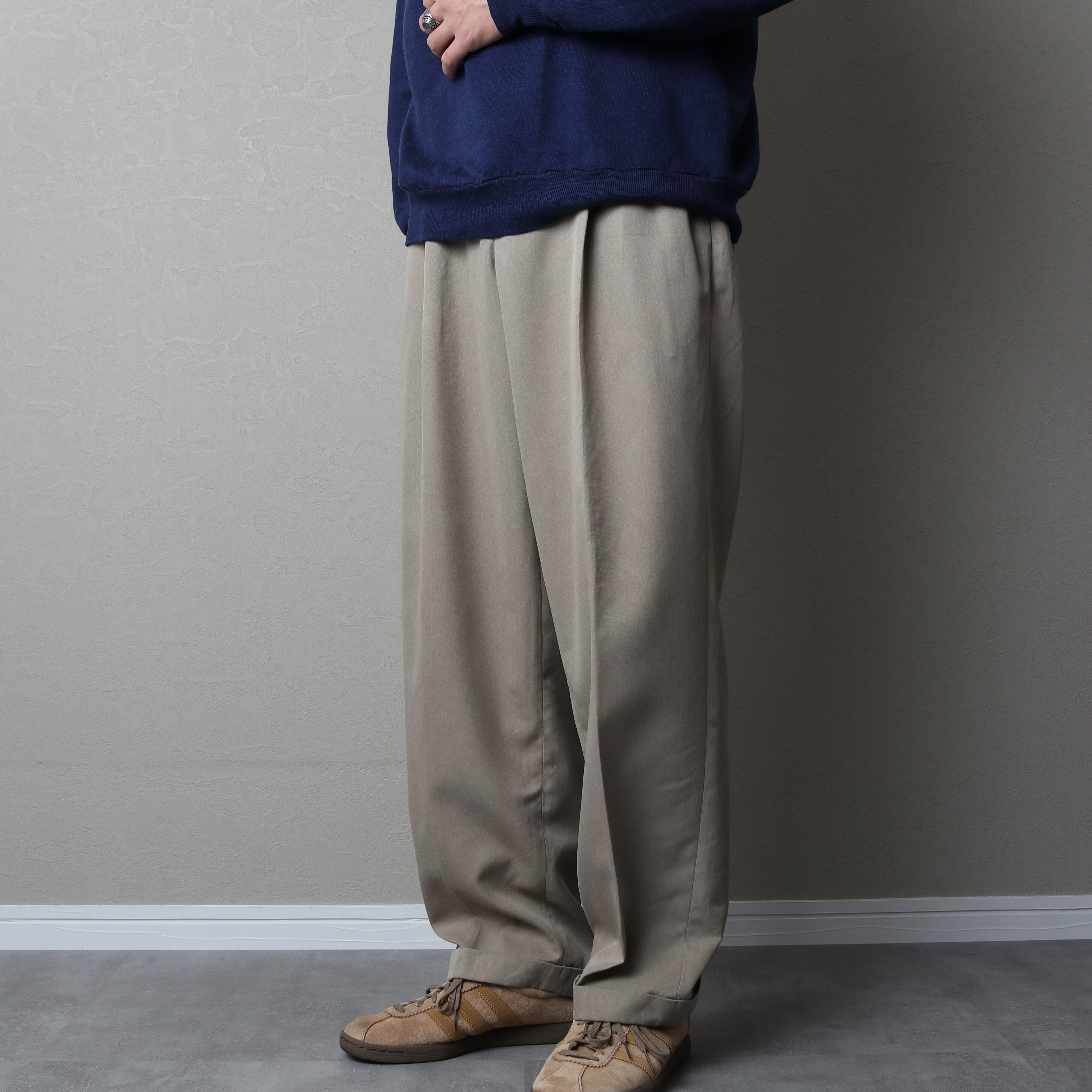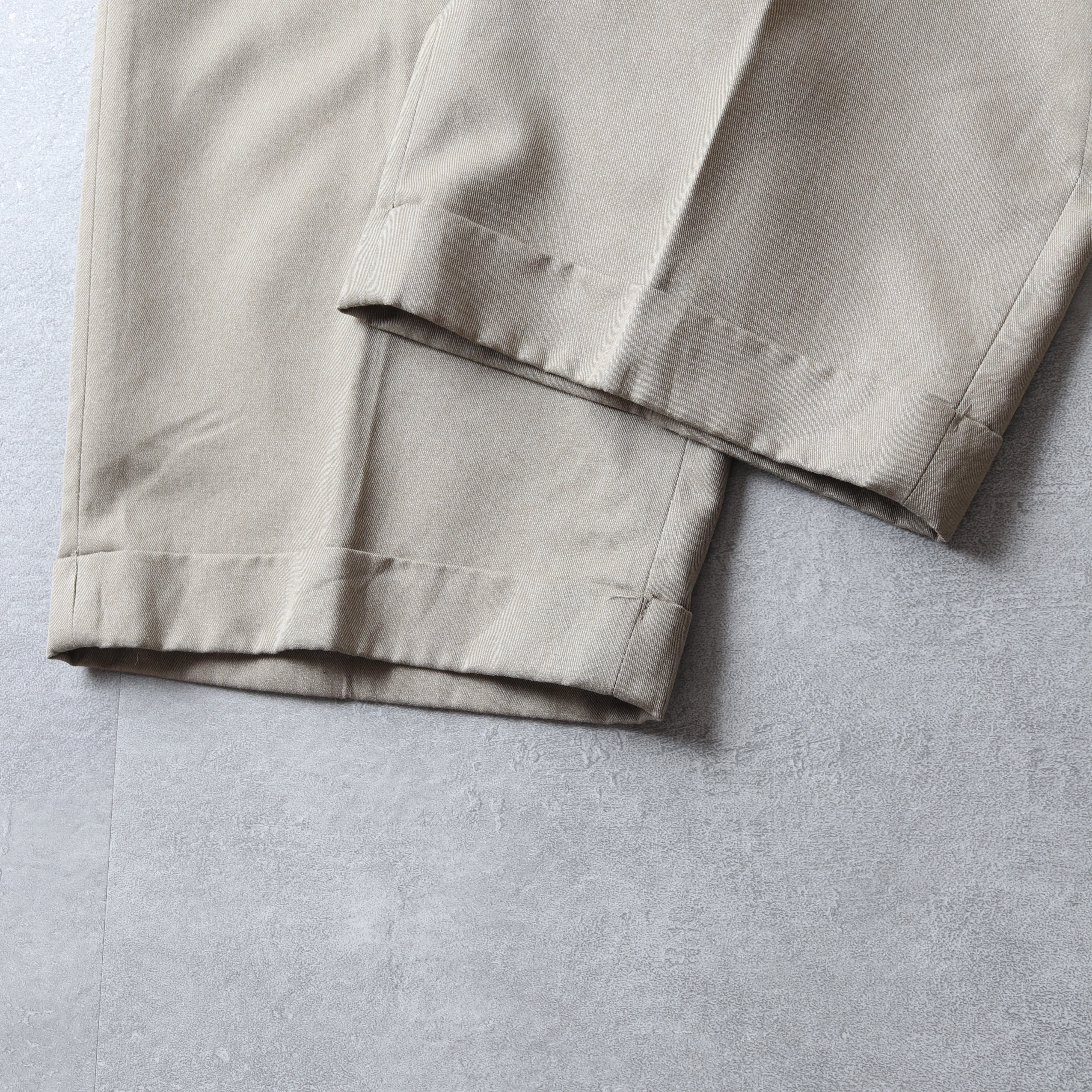 アウトプリーツで腰回りにゆとりがあるクラシカルなシルエットに裾はダブル仕上げです。