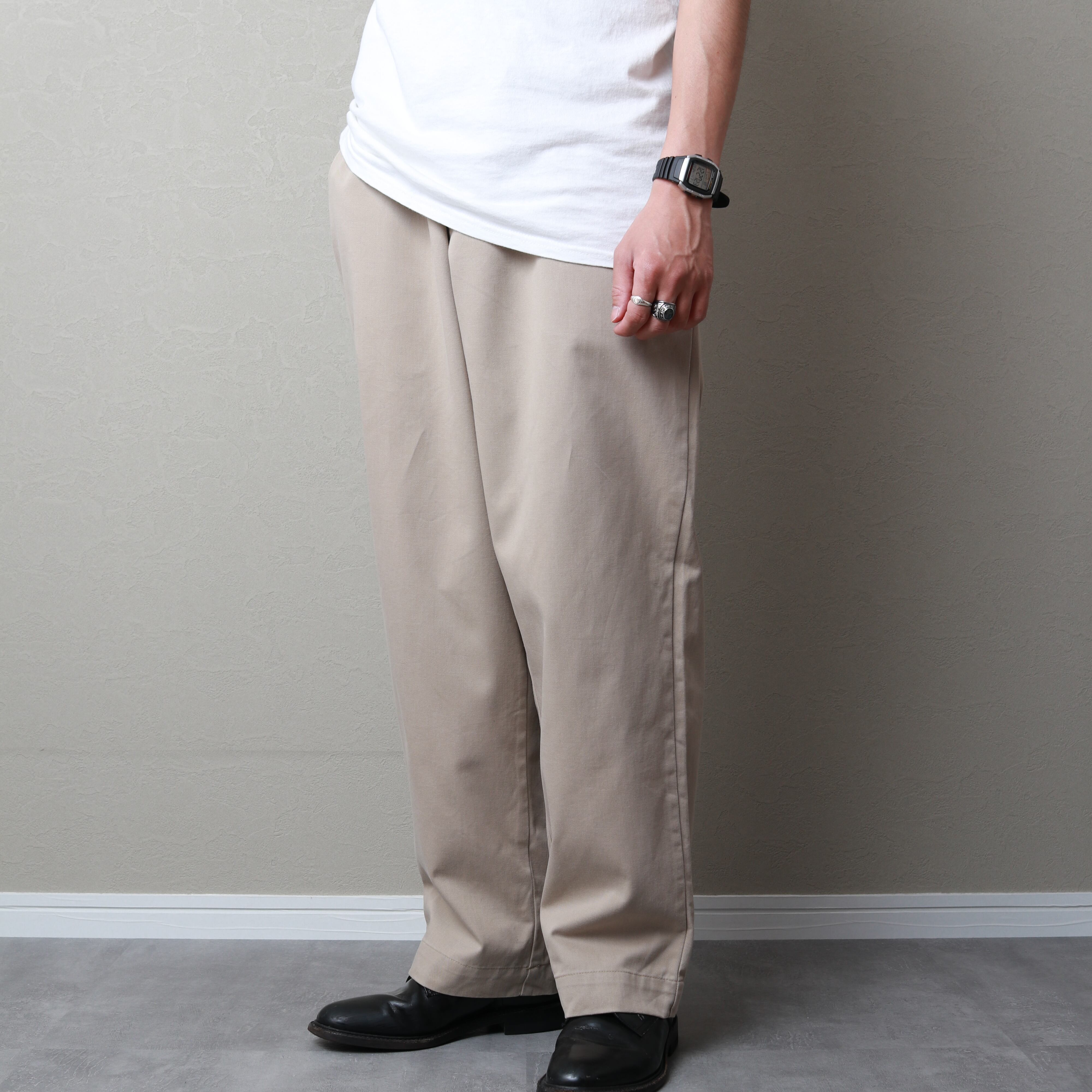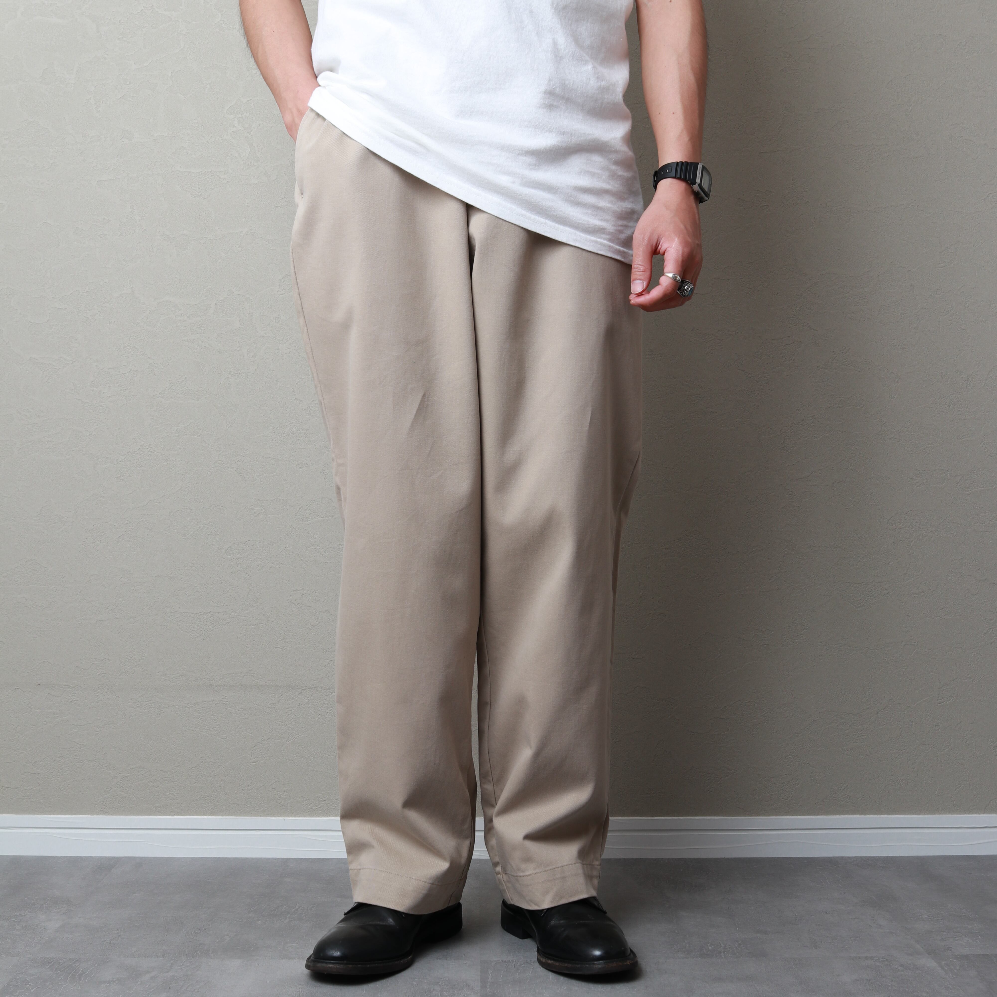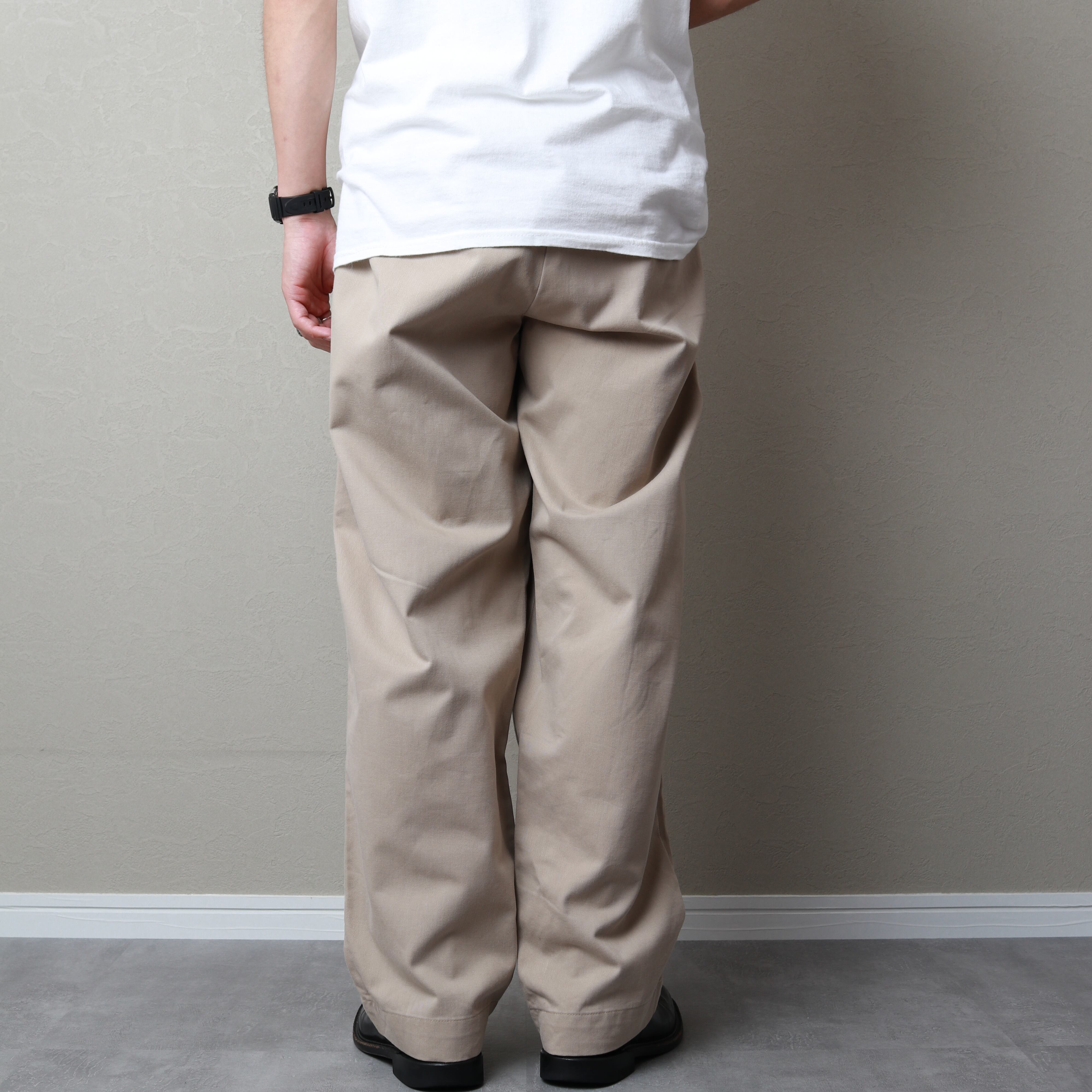 こちらはノータック。ワイドシルエットで裾にかけてゆるいテーパードがかかっているPHILIP PANTSというモデル。