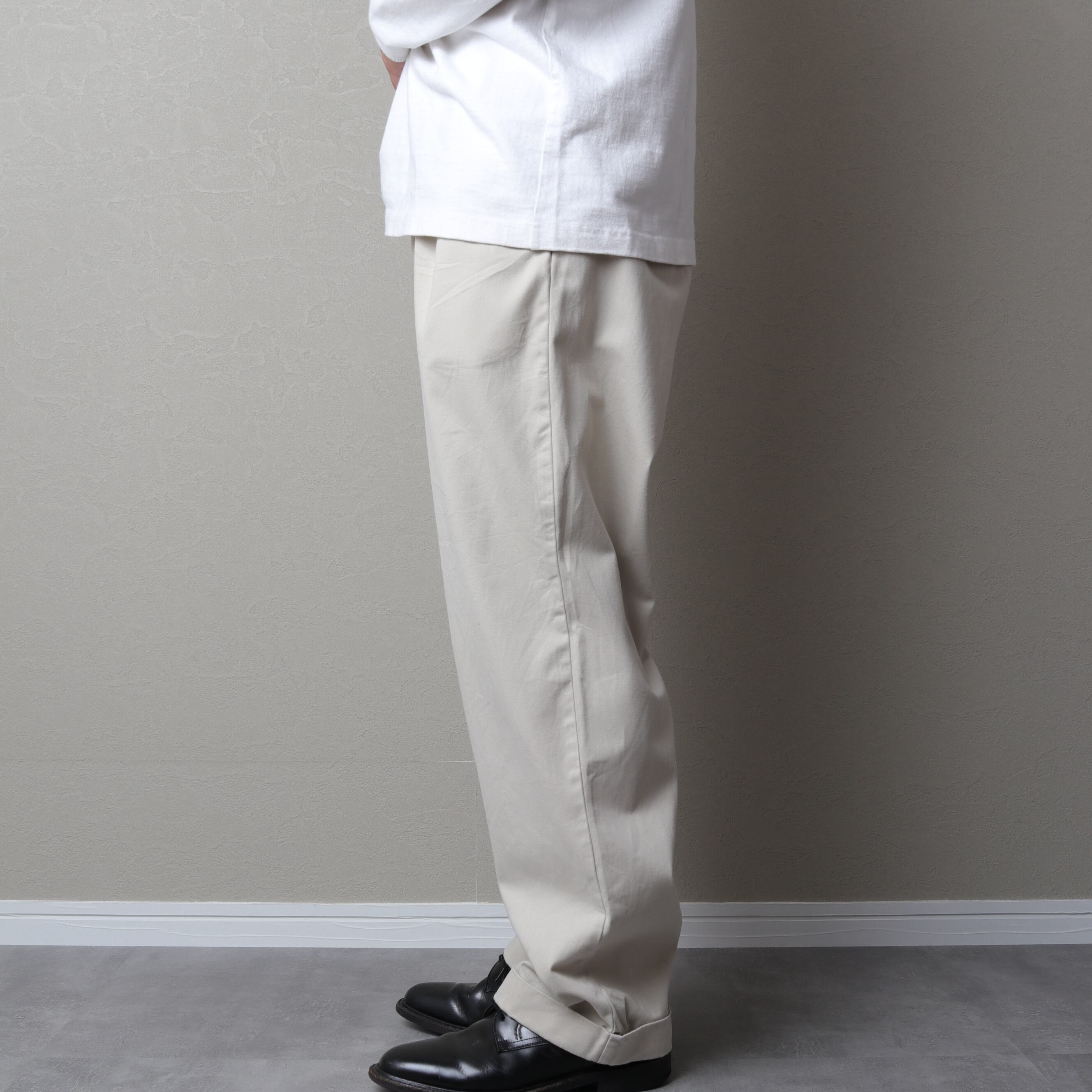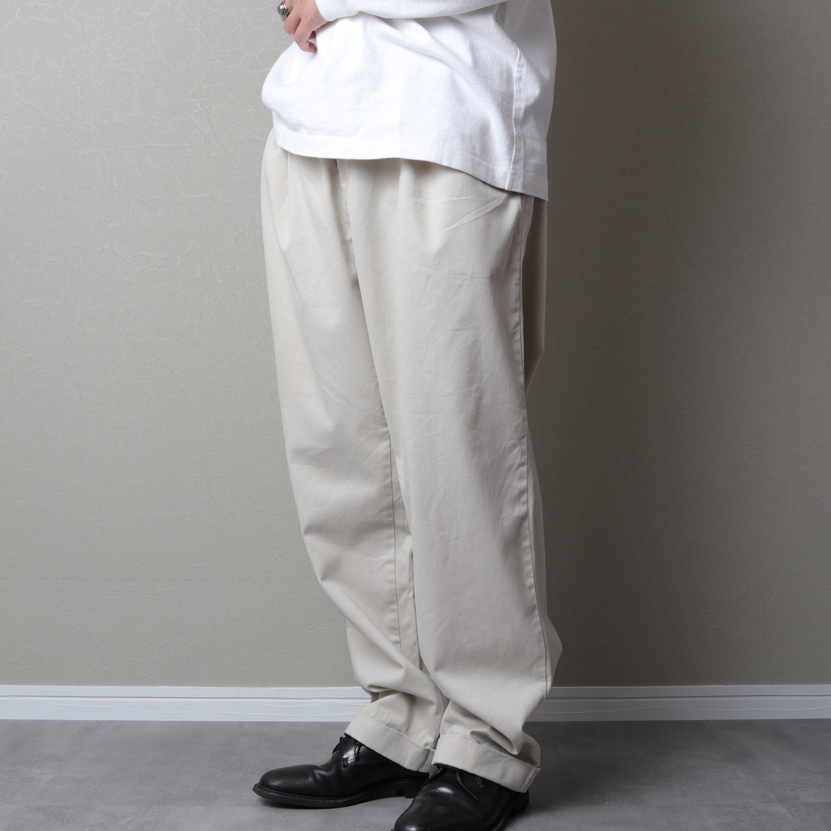 アウトプリーツのツータックで腰回りにゆとりがあり、裾にかけてゆるいテーパードがかかっているのが特徴。