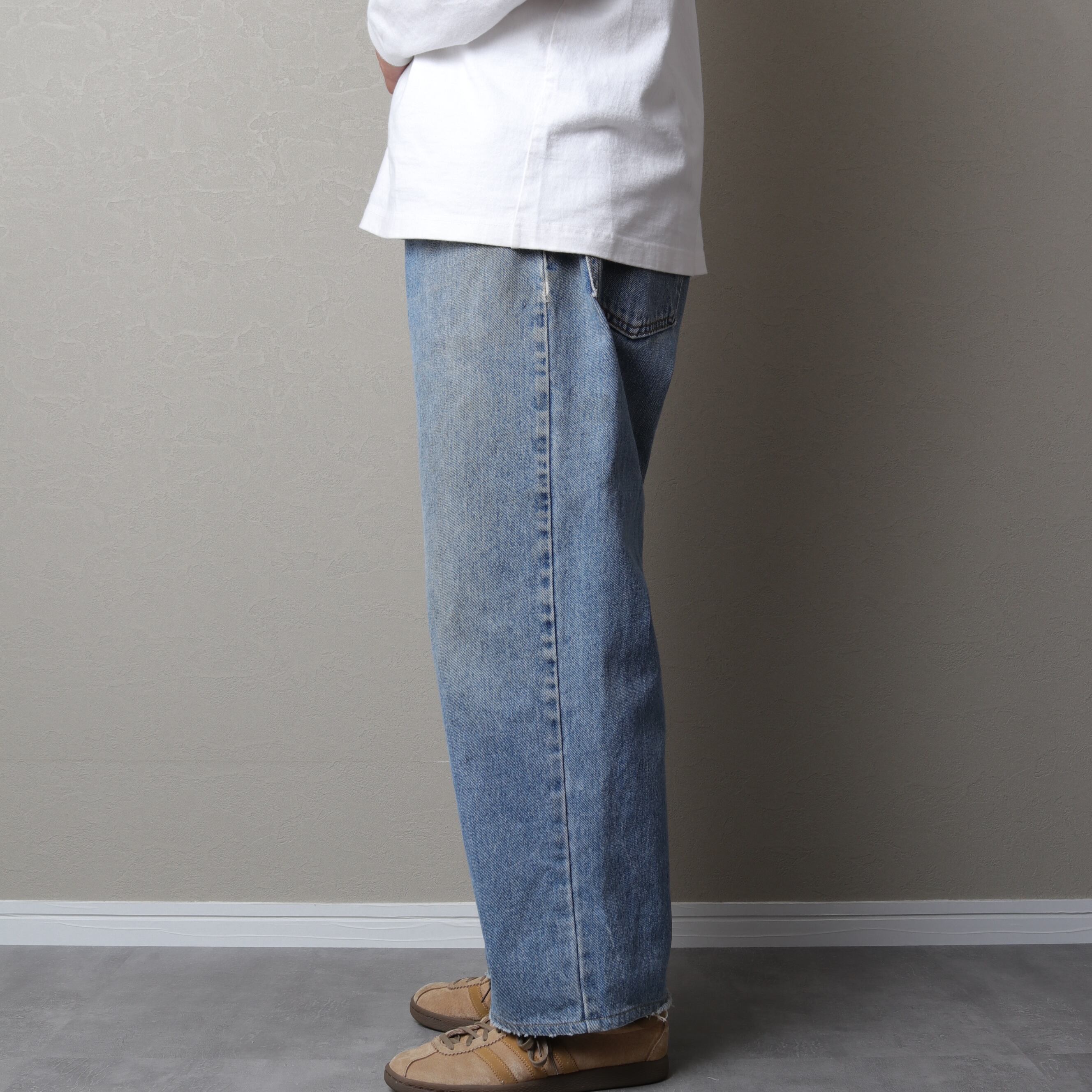 広い渡りと深い股上で腰回りにゆとりがあり、裾にかけてテーパードがかかっているシルエット。