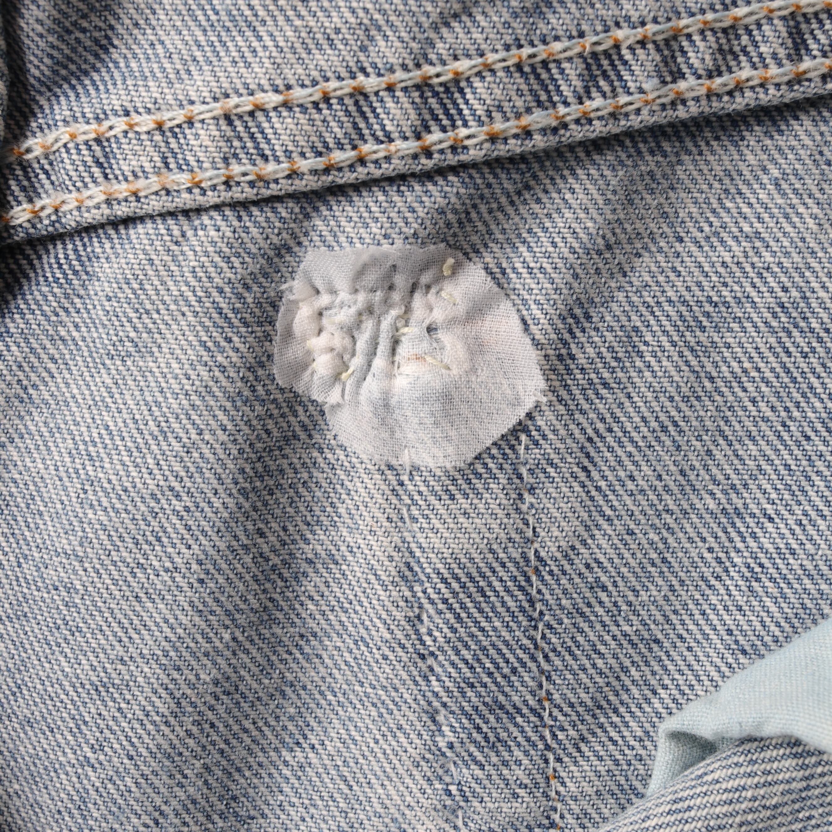 裾にダメージ、背面左ポケットにリペア痕があります