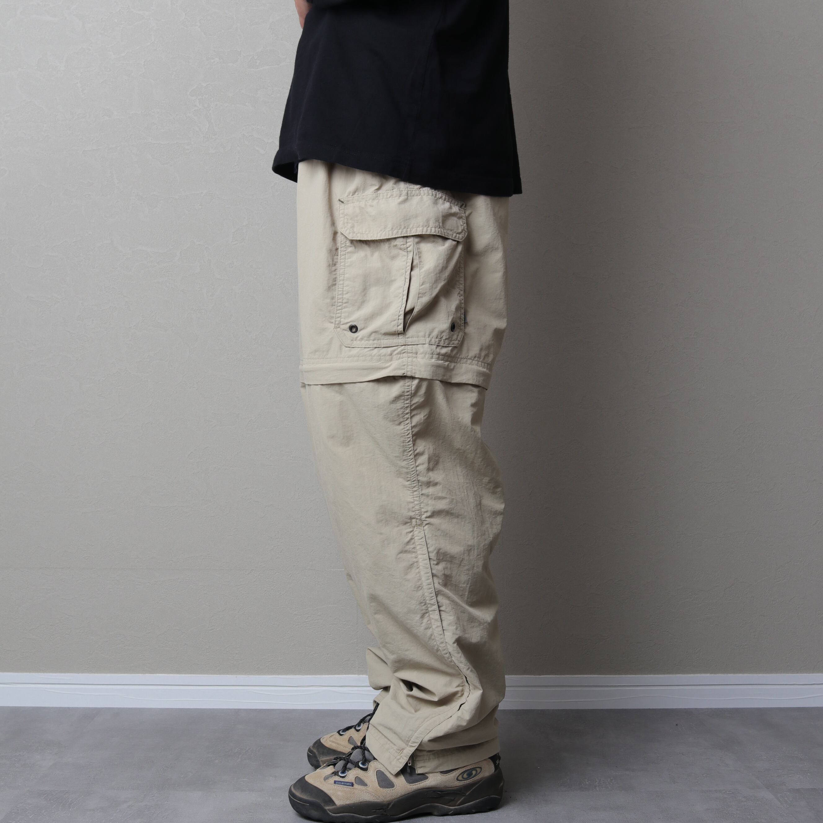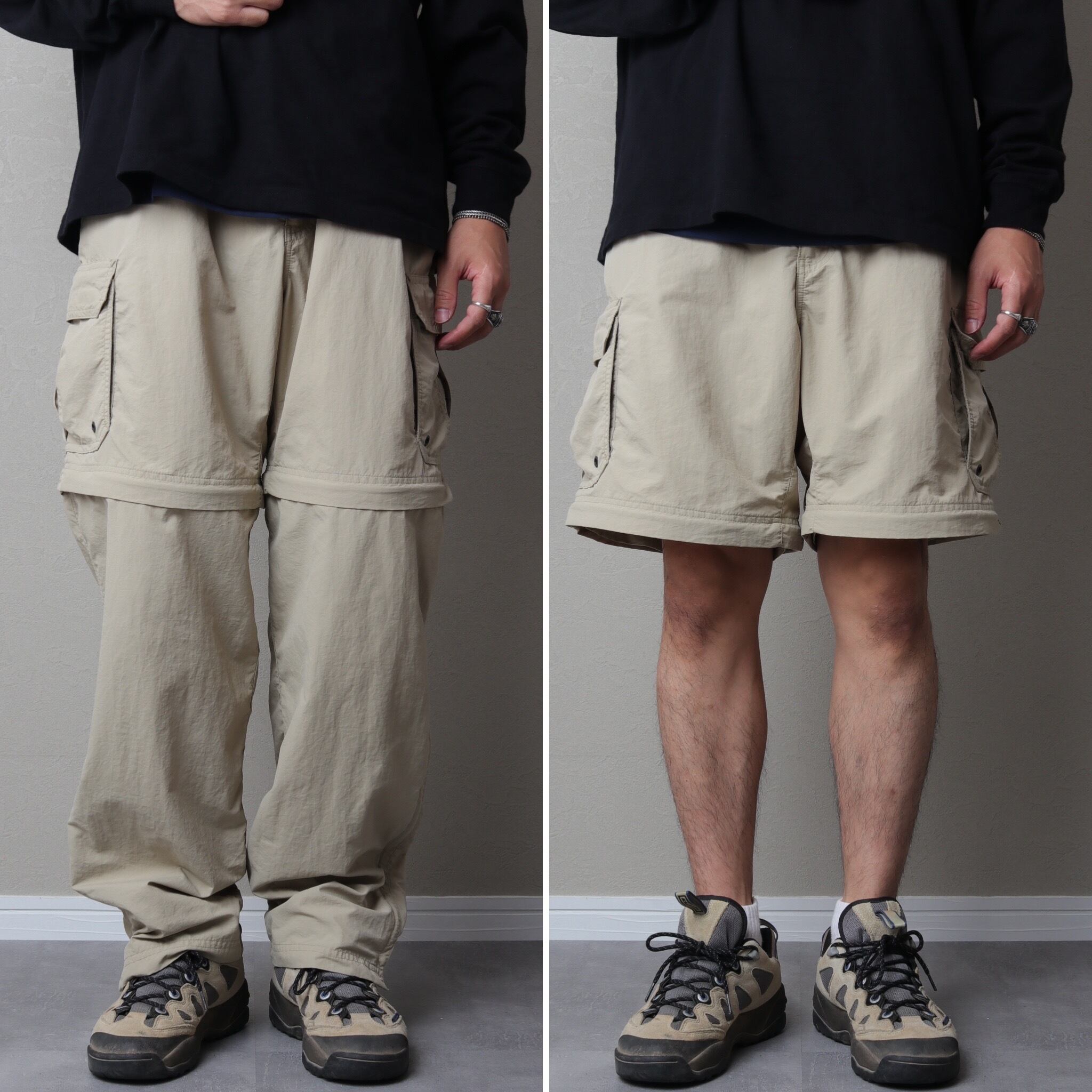 外さない状態だと太めのカーゴパンツとして扱え、外すと渡り幅もあるため