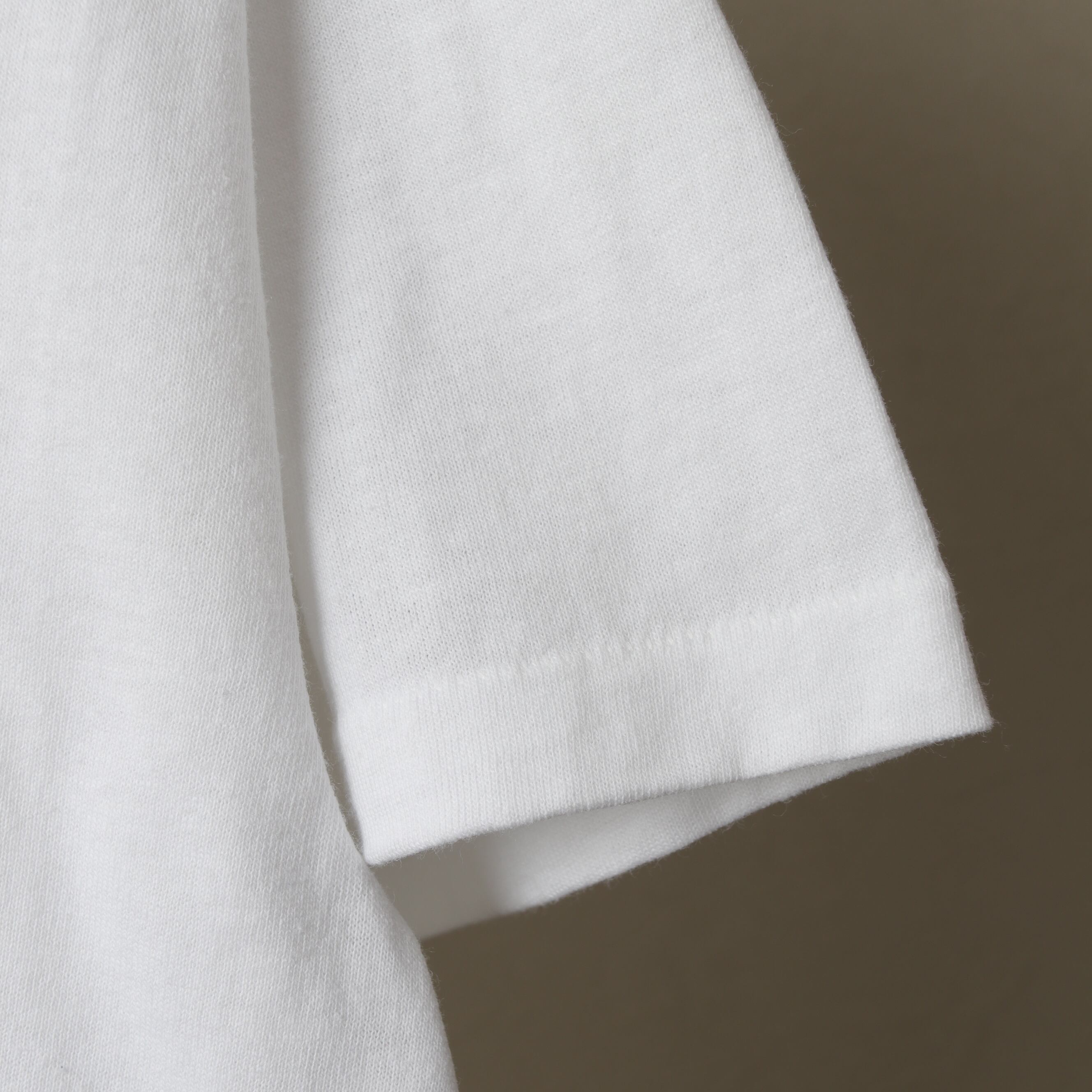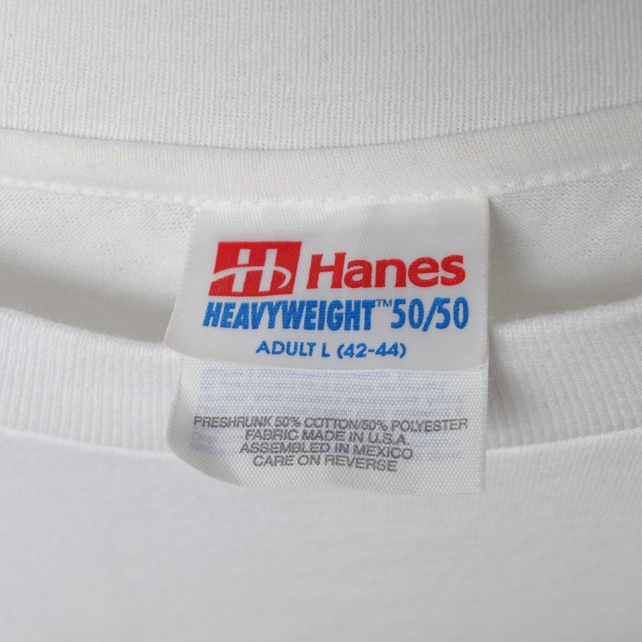 ヘインズの50/50ボディ、袖シングル裾ダブルステッチ。