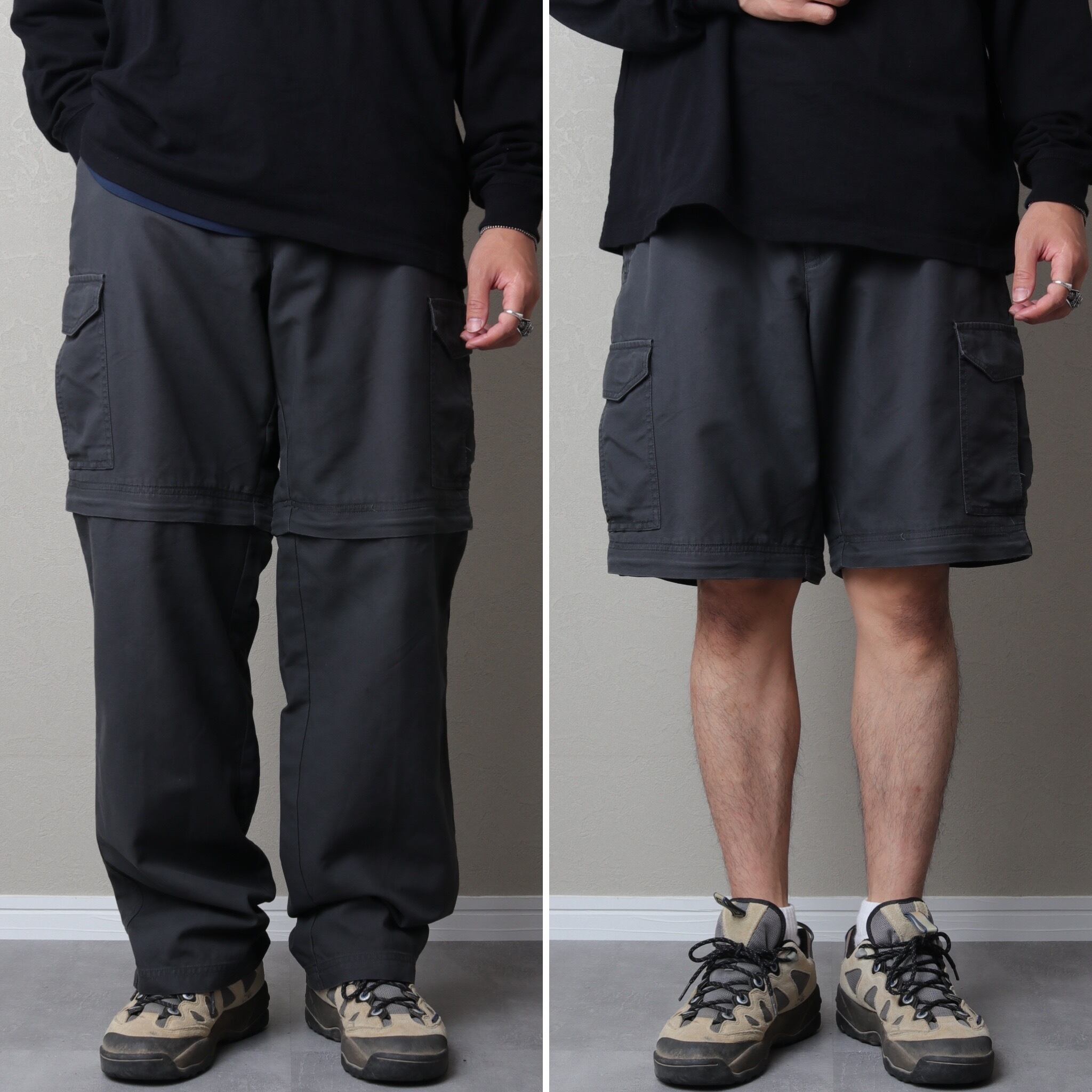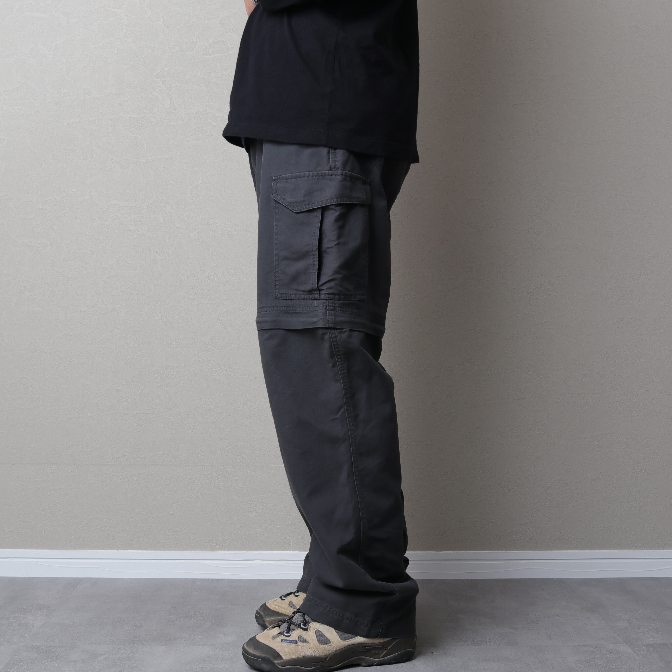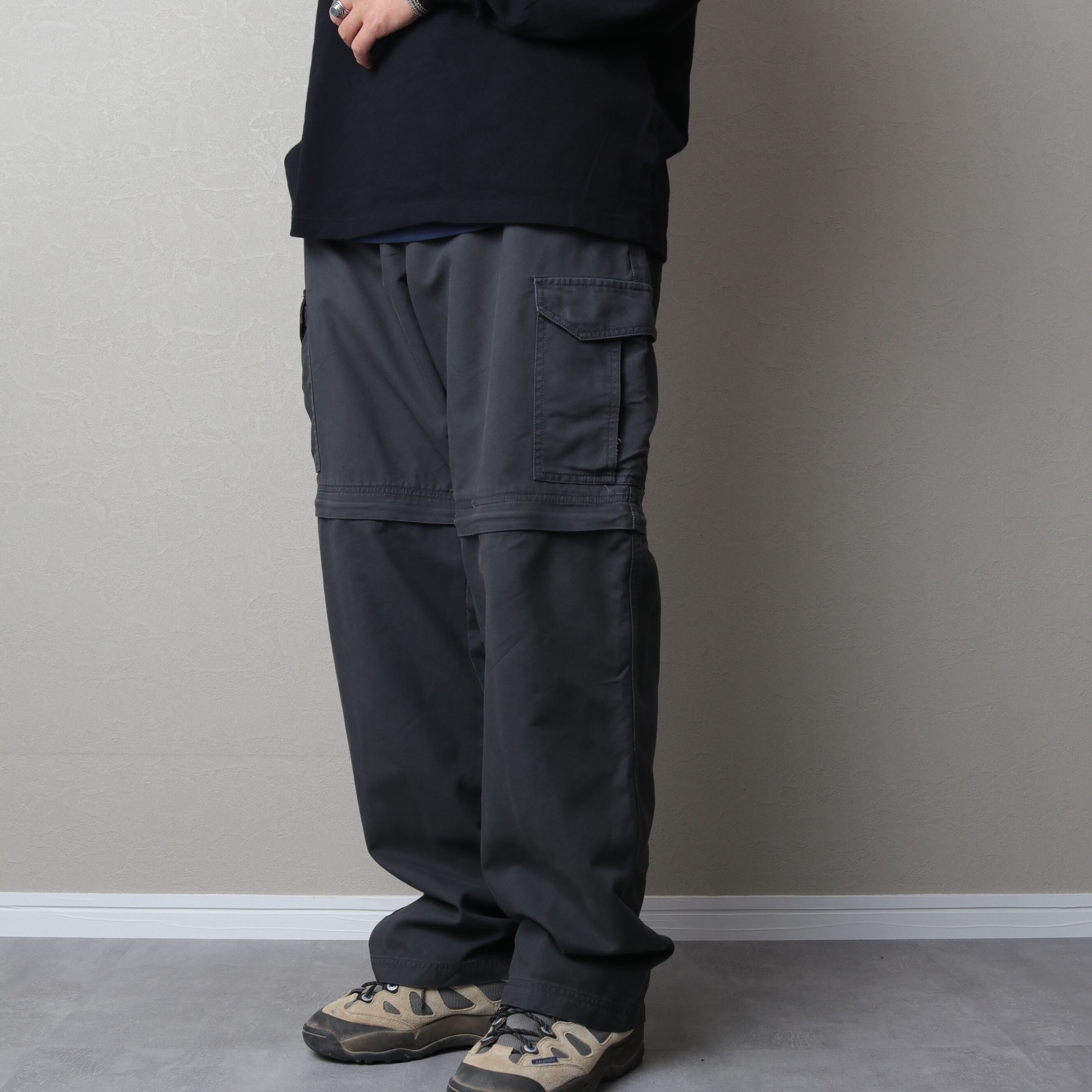 外さない状態だと太めのカーゴパンツとして扱え、外すとショートパンツにチェンジする2Way仕様。