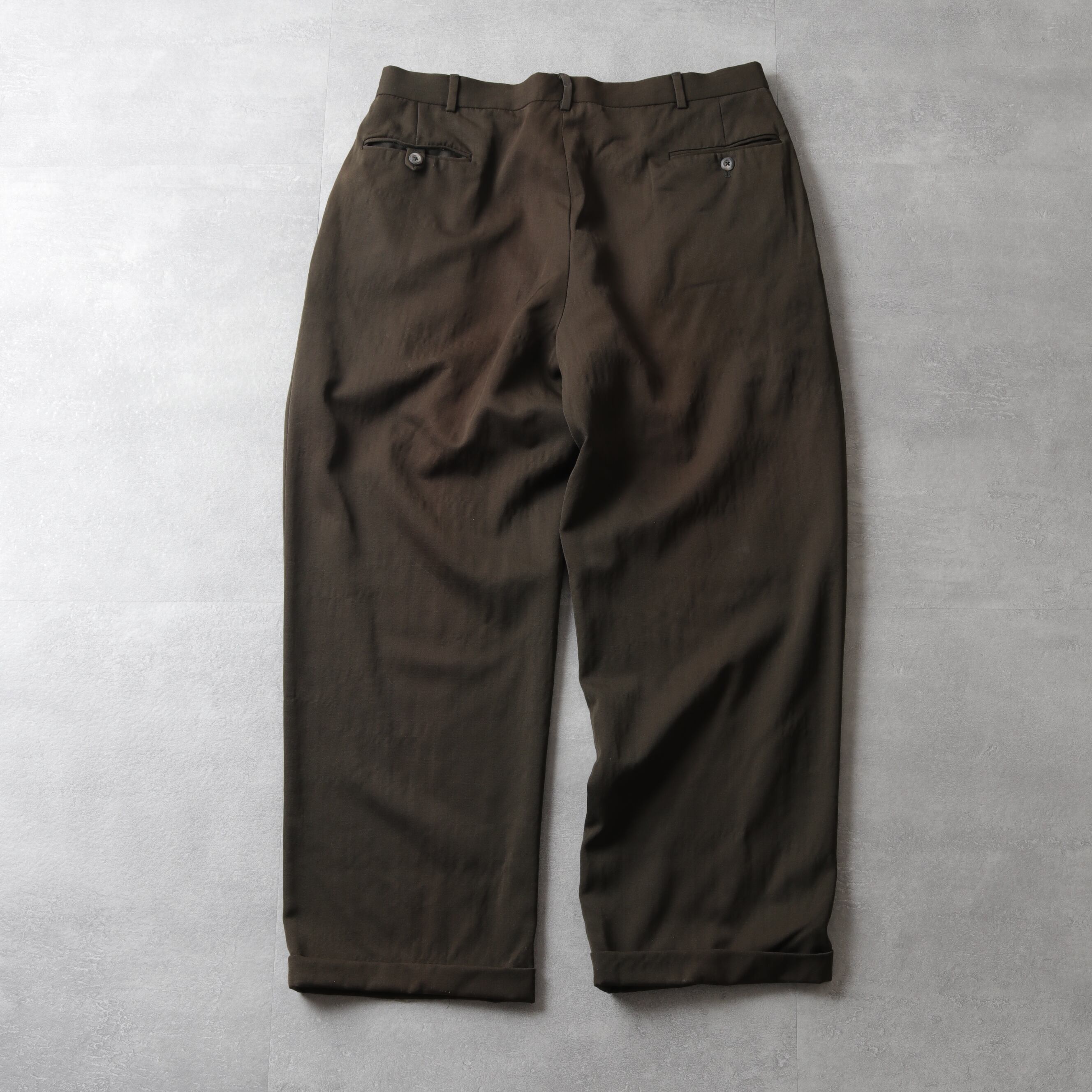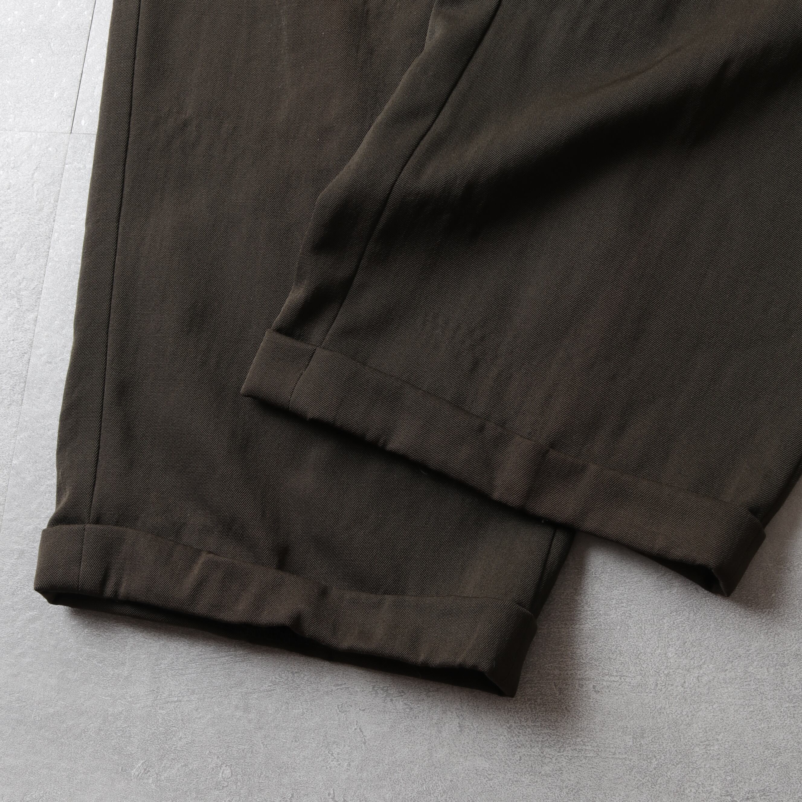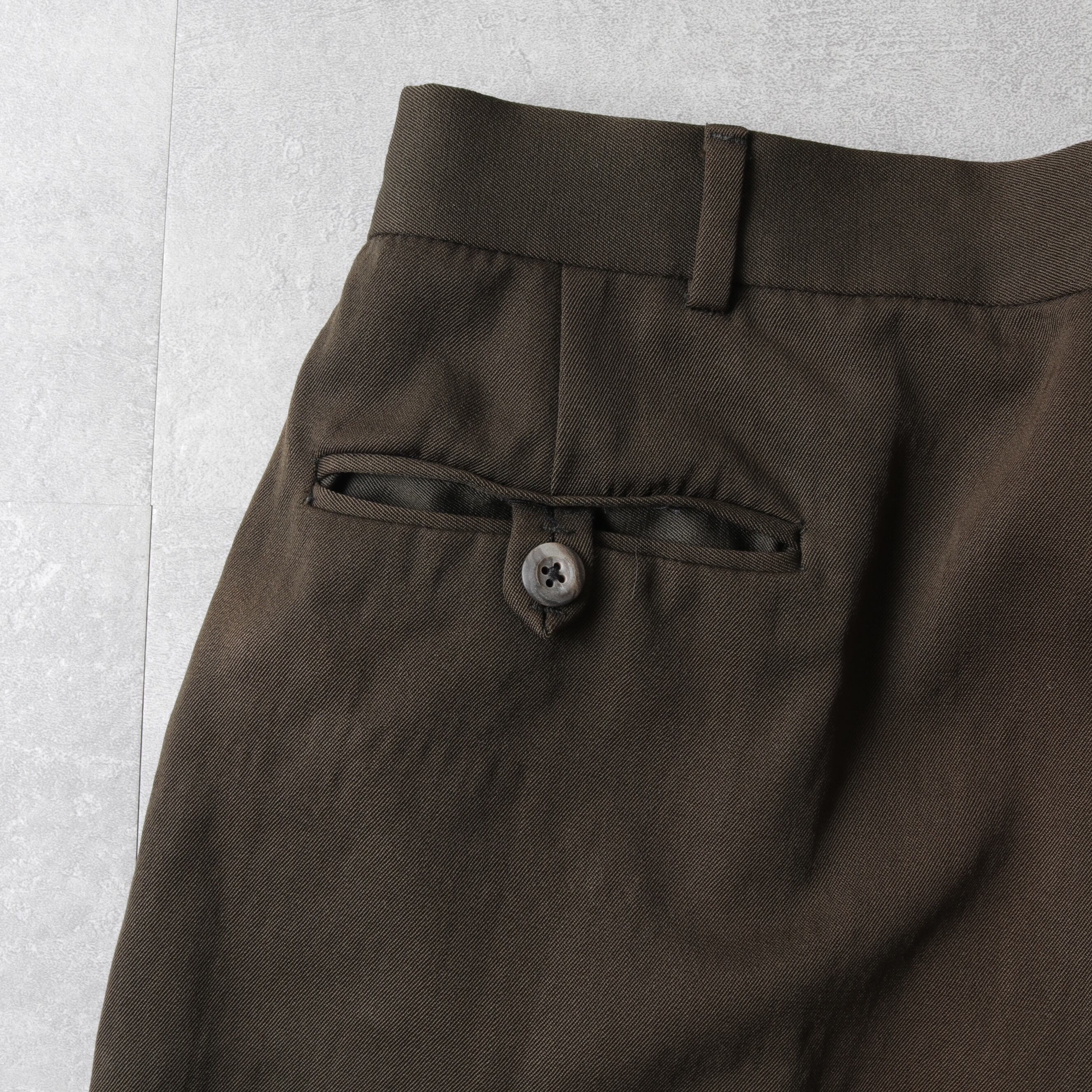 インタックのゆとりあるシルエットにサスペンダーボタン、ダブル仕上げと渋い一本。