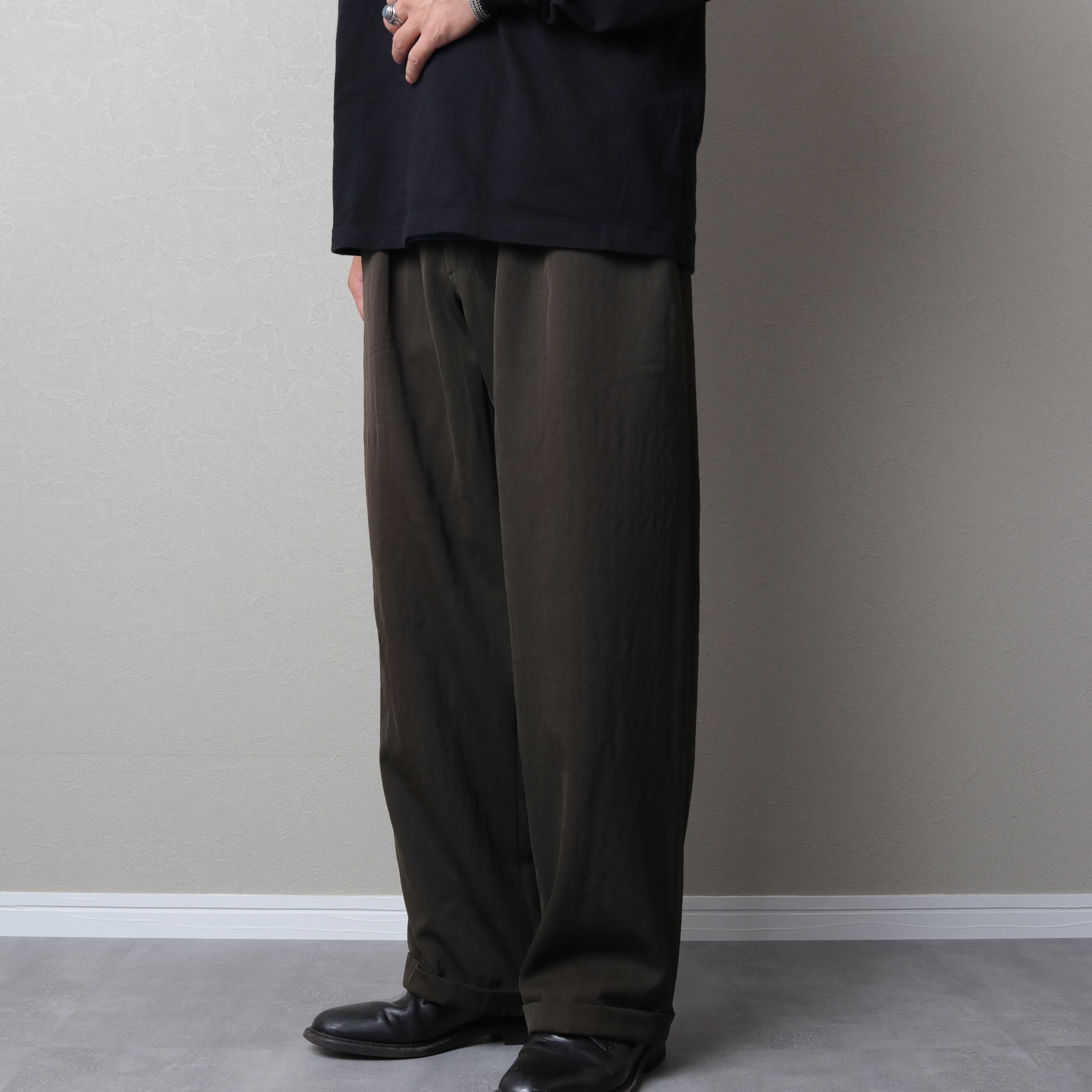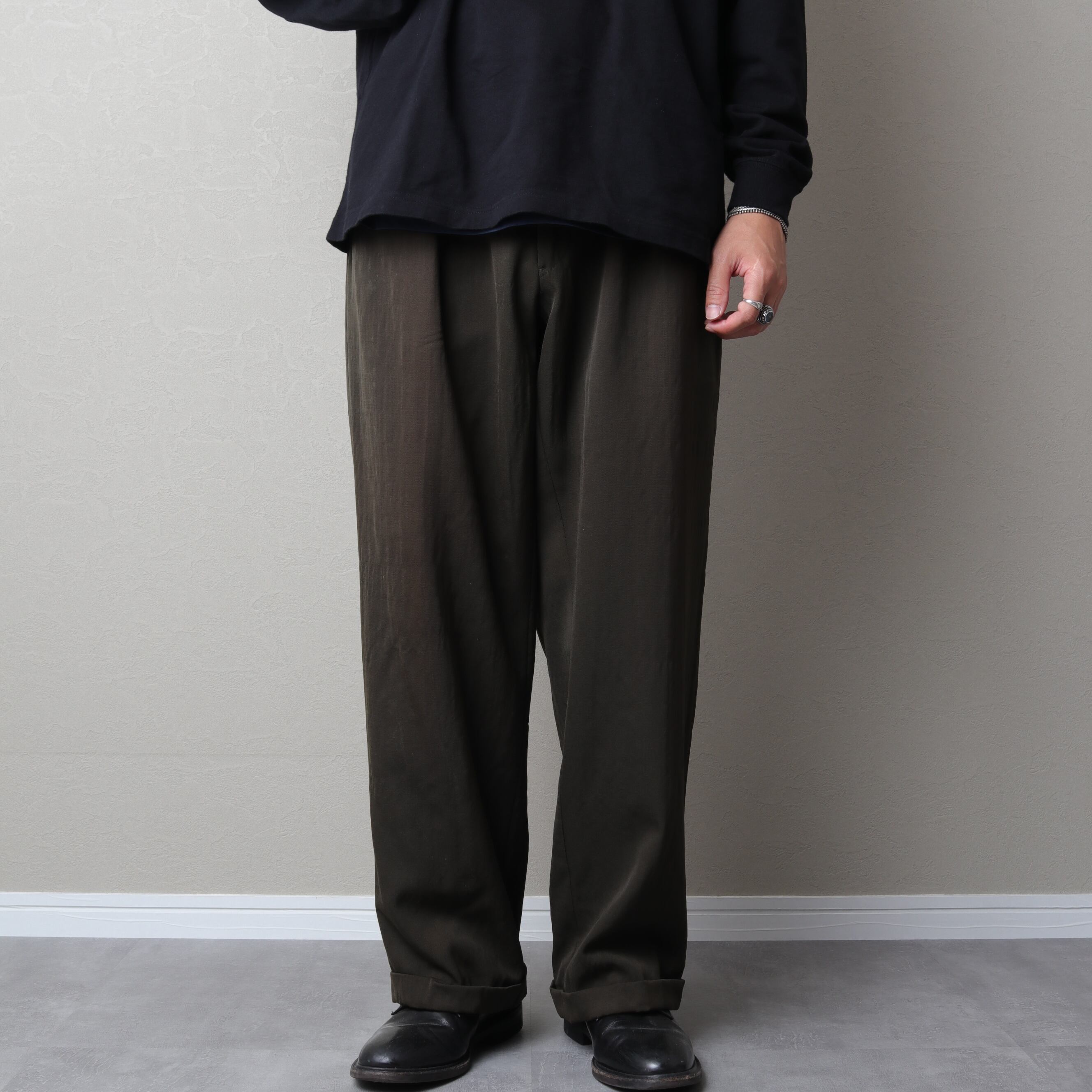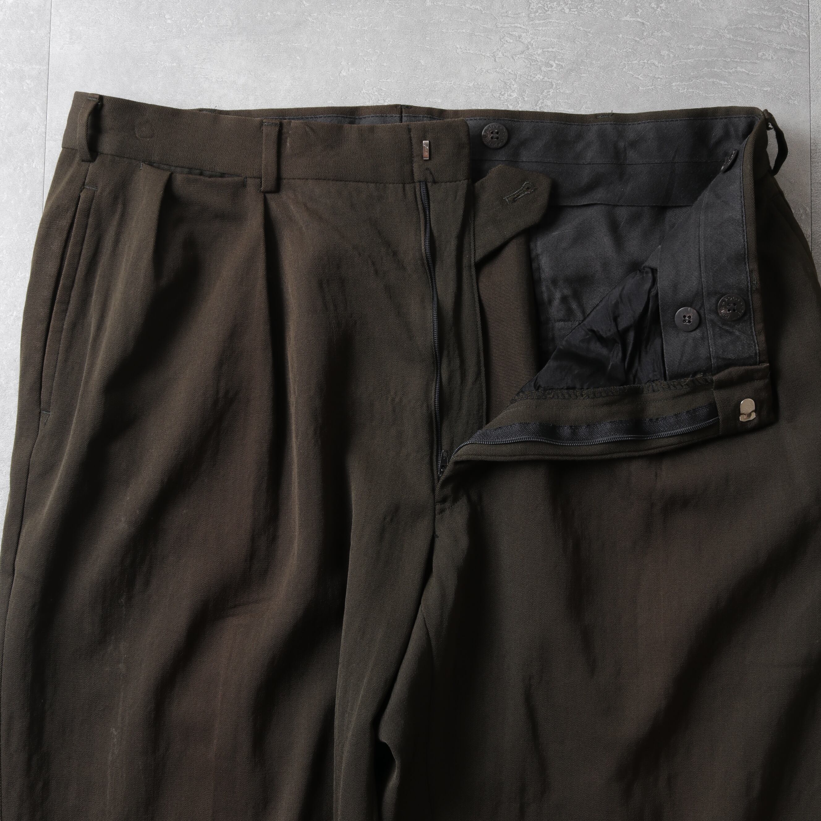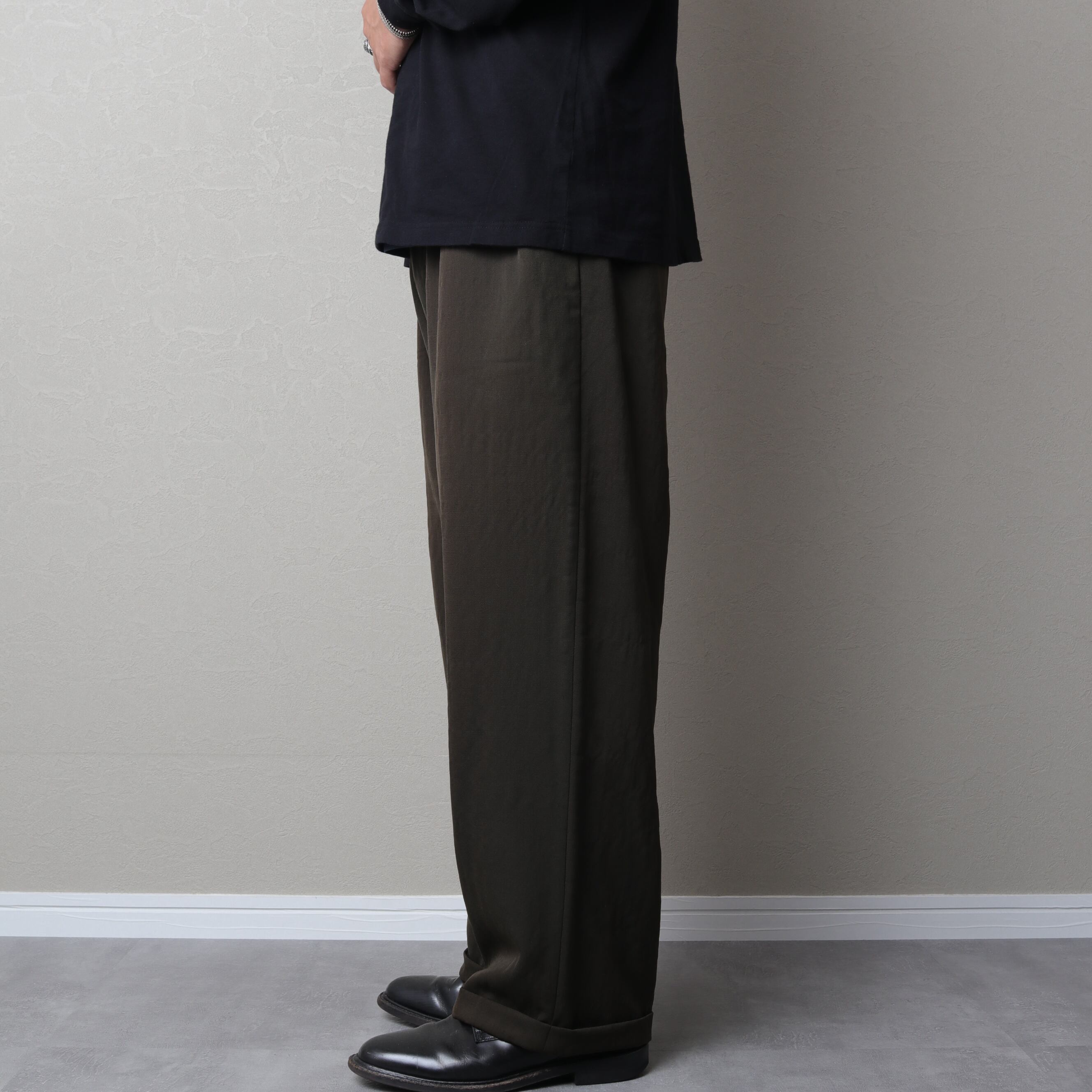 インタックのゆとりあるシルエットにサスペンダーボタン、ダブル仕上げと渋い一本。