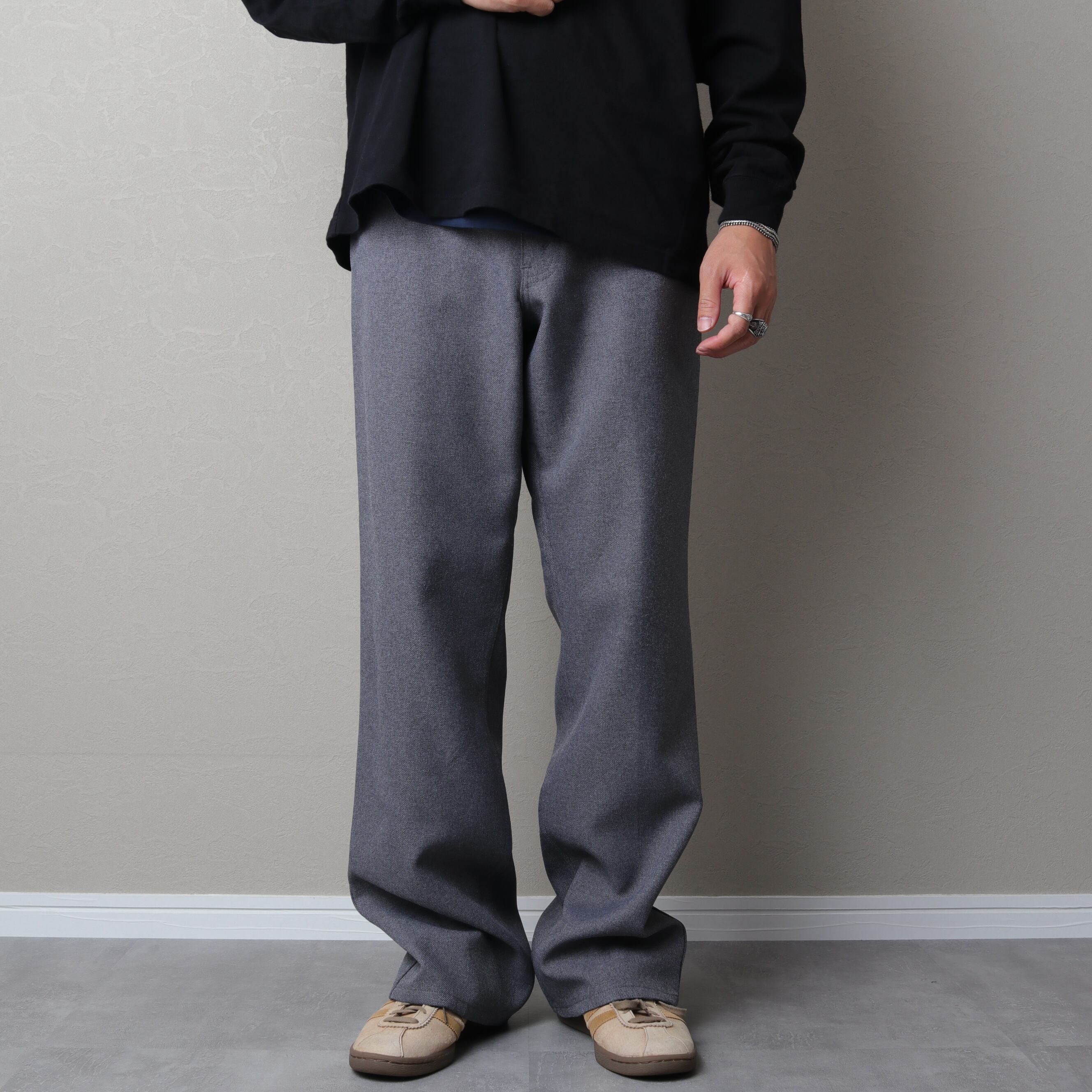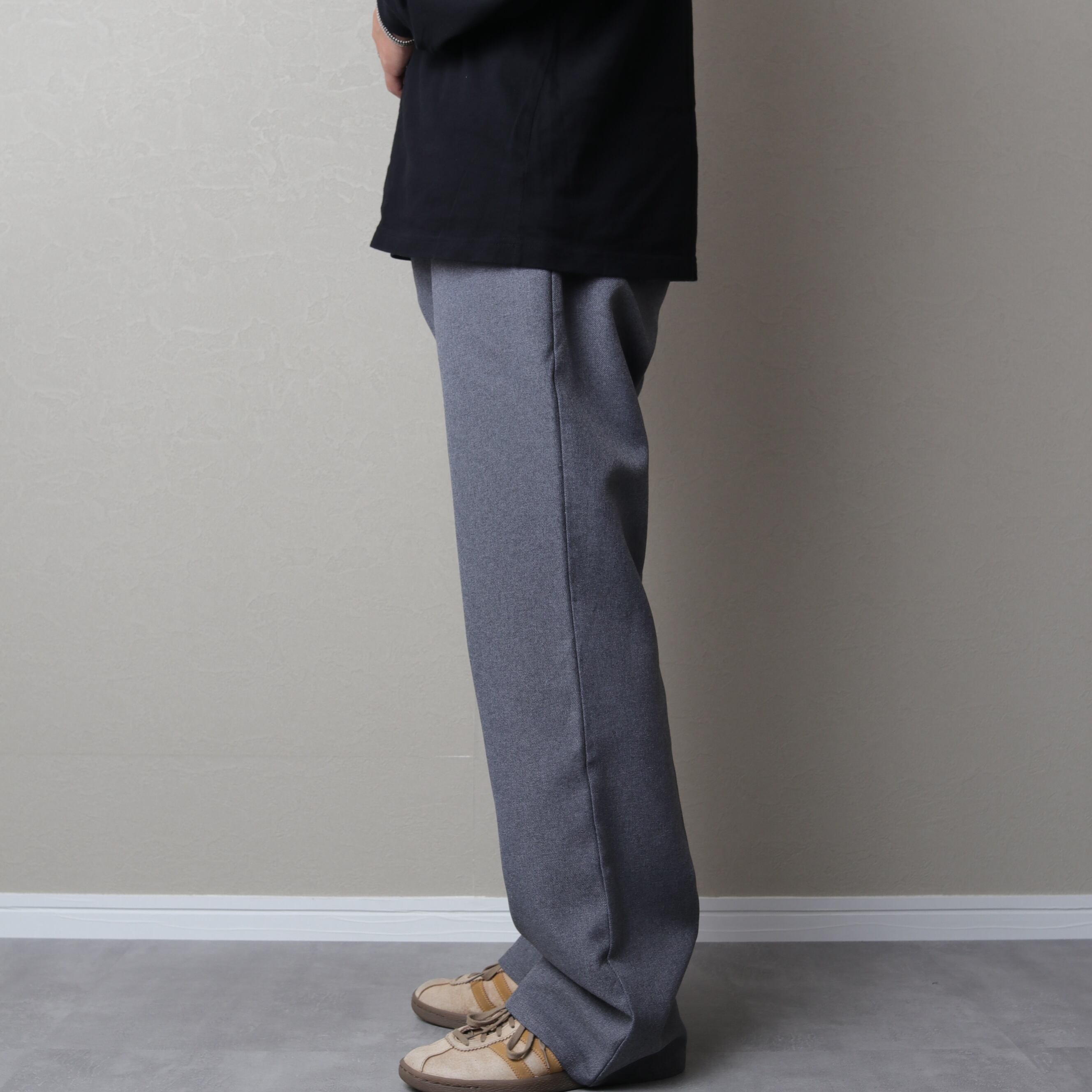 センタープレスの入る微フレアシルエットでスラックス代わりにスタイリングが可能。