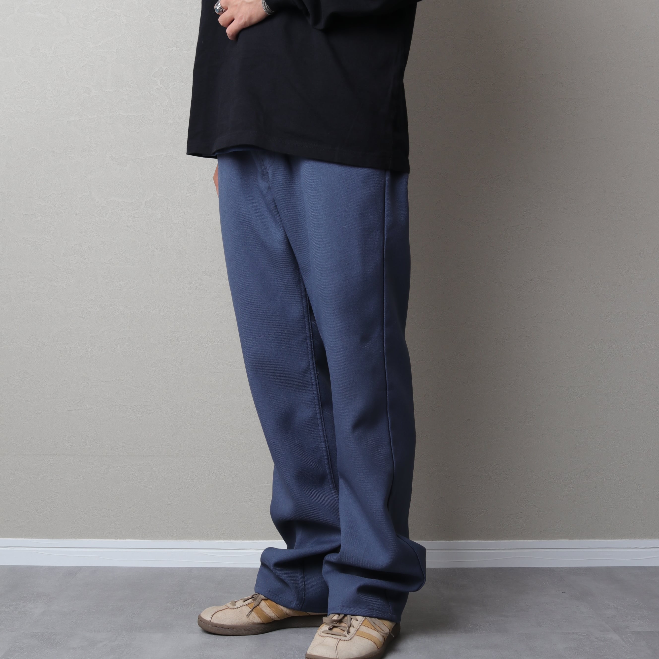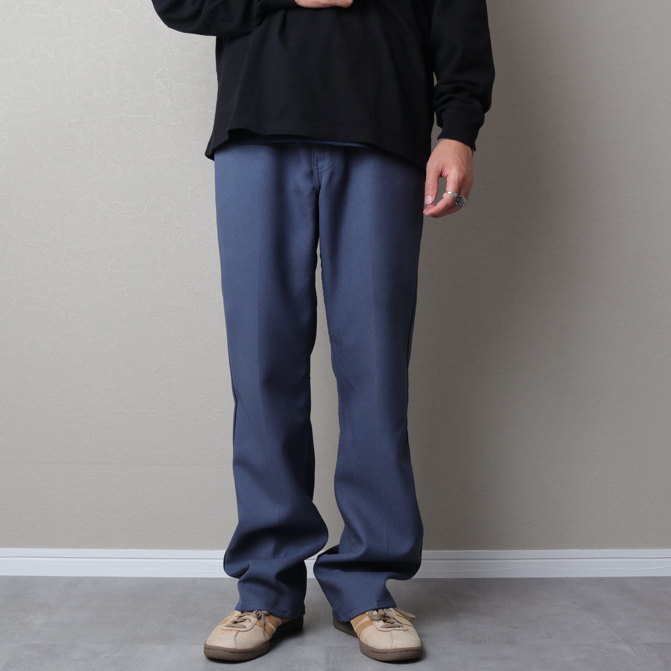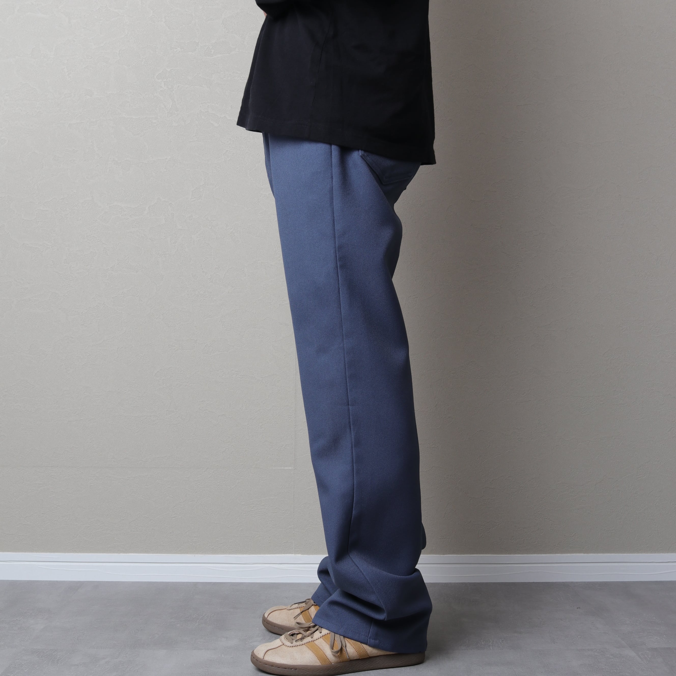 センタープレスの入る微フレアシルエットでスラックス代わりにスタイリングが可能。