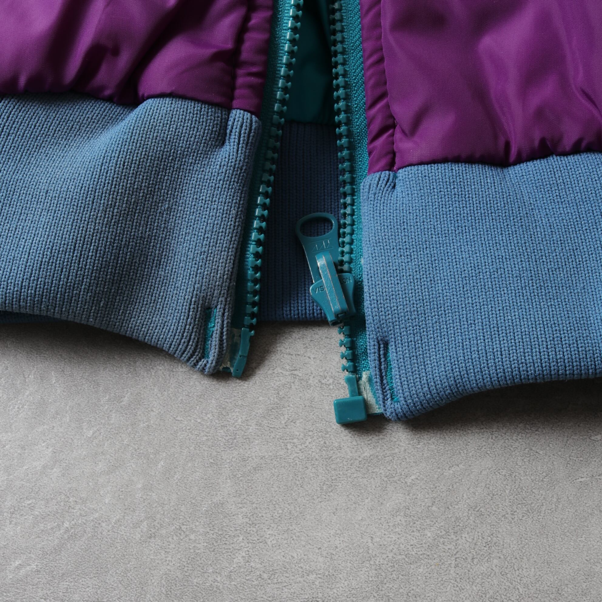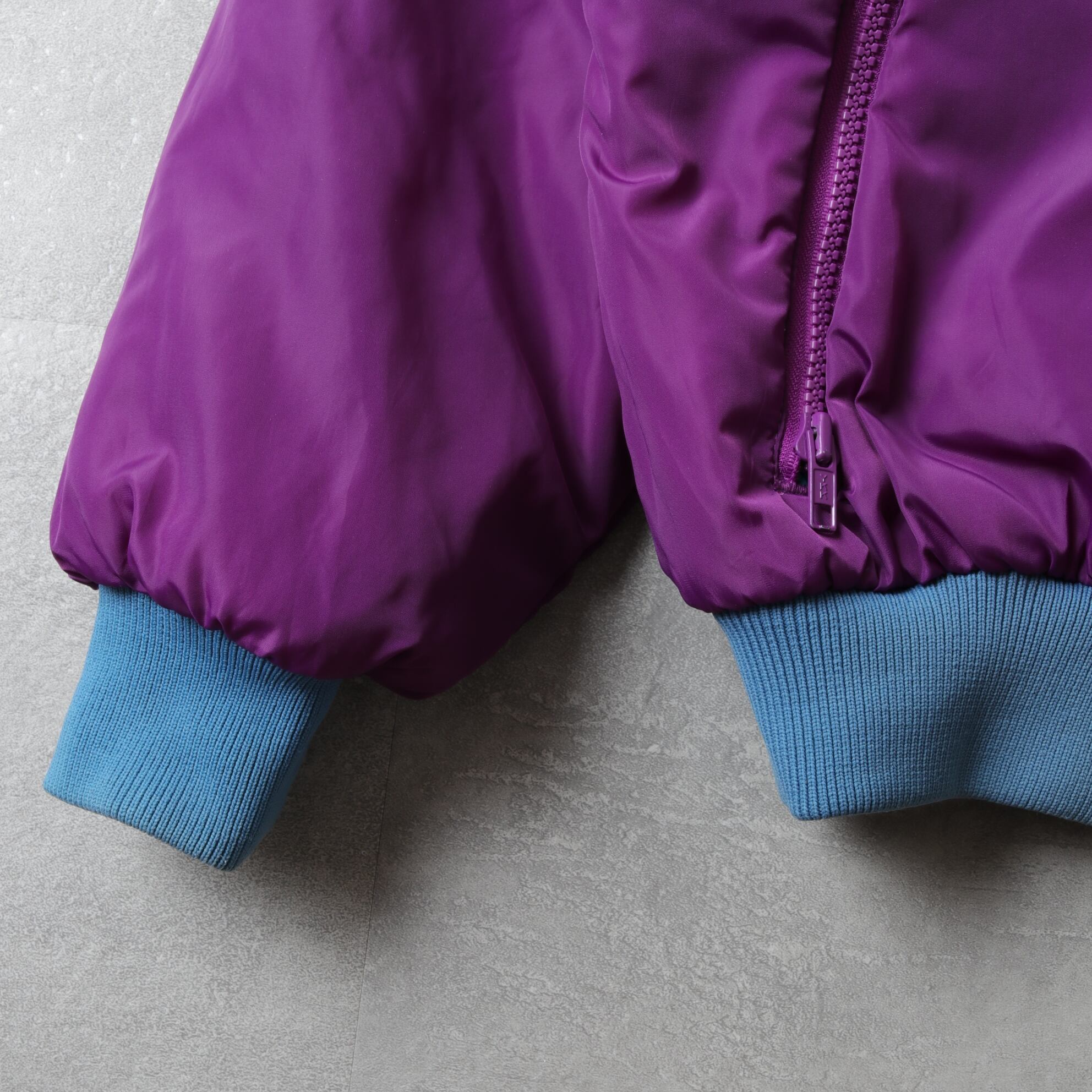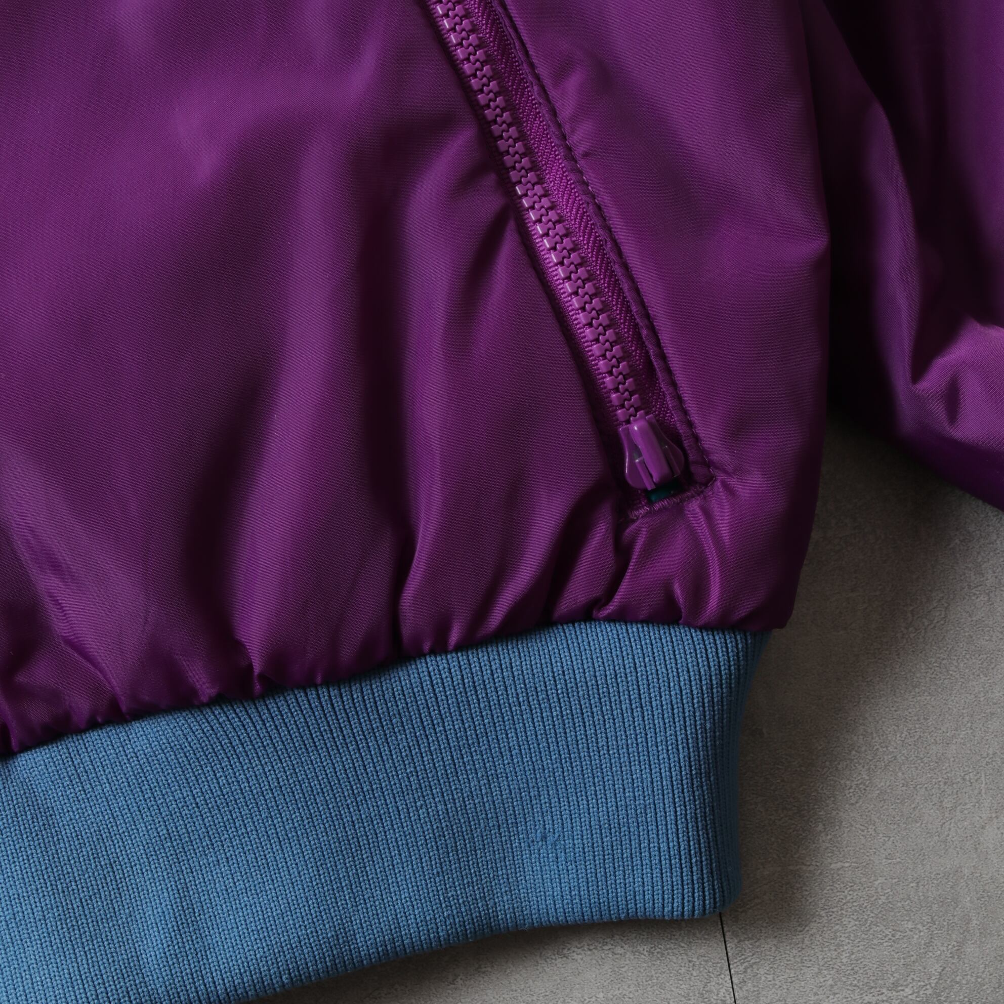 パープルサイドの左ポケットのジップ持ち手に折れあり(写真8、開閉自体は可能)