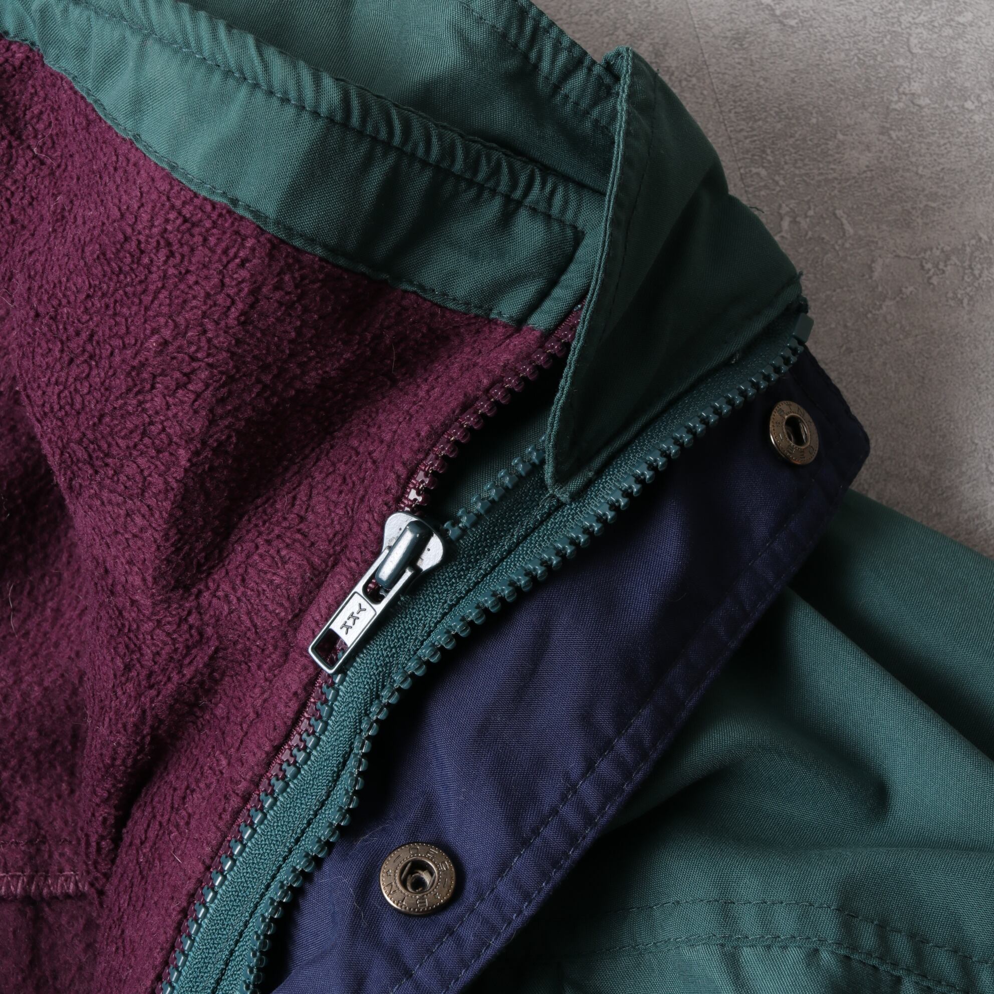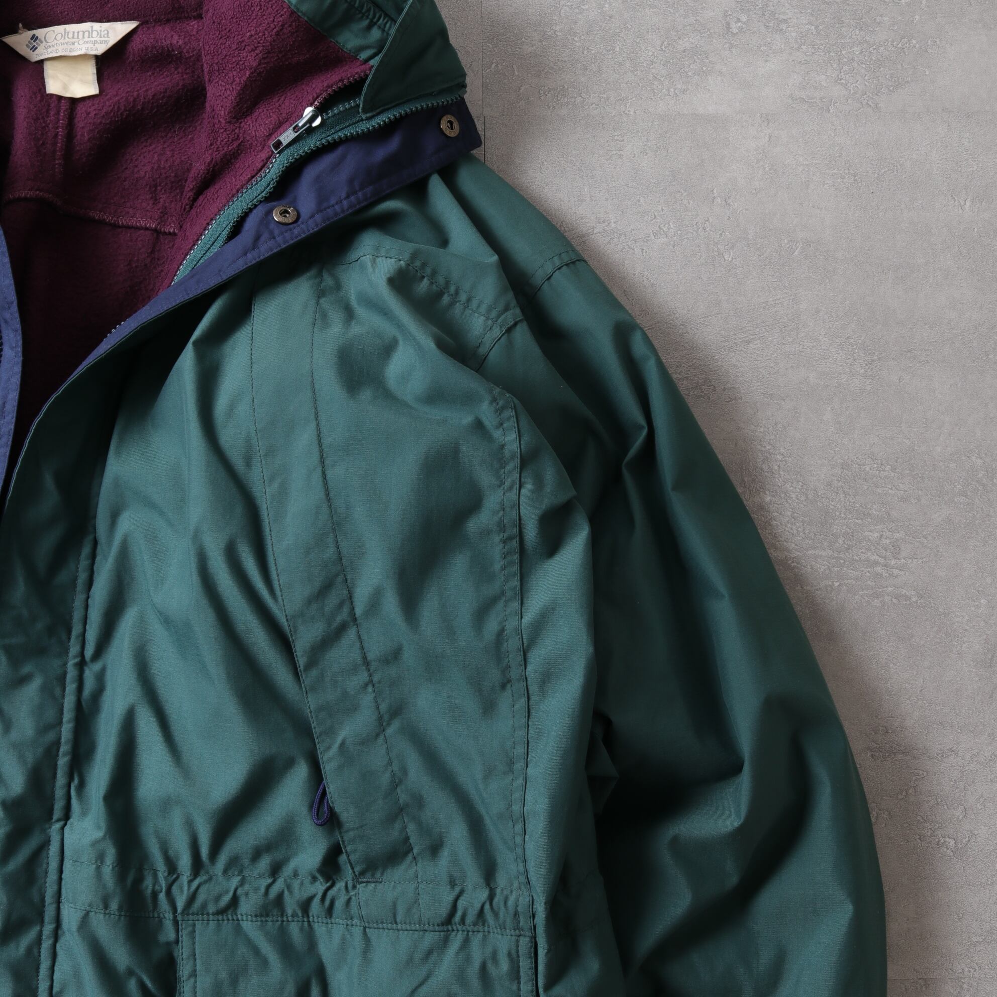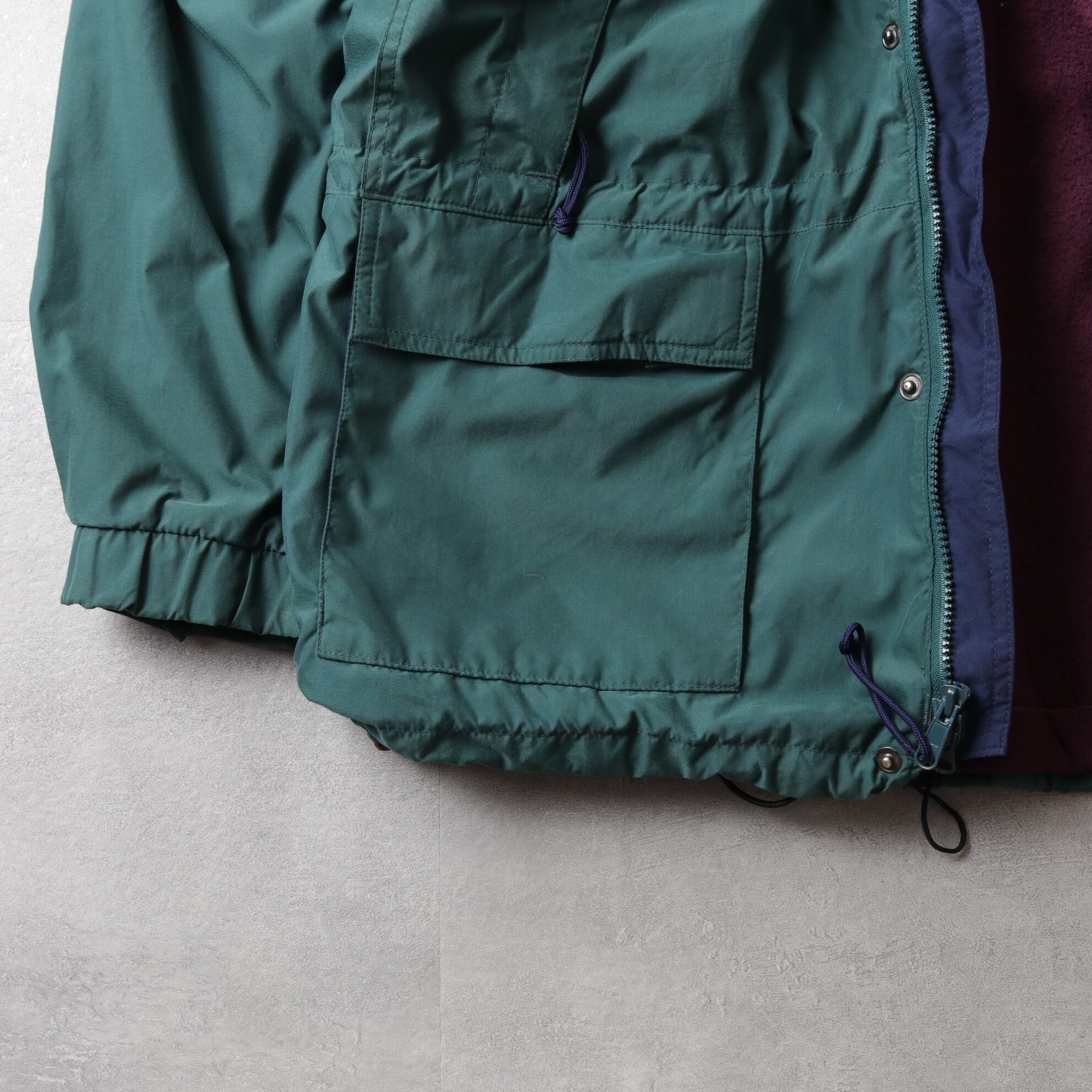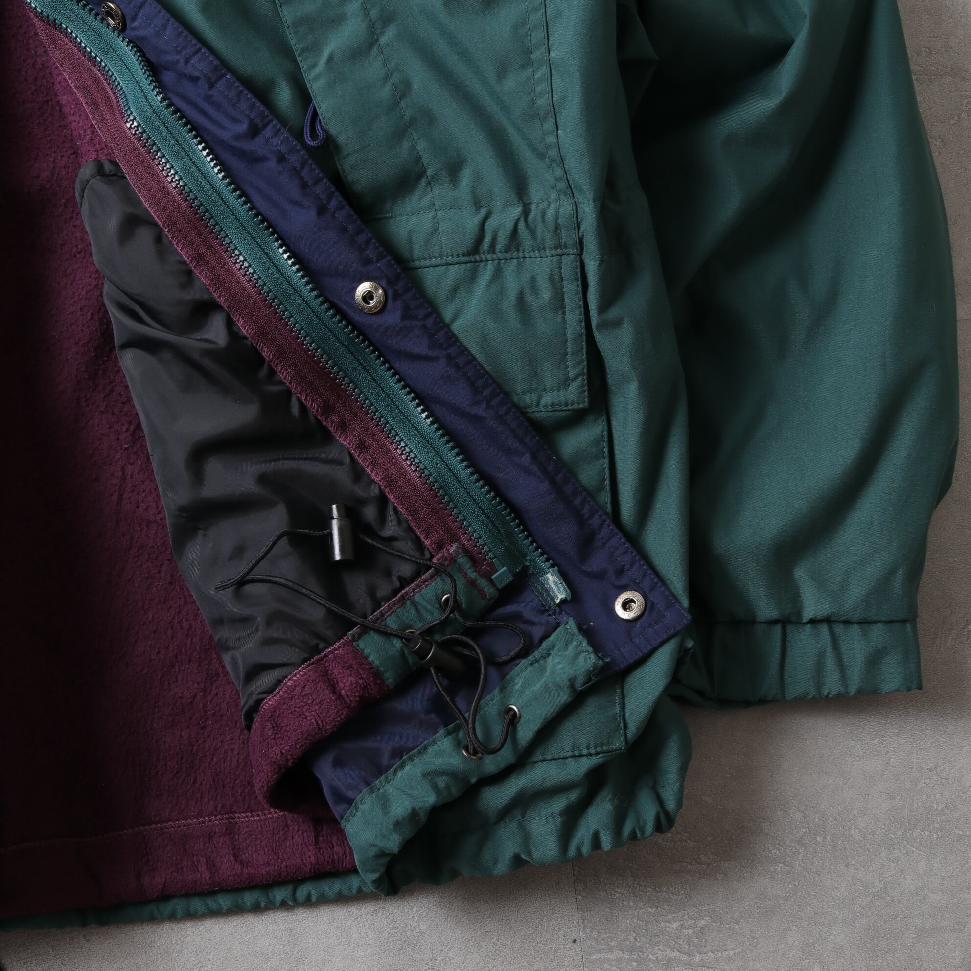 フォレストグリーンのシェルにパープルのフリースライニング。
