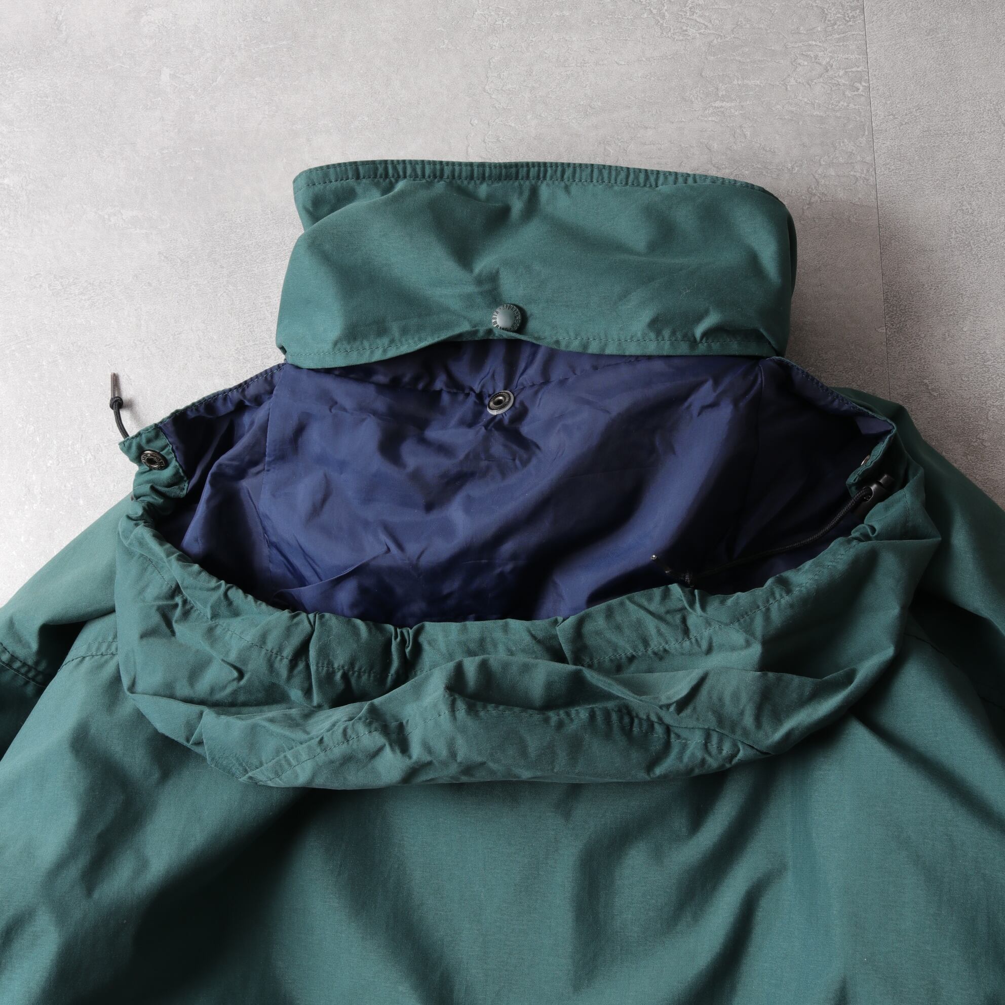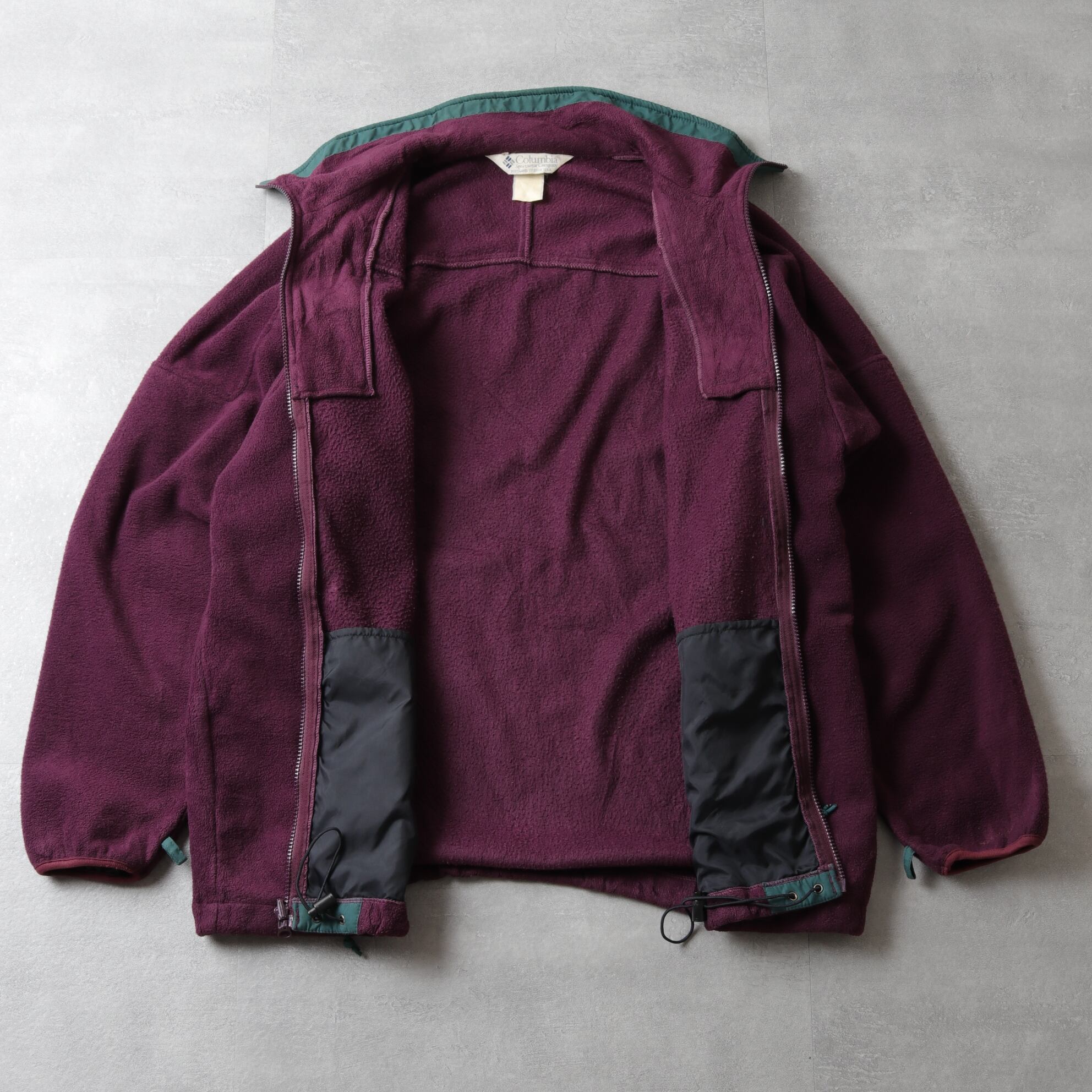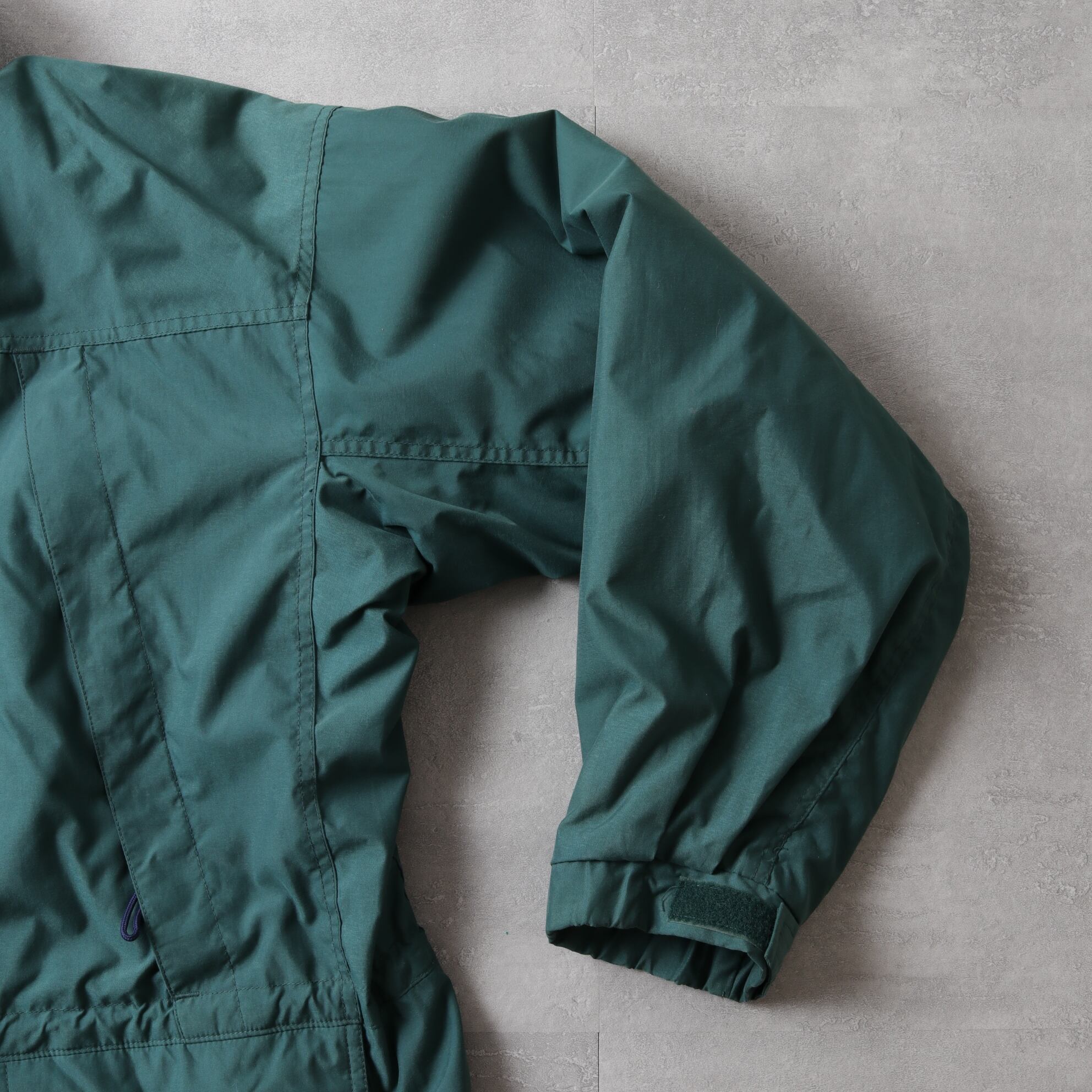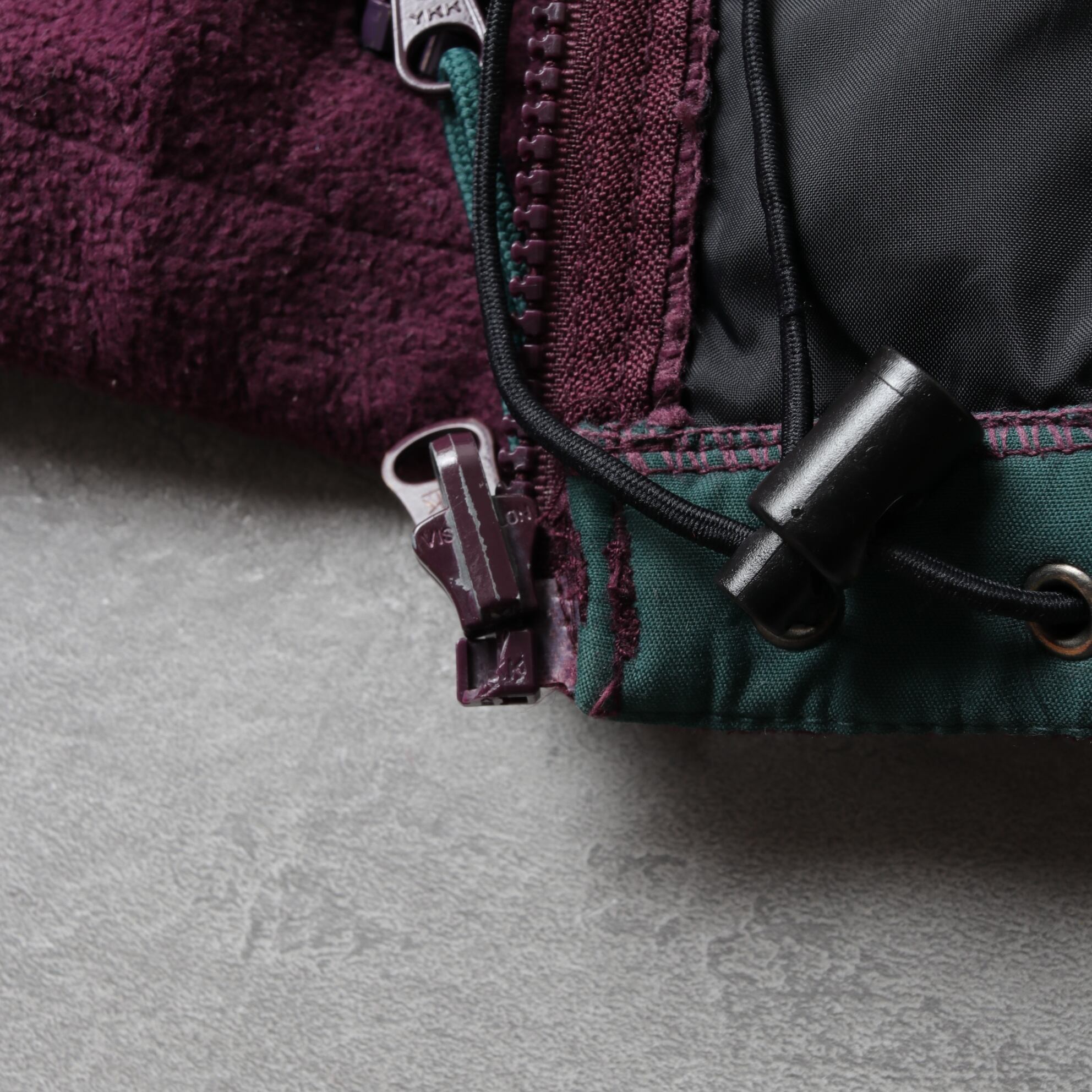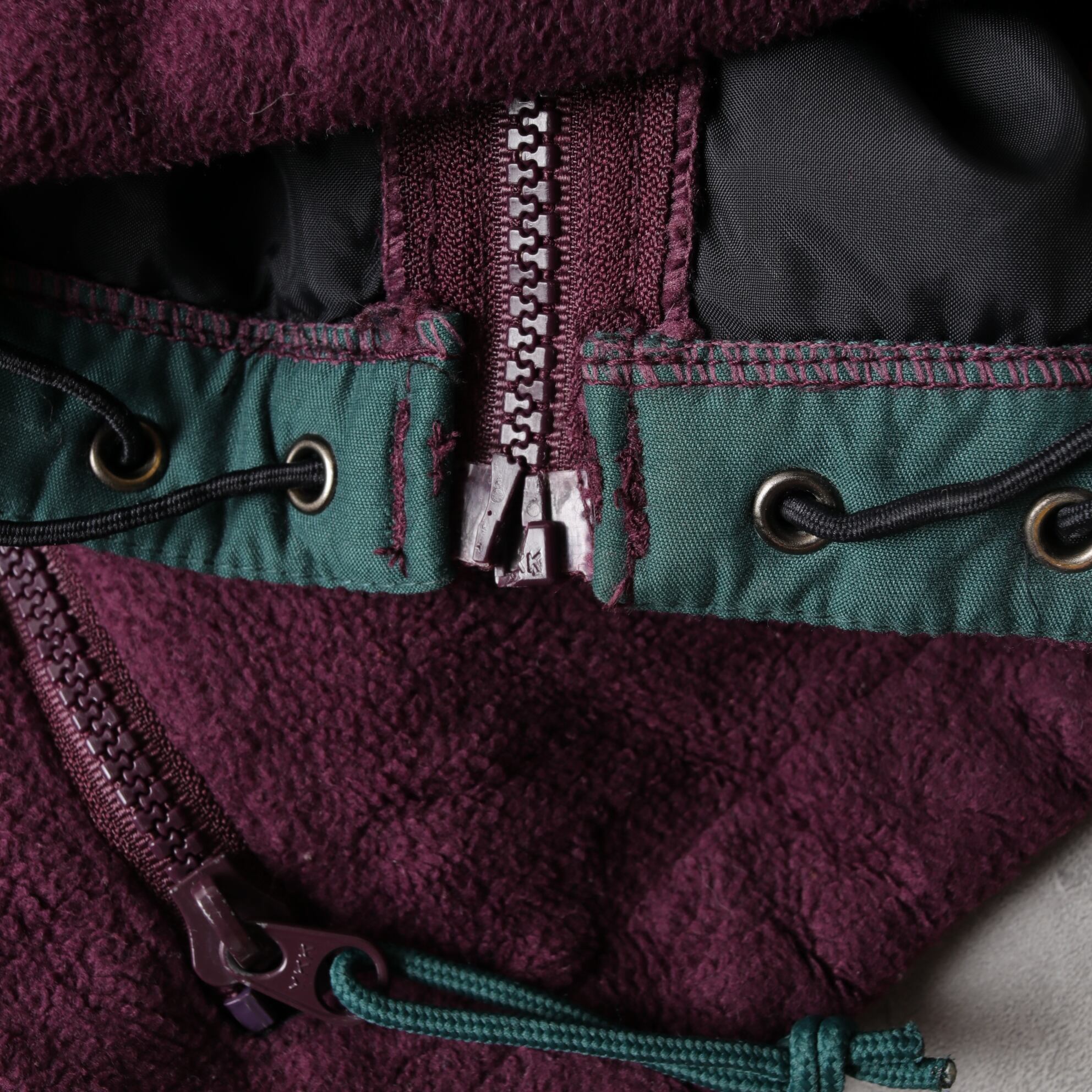 フォレストグリーンのシェルにパープルのフリースライニング。