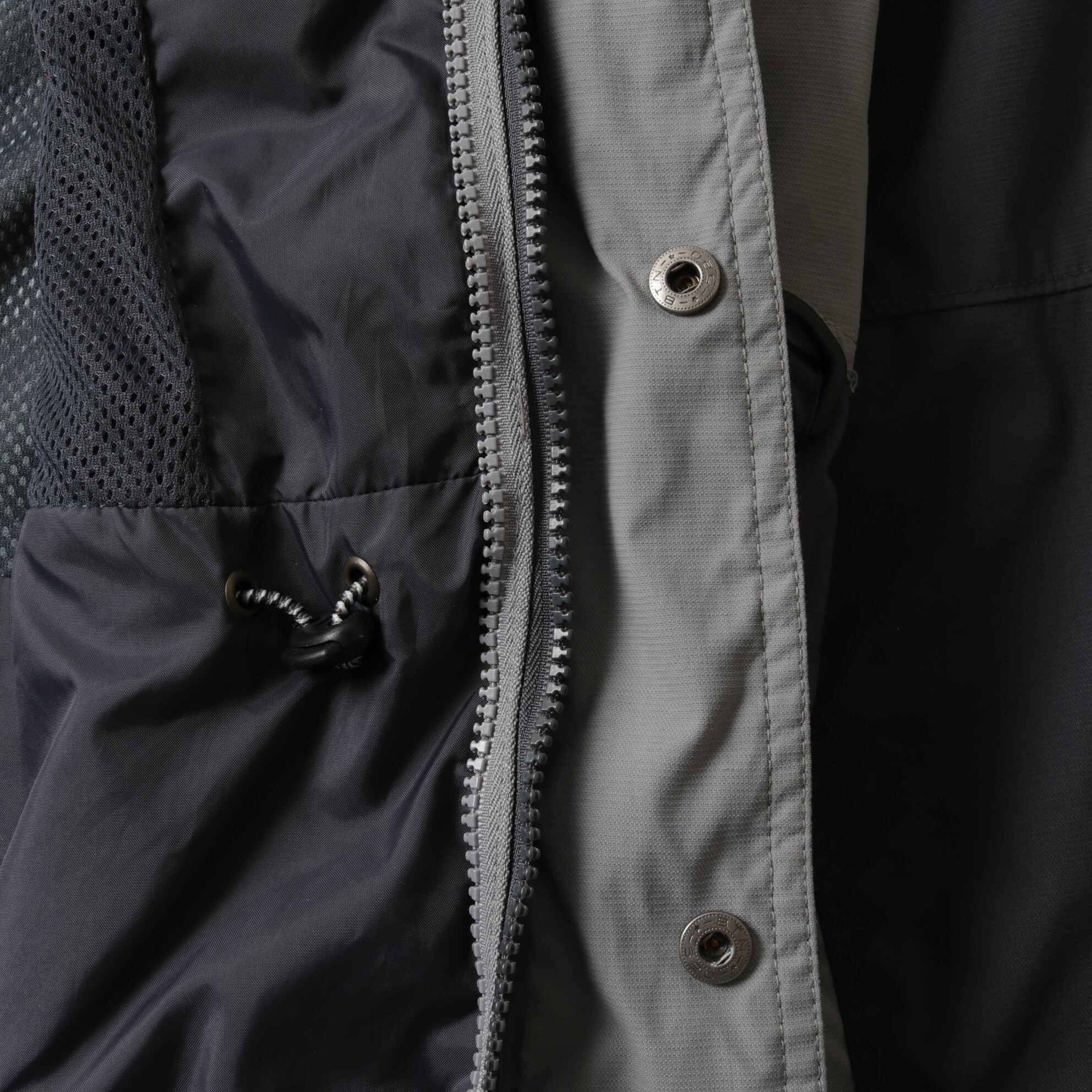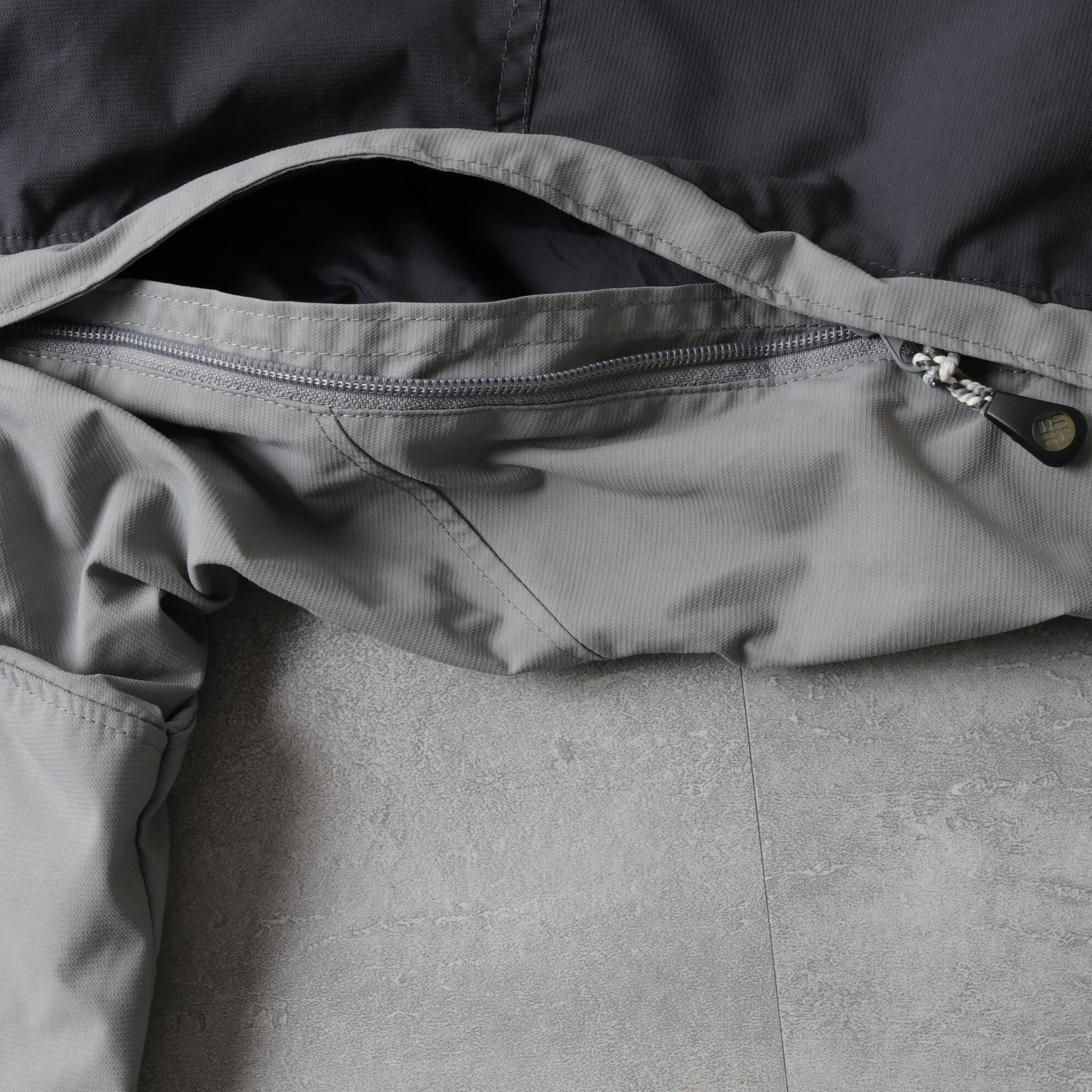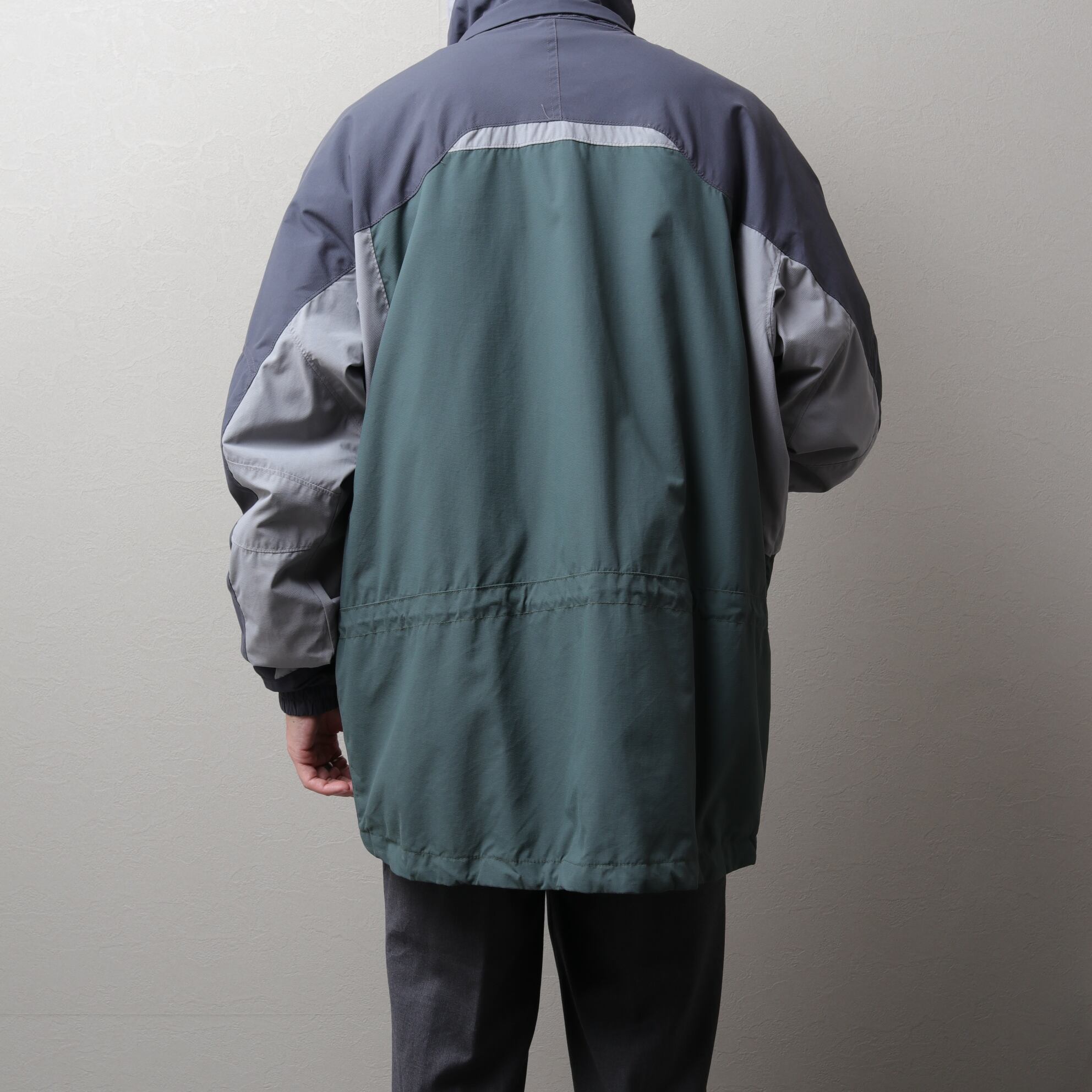 収納可能なフード付き、ウエストと裾にドローコード入り、袖にはベンチレーション付きと