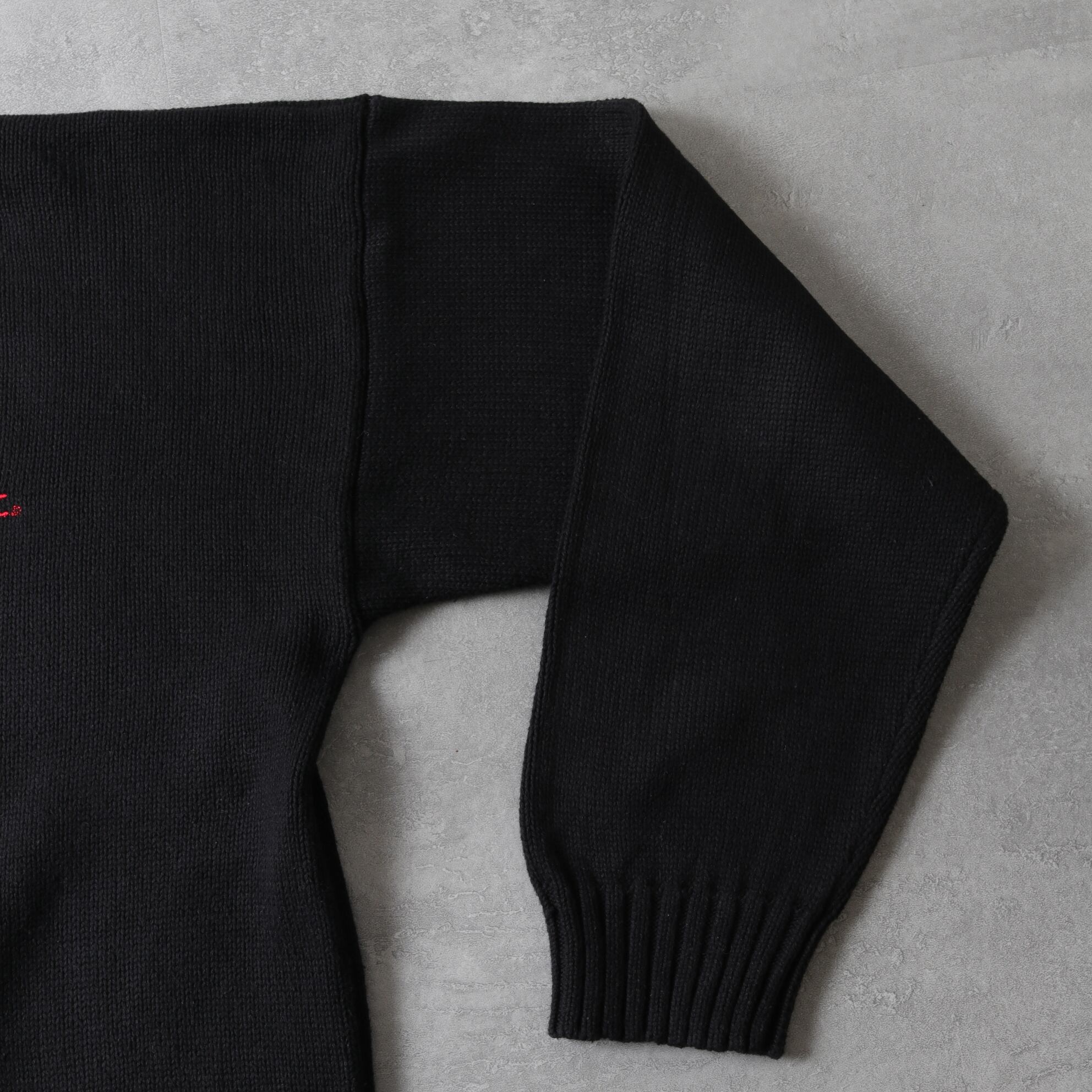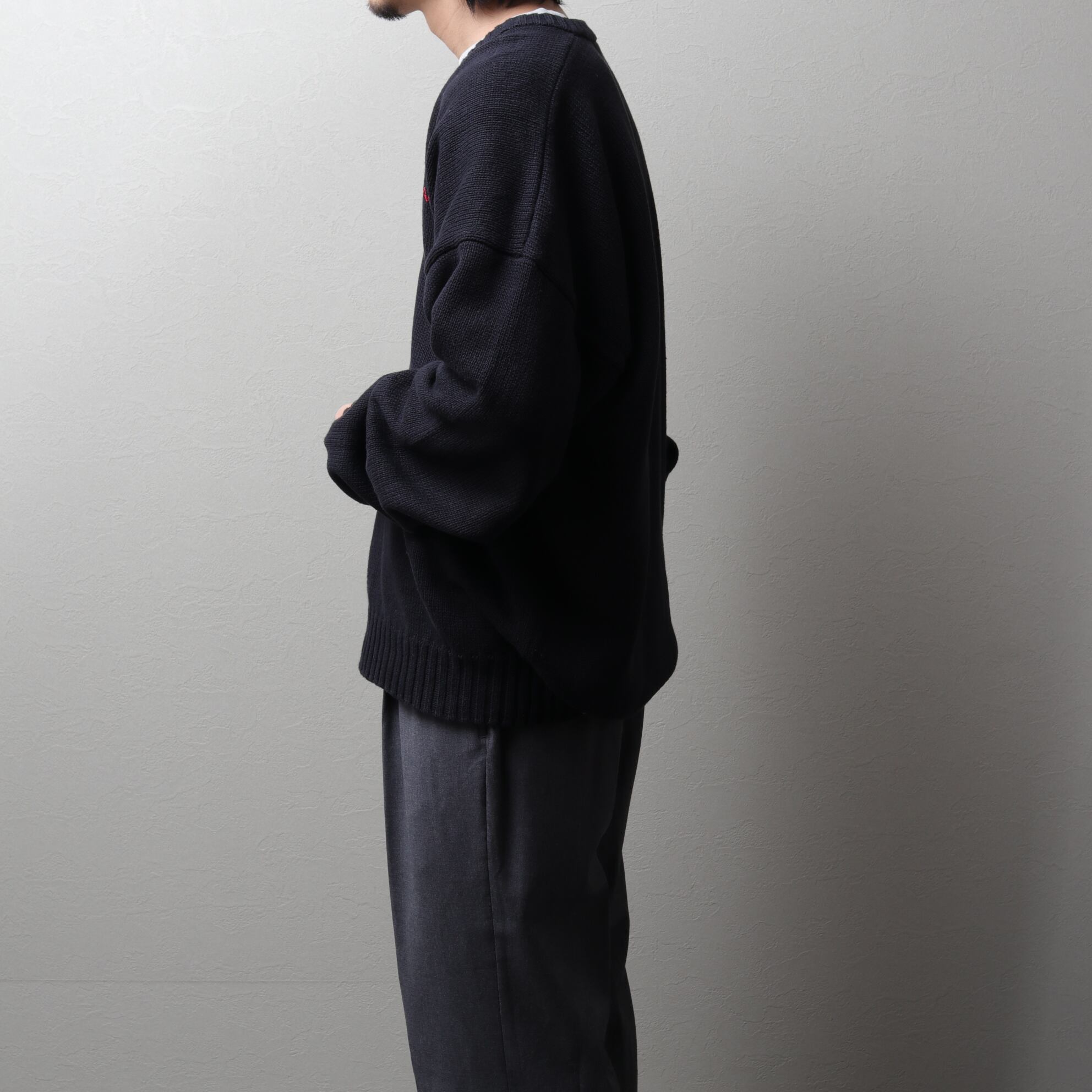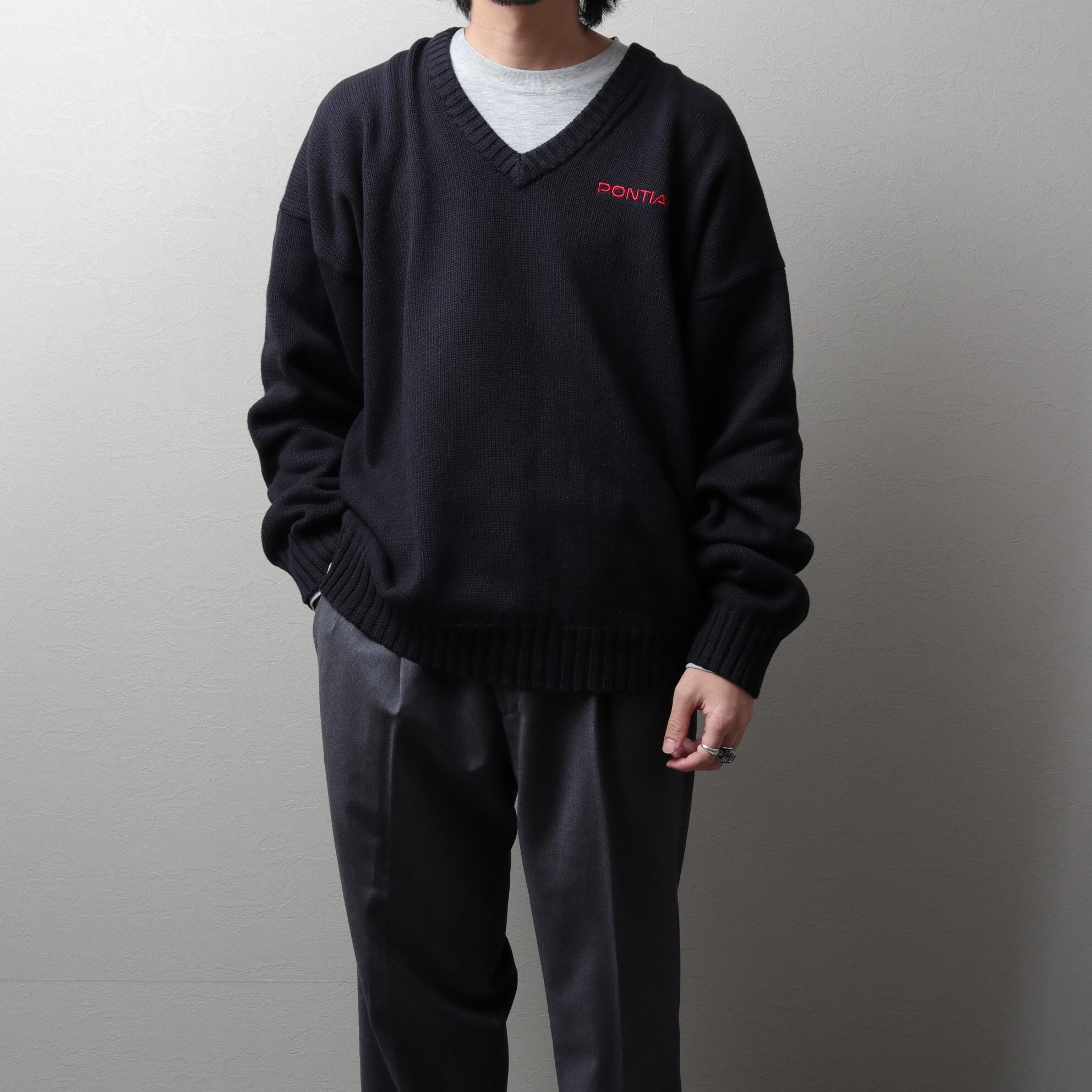 Vネック、刺繍入り、幅広でリブ付きということもありレタードセーターのような雰囲気。