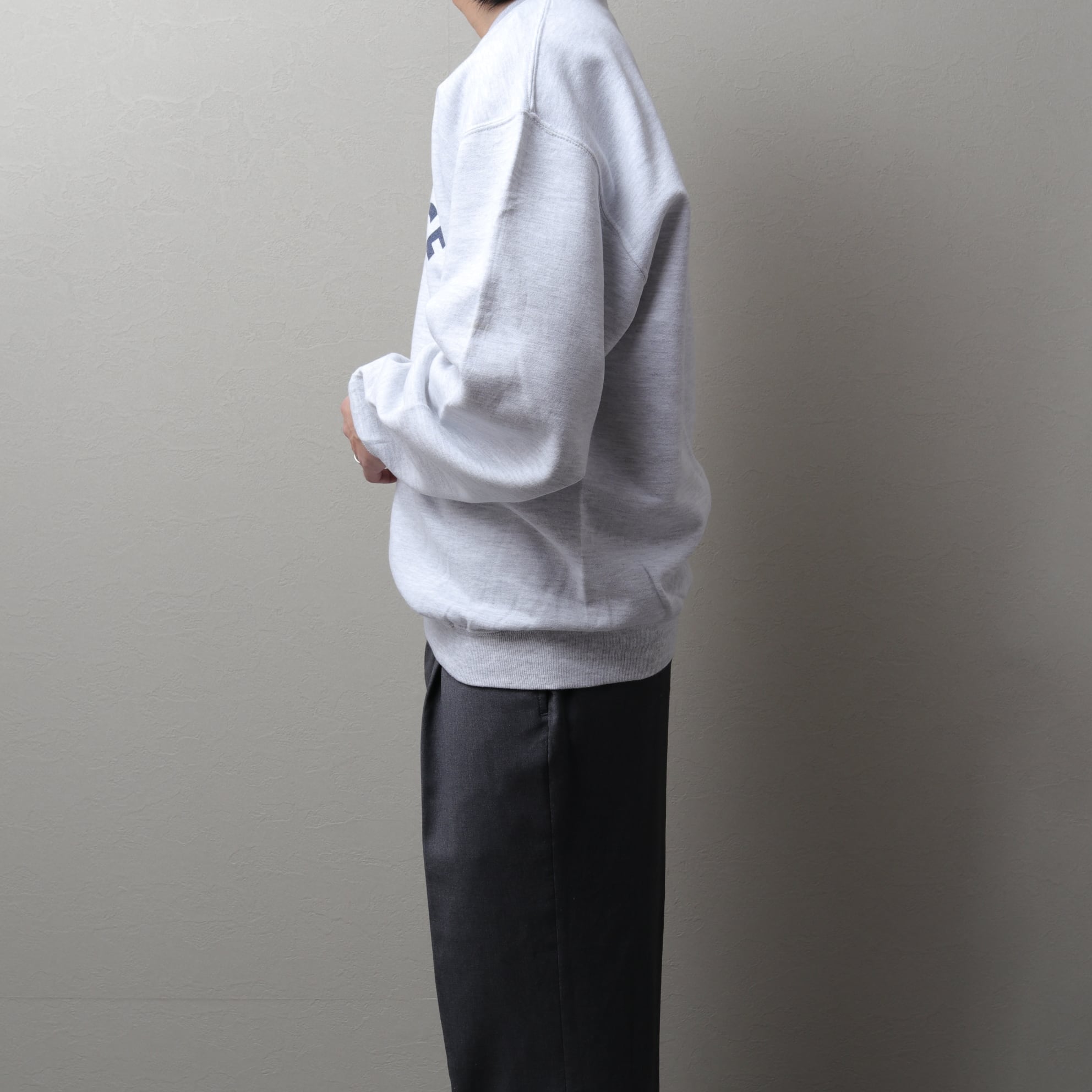 杢グレーの丸胴ボディによくみるとブラックでなくダークネイビーのアーチプリント。