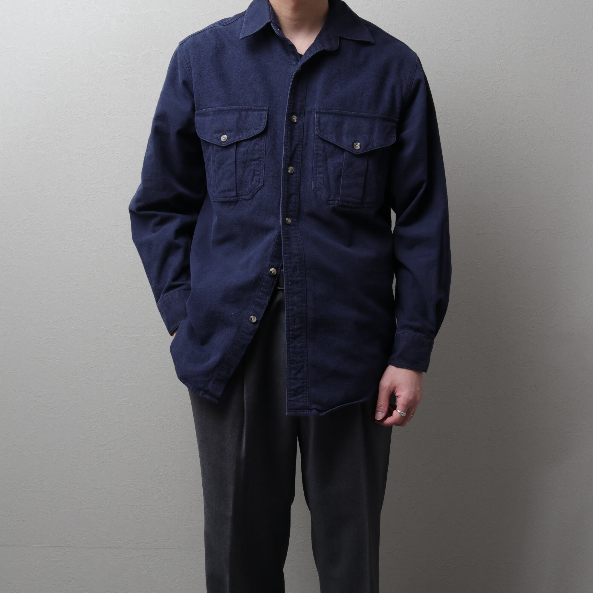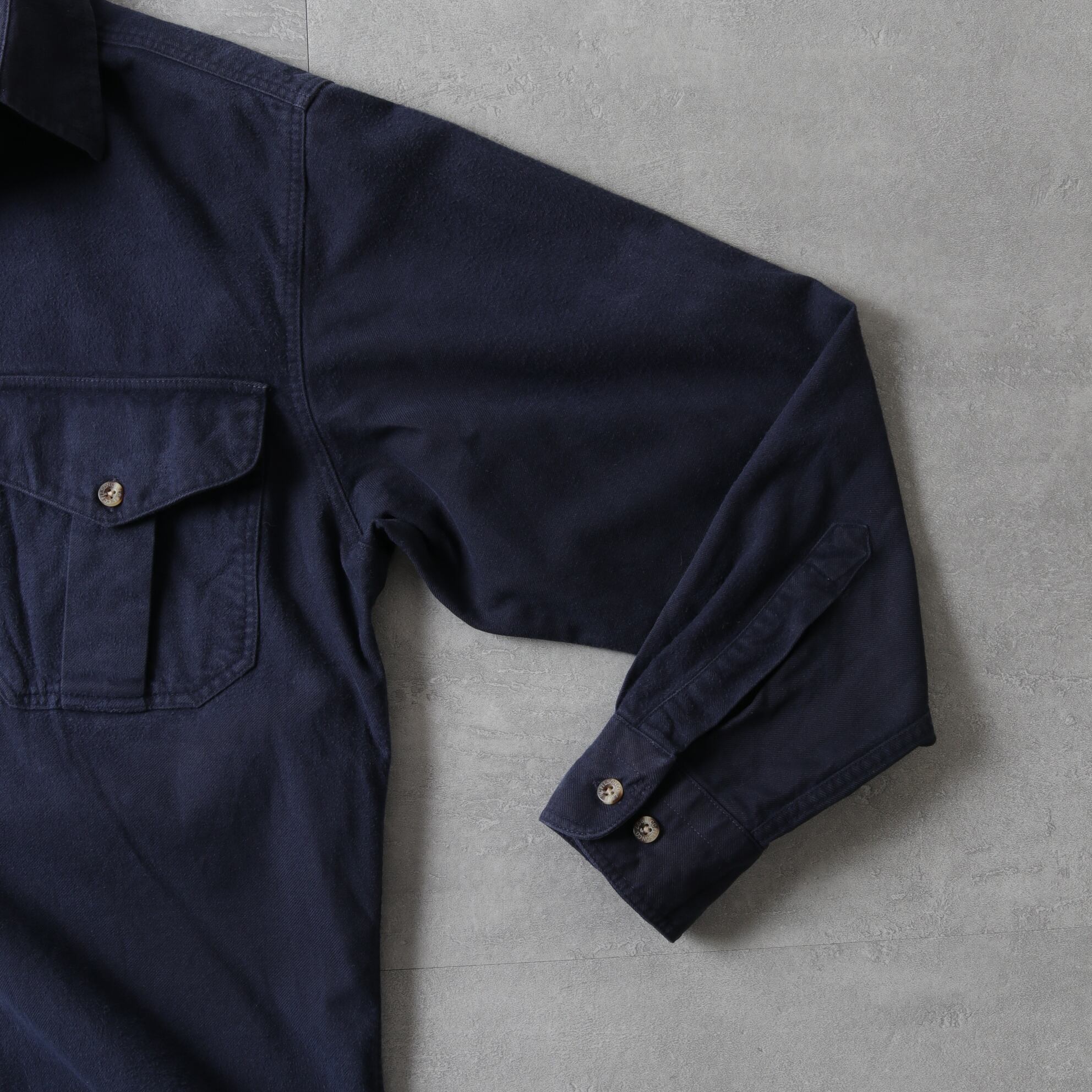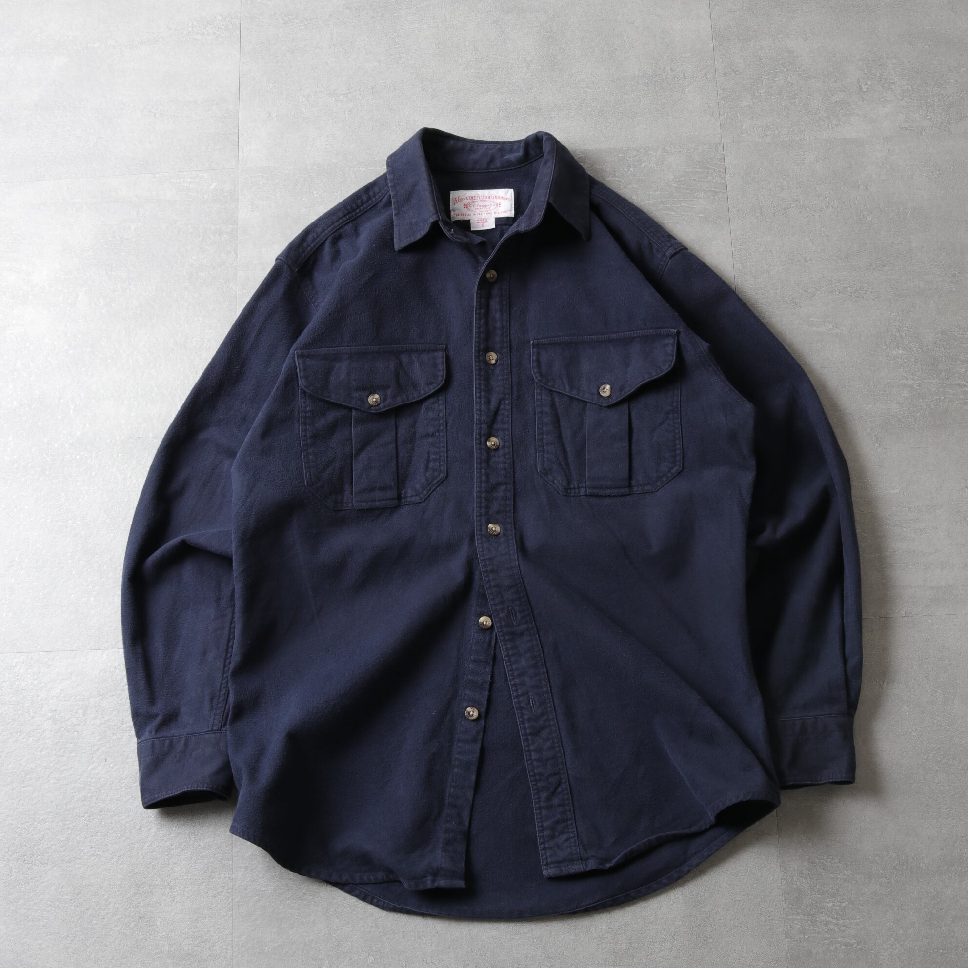 FILSON(フィルソン)より、ネイビーのシャモアクロスシャツ。